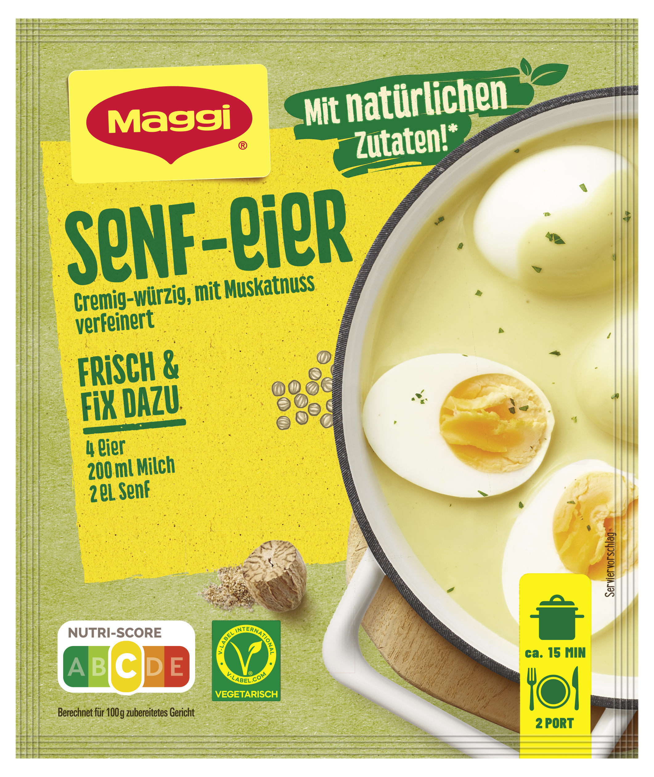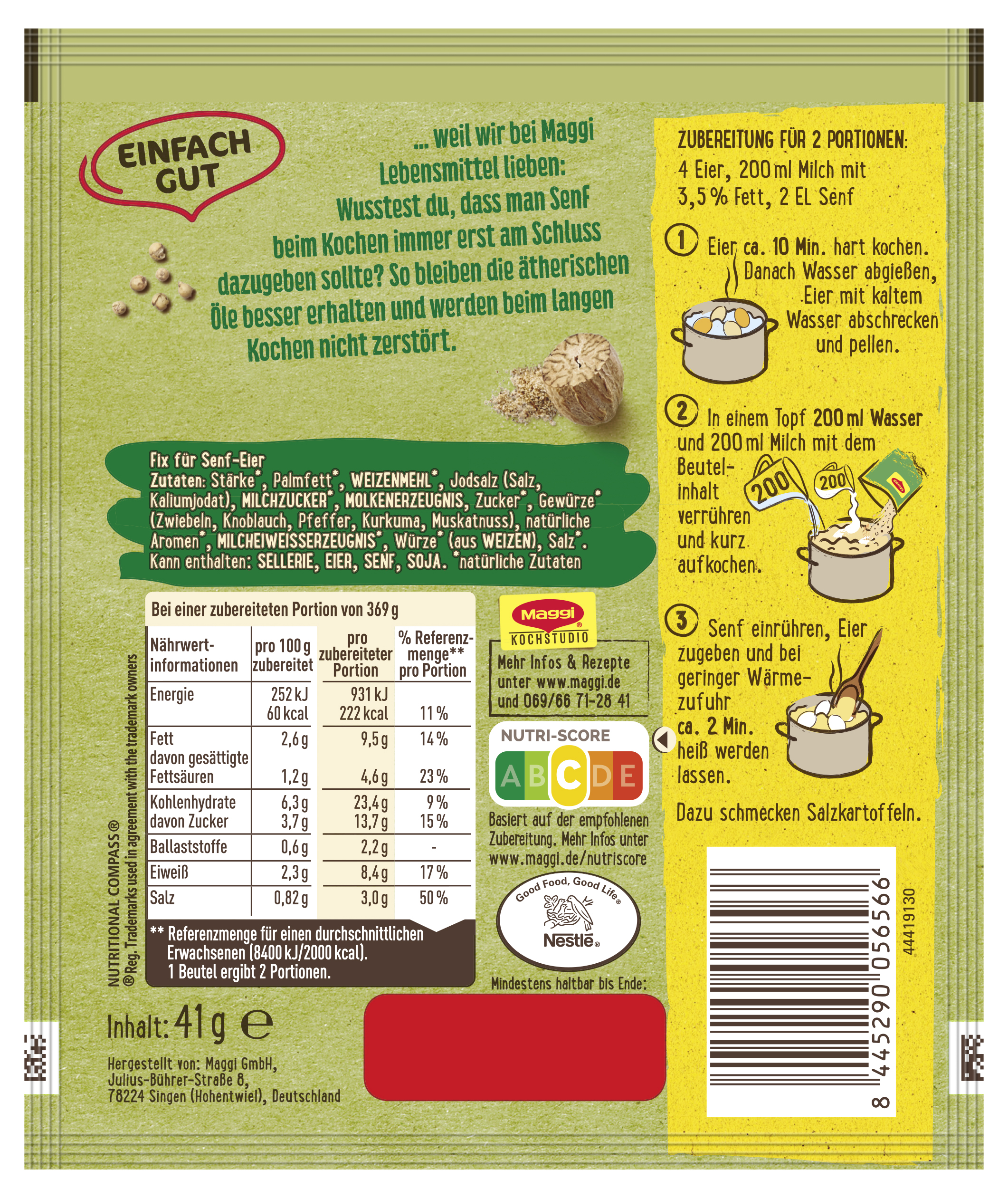 myTime Assortment Yes myTime Article Number 4502073164 myTime Product Title Maggi Fix Senf-Eier EAN 08445290056566 Material Number 12507841 Marke MAGGI Product Name MAGGI FIX Senf-Eier 41g Net Content 41.000 Net Content UoM GRM Net Weight 41 Net Weight UoM GRM Artikel Höhe 150.000 Artikel Höhe UoM MMT Artikel Breite 127.000 Artikel Breite UoM MMT Artikel Länge 10.000 Artikel Länge UoM MMT Schlagwörter Fertigsauce, soße fix, maggie, fertig-sauce, fertig-soße Bezeichnung Fix für Senf-Eier Beschreibung Senf-Eier sind ein echter Klassiker der bodenständigen Küche Sachsen-Anhalts. In ganz Deutschland bekannt und beliebt, mit MAGGI Fix für Senf-Eier im Nu zubereitet, fein gewürzt mit Zwiebeln und Pfeffer. So schnell und unkompliziert lässt sich eine cremig-würzige Senfsauce zaubern. Senf-Eier: gekochte Eier in pikanter Senfsauce – einfach lecker! Mit MAGGI Fix für Senf-Eier lässt sich im Handumdrehen eine schnelle Sauce mit feiner Senfnote für Senf-Eier zubereiten. Mit frischer Milch und Senf. Dank der klaren Zubereitungsanweisung gelingen die Senf-Eier garantiert. Und so geht’s: Die Eier ca. 10 Minuten hart kochen. Danach Wasser abgießen, Eier mit kaltem Wasser abschrecken und pellen. In einem Topf 200ml Wasser und 200ml Milch mit dem Beutelinhalt verrühren und kurz aufkochen. Senf einrühren, Eier zugeben und bei geringer Wärmezufuhr ca. 2 Minuten heiß werden lassen. Dazu gibt’s traditionell Salzkartoffeln. Dieses Produkt hat den Nutri-Score C. Der Nutri-Score wird von den französischen Gesundheitsbehörden berechnet und bewertet den Energiegehalt sowie weniger positive und positive Inhaltsstoffe. Diese Bewertung hilft dir, das Nährwertprofil deiner Lieblingsprodukte auf einen Blick zu erkennen. Die Skala reicht von dunkelgrünem A günstiger bis rotem E weniger günstig. Genieße leckere und einfache Gerichte, die schnell im Alltag zubereitet sind, dank MAGGI! Zubereitung Zubereitung für 2 Portionen: 4 Eier, 200 ml Milch mit 3,5 % Fett, 2 EL Senf 1. Eier ca. 10 Min. hart kochen. Danach Wasser abgießen, Eier mit kaltem Wasser abschrecken und pellen. 2. In einem Topf 200 ml Wasser und 200 ml Milch mit dem Beutelinhalt verrühren und kurz aufkochen. 3. Senf einrühren, Eier zugeben und bei geringer Wärmezufuhr ca. 2 Min. heiß werden lassen. Dazu schmecken Salzkartoffeln. Zutaten Zutaten: Stärke*, Palmfett*, WEIZENMEHL*, Jodsalz (Salz, Kaliumjodat), MILCHZUCKER*, MOLKENERZEUGNIS, Zucker*, Gewürze* (Zwiebeln, Knoblauch, Pfeffer, Kurkuma, Muskatnuss), natürliche Aromen*, MILCHEIWEISSERZEUGNIS*, Würze* (aus WEIZEN), Salz*. Kann enthalten: SELLERIE, EIER, SENF, SOJA. *natürliche Zutaten