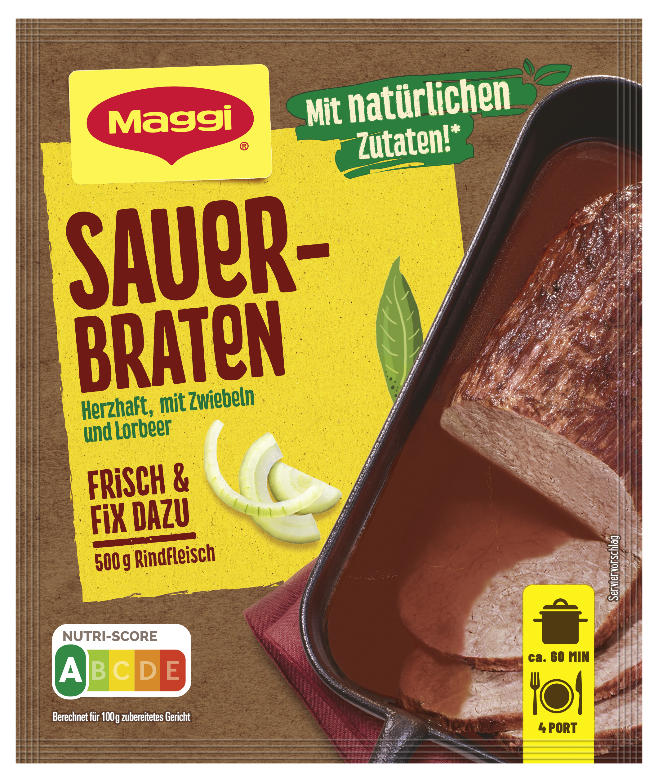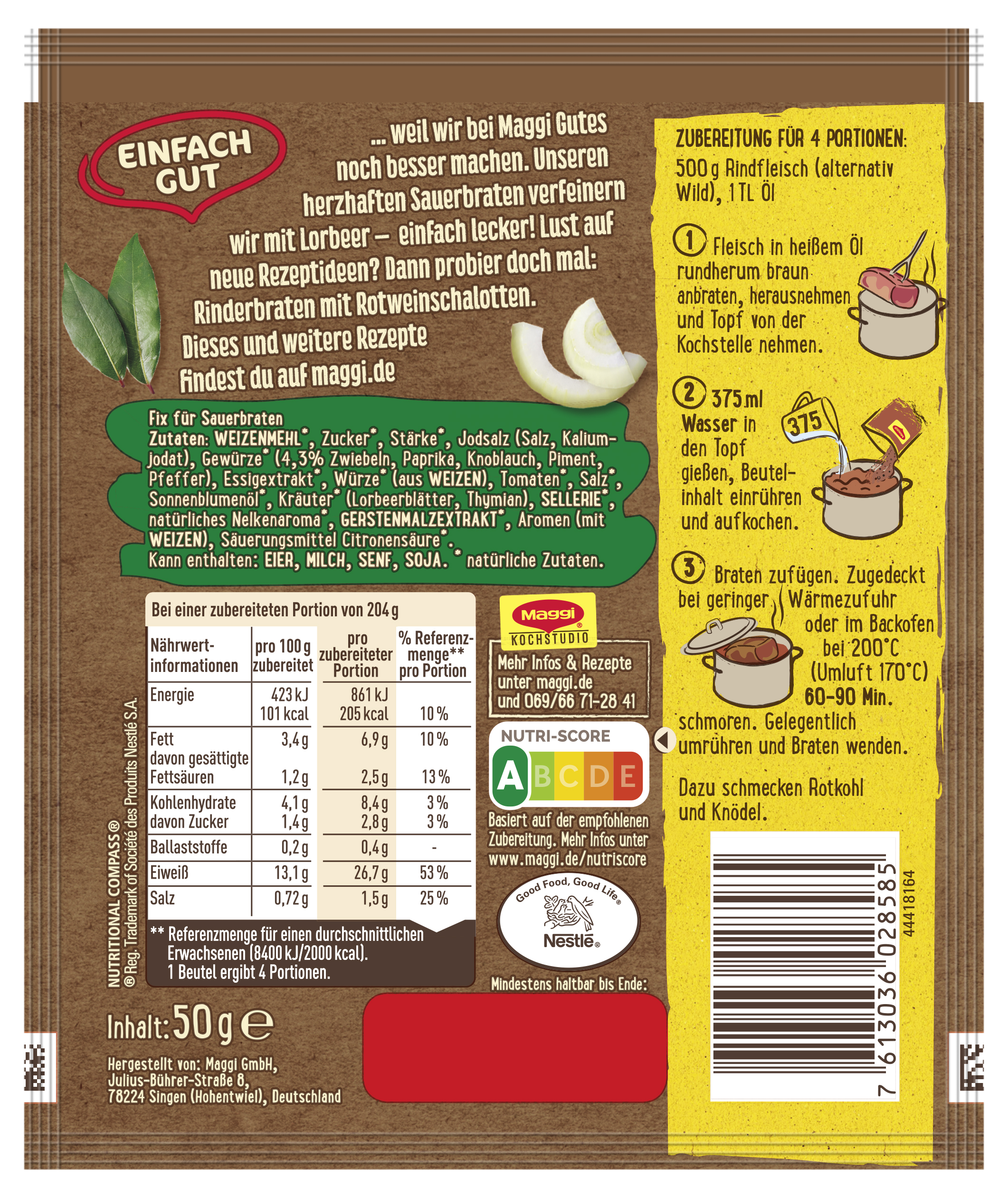 myTime Assortment Yes myTime Article Number 4502070446 myTime Product Title Maggi Fix Fleisch Sauerbraten EAN 07613036028585 Material Number 12334694 Marke MAGGI Product Name MAGGI FIX Fleisch Sauerbraten 50g Net Content 50 Net Content UoM GRM Net Weight 50 Net Weight UoM GRM Artikel Höhe 150.000 Artikel Höhe UoM MMT Artikel Breite 127.000 Artikel Breite UoM MMT Artikel Länge 9.000 Artikel Länge UoM MMT Schlagwörter brat pulver, bratensosse, dunkel, fertig soßen, fertiggericht-e, fleisch, gewürz, für braten, gewürz-mischung, gewürz-paste, soße, sosse, zum braten, maggi fix, tüten, saucenpulver, sauerbraten, gewürzmischung, sossenpulver, soßenpulver, würzmix, würzbasis Bezeichnung Fix für Sauerbraten Beschreibung MAGGI Fix für Sauerbraten: deftiger Braten in fein-säuerlicher Sauce Mit MAGGI Fix für Sauerbraten gelingt frische Hausmannskost schnell und einfach. Das Gewürz mit natürlichen Zutaten* zaubert im Handumdrehen klassischen Geschmack. Ideal für Mittag- oder Abendessen. Geling- und Genussgarantie Die Rezeptur der MAGGI Würzmischung enthält bereits alle Würz-Zutaten, die für einen Sauerbraten benötigt werden. Die sorgfältig ausgewählten Kräuter und Gewürze sind bestens aufeinander abgestimmt und verleihen den frischen Zutaten die perfekte Würzung. Nachwürzen ist so nicht mehr nötig. Somit sind MAGGI Fix-Produkte der ideale Helfer im Alltag, um Gerichte einfach und schnell zuzubereiten. Was wird zusätzlich zum Fix für Sauerbraten benötigt? • 500g Rindfleisch (alternativ Wild) • 1TL Öl Zubereitung: Fleisch in heißem Öl rundherum braun anbraten, herausnehmen und Topf von der Kochstelle nehmen. 375ml Wasser in den Topf gießen, Beutelinhalt einrühren und aufkochen. Braten zufügen. Zugedeckt bei geringer Wärmezufuhr oder im Backofen bei 200°C/Umluft 170°C bei 60-90 Minuten schmoren. Gelegentlich umrühren und Braten wenden. Genießer-Tipp: Rotkohl und Knödel runden die deftige Mahlzeit ideal ab. Zubereitung Zubereitung für 4 Portionen: 500 g Rindfleisch (alternativ Wild), 1 TL Öl 1. Fleisch in heißem Öl rundherum braun anbraten, herausnehmen und Topf von der Kochstelle nehmen. 2. 375 ml Wasser in den Topf gießen, Beutelinhalt einrühren und aufkochen. 3. Braten zufügen. Zugedeckt bei geringer Wärmezufuhr oder im Backofen bei 200°C (Umluft 170°C) 60-90 Min. schmoren. Gelegentlich umrühren und Braten wenden. Dazu schmecken Rotkohl und Knödel. Zutaten Zutaten: WEIZENMEHL*, Zucker*, Stärke*, Jodsalz (Salz, Kaliumjodat), Gewürze* (4,3% Zwiebeln, Paprika, Knoblauch, Piment, Pfeffer), Essigextrakt*, Würze* (aus WEIZEN), Tomaten*, Salz*, Sonnenblumenöl*, Kräuter* (Lorbeerblätter, Thymian), SELLERIE*, natürliches Nelkenaroma*, GERTSENMALZEXTRAKT*, Aromen (mit WEIZEN), Säuerungsmittel Citronensäure*. Kann enthalten: EIER, MILCH, SENF, SOJA. *natürliche Zutaten.