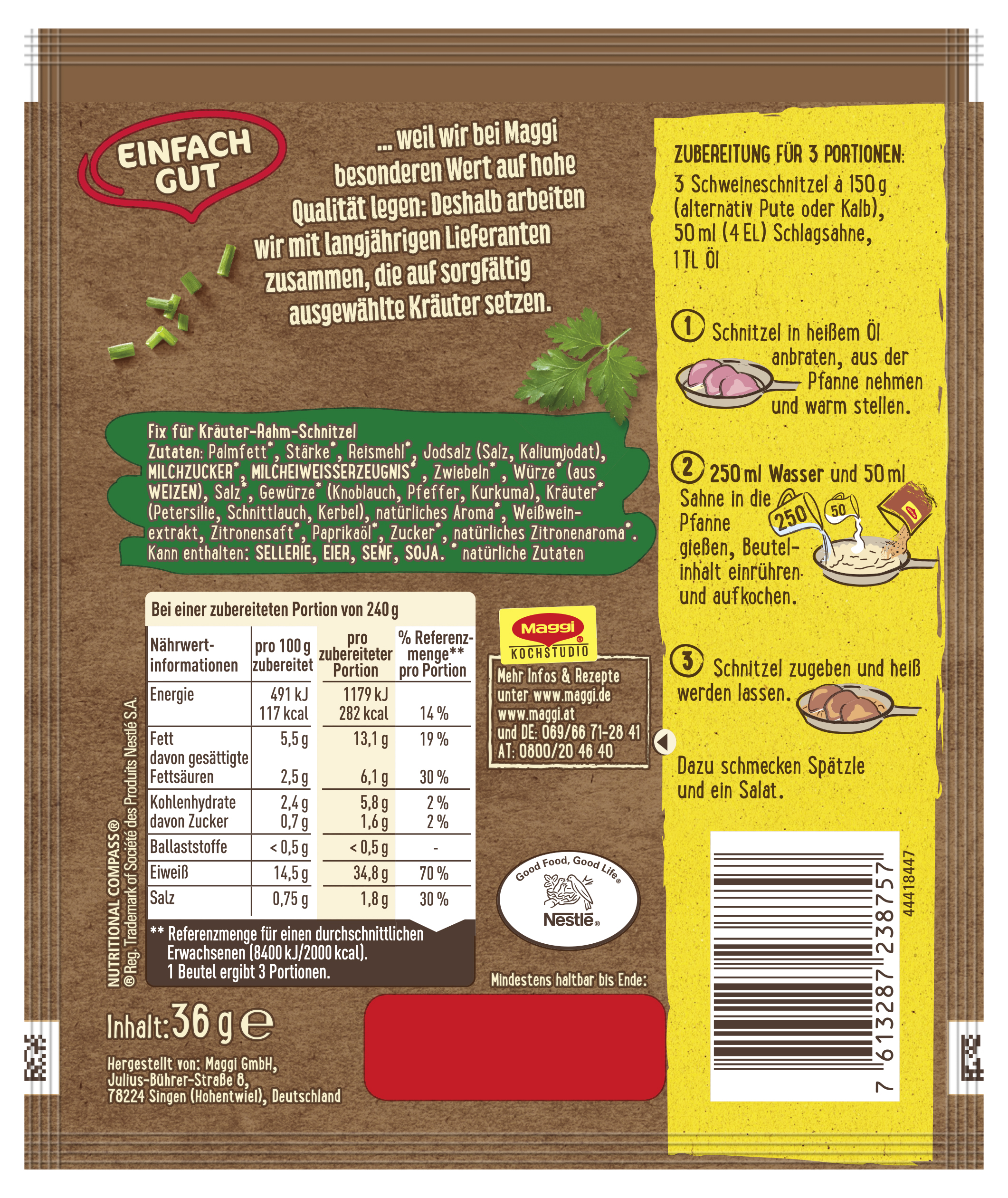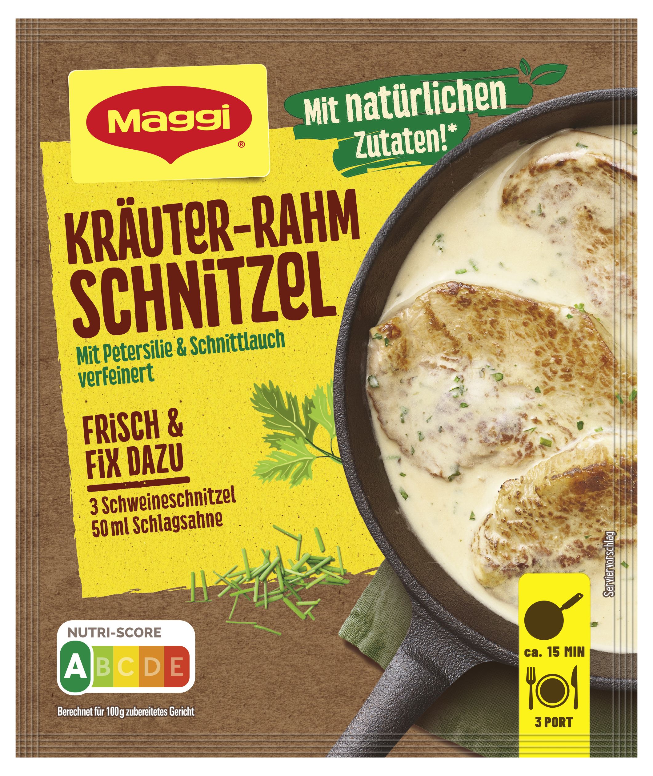 myTime Assortment Yes myTime Article Number 4502070317 myTime Product Title Maggi Fix Kräuter Rahm Schnitzel EAN 07613287238757 Material Number 12466453 Marke MAGGI Product Name MAGGI FIX Kräuter Rahm Schnitzel 36g Net Content 36.000 Net Content UoM GRM Net Weight 36 Net Weight UoM GRM Artikel Höhe 150.000 Artikel Höhe UoM MMT Artikel Breite 127.000 Artikel Breite UoM MMT Artikel Länge 9.000 Artikel Länge UoM MMT Schlagwörter fix, tüten, kochmischung, kräuter soße, hähnchen, puten, geschnetzeltes, rahmsoße, rahmsosse, saucenpulver, soßenpulver, gewürzpaste-n, würzpaste-n, fertigessen, fleisch, würzbasis, würzmix, würzmittel, gewürzmischung, kräuter Bezeichnung Fix für Kräuter-Rahm-Schnitzel Beschreibung Köstliche Kräuter-Rahm Schnitzel mit natürlichen Zutaten, gewürzt und verfeinert mit Petersilie und Schnittlauch: Mit MAGGI im Handumdrehen zubereitet. Ein herzhaftes und einfaches Rahmschnitzel-Rezept, das immer gelingt! Die Rezeptur der MAGGI Würzmischung enthält alle Würz-Zutaten für Kräuter-Rahm Schnitzel. Sorgfältig ausgewählte Kräuter und Gewürze sind perfekt abgestimmt und verleihen den frischen Zutaten die ideale Würzung. Nachwürzen ist nicht nötig. MAGGI Fix-Produkte sind der ideale Helfer im Alltag, um Gerichte einfach und schnell zuzubereiten. Einfach Schnitzel in heißem Öl anbraten, aus der Pfanne nehmen und warm stellen. 250ml Wasser und 50ml Sahne in die Pfanne gießen, Beutelinhalt einrühren und aufkochen. Schnitzel zugeben und heiß werden lassen. Dazu passen Spätzle, Nudeln oder ein Salat hervorragend. Dieses Produkt hat den Nutri-Score A. Der Nutri-Score wird von den französischen Gesundheitsbehörden berechnet und bewertet weniger positive und positive Inhaltsstoffe. Diese Bewertung hilft dir, das Nährwertprofil deiner Lieblingsprodukte auf einen Blick zu erkennen. Die Skala reicht von dunkelgrünem A günstiger bis rotem E weniger günstig. Genieße leckere und einfache Gerichte, die schnell im Alltag zubereitet sind, dank MAGGI! Zubereitung Zubereitung für 3 Portionen: 3 Schweineschnitzel à 150 g (alternativ Pute oder Kalb), 50 ml (4 EL) Schlagsahne, 1 TL Öl 1. Schnitzel in heißem Öl anbraten, aus der Pfanne nehmen und warm stellen. 2. 250 ml Wasser und 50 ml Sahne in die Pfanne gießen, Beutelinhalt einrühren und aufkochen. 3. Schnitzel zugeben und heiß werden lassen. Dazu schmecken Spätzle und ein Salat. Zutaten Zutaten: Palmfett*, Stärke*, Reismehl*, Jodsalz (Salz, Kaliumjodat), MILCHZUCKER*, MILCHEIWEISSERZEUGNIS*, Zwiebeln*, Würze* (aus WEIZEN), Salz*, Gewürze* (Knoblauch, Pfeffer, Kurkuma), Kräuter* (Petersilie, Schnittlauch, Kerbel), natürliches Aroma*, Weißweinextrakt, Zitronensaft*, Paprikaöl*, Zucker*, natürliches Zitronenaroma*. Kann enthalten: SELLERIE, EIER, SENF, SOJA. *natürliche Zutaten