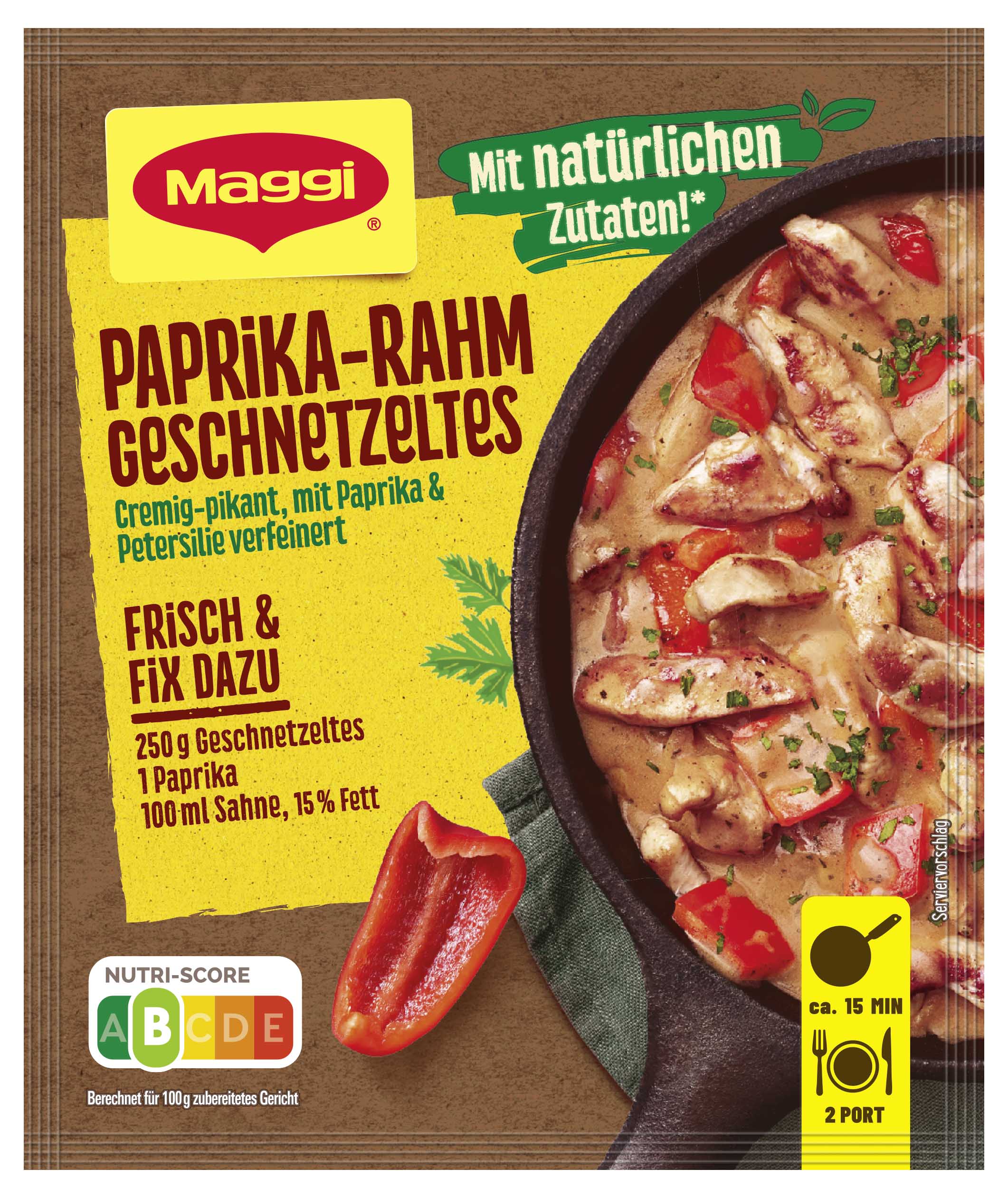 myTime Assortment Yes myTime Article Number 4502072946 myTime Product Title Maggi Fix Paprika Rahm Geschnetzeltes EAN 08445290056740 Material Number 12507842 Marke MAGGI Product Name MAGGI FIX Paprika Rahm Geschnetzeltes 41g Net Content 41.000 Net Content UoM GRM Net Weight 41 Net Weight UoM GRM Artikel Höhe 150.000 Artikel Höhe UoM MMT Artikel Breite 127.000 Artikel Breite UoM MMT Artikel Länge 9.000 Artikel Länge UoM MMT Schlagwörter Fertigsauce, schnelle soße, fertig-sauce, fertig-soße, instant-soße, tüte, beutel, fix-und-frisch, natürlich, verfeinern, fleischgericht, pute, rund, schwein, hähnchen, Fix, sahne Bezeichnung Fix für Geschnetzeltes in Paprika-Rahmsauce Beschreibung Saftiges Hähnchen mit knackiger Paprika in sahniger Rahmsauce – klingt das nicht unwiderstehlich? Mit MAGGI Fix für Paprika-Rahm Geschnetzeltes ist das beliebte Pfannengericht im Handumdrehen zubereitet. Mit frischen Zutaten und einer fein abgestimmten Gewürz- und Kräutermischung. So muss Rahmgeschnetzeltes schmecken! Cremig-pikantes Paprika-Rahm Geschnetzeltes für echte Genießer Lust auf Rahmgeschnetzeltes aber nur wenig Zeit zum Kochen? Kein Problem. Mit MAGGI Fix für Paprika-Rahm Geschnetzeltes ist das pikante Pfannengericht bereits in kurzer Zeit servierfertig. Einfach Paprika in Würfel schneiden und in heißem Öl anbraten. Geschnetzeltes dazugeben und mitbraten. Mit 250ml Wasser ablöschen und 100ml Sahne zugießen, den Beutelinhalt einrühren und aufkochen lassen. Ca. 5 Minuten bei geringer Wärmezufuhr garen, dabei gelegentlich umrühren. Besonders lecker mit Reis. Dieses Produkt hat den Nutri-Score B. Der Nutri-Score wird von den französischen Gesundheitsbehörden berechnet und bewertet den Energiegehalt sowie weniger positive und positive Inhaltsstoffe. Diese Bewertung hilft dir, das Nährwertprofil deiner Lieblingsprodukte auf einen Blick zu erkennen. Die Skala reicht von dunkelgrünem A günstiger bis rotem E weniger günstig. Genieße leckere und einfache Gerichte, die schnell im Alltag zubereitet sind, dank MAGGI! Zubereitung Zubereitung für 2 Portionen: 250 g Hähnchengeschnetzeltes (alternativ Pute), 1 rote Paprika, 100 ml Sahne mit 15 % Fett (alternativ Schlagsahne), 1 TL Öl 1. Paprika in Würfel schneiden, in heißem Öl anbraten. 2. Geschnetzeltes dazugeben und mitbraten. 3. 250 ml Wasser und 100 ml Sahne zugießen, Beutelinhalt einrühren und aufkochen. Ca. 5 Min. bei geringer Wärmezufuhr garen. Gelegentlich umrühren. Dazu schmeckt Reis. Zutaten Zutaten: Stärke*, WEIZENMEHL*, 12,8% Tomaten*, Gewürze* (8,1% Paprika, Zwiebeln, Pfeffer, Knoblauchpulver, Chili), Palmfett*, Jodsalz (Salz, Kaliumjodat), Zucker*, natürliche Aromen*, Kräuter* (Petersilie, Basilikum), MILCHZUCKER*, Würze* (aus WEIZEN), MILCHEIWEISS*, Salz*, Säuerungsmittel Citronensäure*.