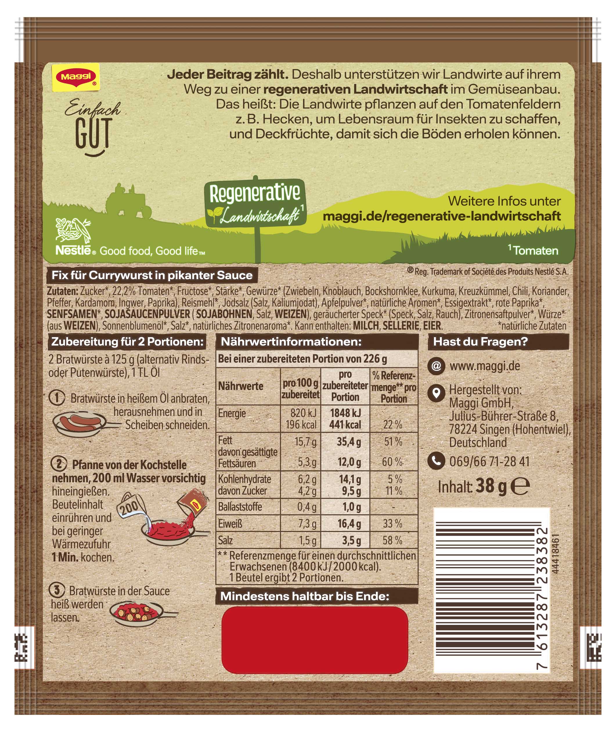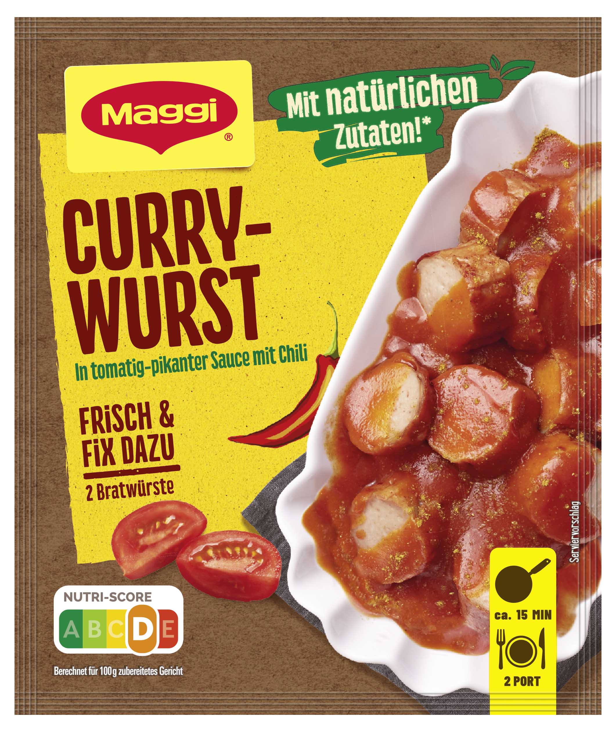 myTime Assortment Yes myTime Article Number 4502070866 myTime Product Title Maggi Fix Currywurst EAN 07613287238382 Material Number 12466460 Marke MAGGI Product Name MAGGI FIX Currywurst 38g Net Content 38.000 Net Content UoM GRM Net Weight 38 Net Weight UoM GRM Artikel Höhe 150.000 Artikel Höhe UoM MMT Artikel Breite 127.000 Artikel Breite UoM MMT Artikel Länge 8.000 Artikel Länge UoM MMT Schlagwörter curruywurstsauce, curry für currywurst, currywurst, fertiggewicht, gewürz, scharf, currywurst soße, fertig soßen, gewürz paste, gewürz-mischung, maggi fix tüten, maggi sauce für currywurst, saucenpulver, soßenpulver, würzbasis, würzmittel, würzmix, chili Bezeichnung Fix für Currywurst in pikanter Sauce Beschreibung Lust auf eine knackige Currywurst in leckerer Sauce? Mit MAGGI Fix für Currywurst gelingt die perfekte Currywurst für zu Hause. Die Sauce ist schnell zubereitet und verleiht deiner Lieblingsbratwurst den würzigen Geschmack von Curry. Genieße Bratwürste in einer tomatig-pikanten Sauce, verfeinert mit Chili. Für diejenigen, die es noch schärfer mögen, empfehlen wir, etwas Chili oder grüne Jalapeños hinzuzufügen. Die Rezeptur der MAGGI Würzmischung enthält alle Würz-Zutaten für eine Currywurst Sauce. Sorgfältig ausgewählte Kräuter und Gewürze sind perfekt abgestimmt und verleihen den frischen Zutaten die ideale Würzung. MAGGI Fix-Produkte sind der ideale Helfer im Alltag, um Gerichte einfach und schnell zuzubereiten. Einfach Bratwürste in heißem Öl anbraten und in Scheiben schneiden. Pfanne von der Kochstelle nehmen, 200 ml Wasser vorsichtig hineingießen. Beutelinhalt einrühren und bei geringer Wärmezufuhr 1 Minute kochen. Bratwürste in der Sauce heiß werden lassen. Dieses Produkt hat den Nutri-Score D. Der Nutri-Score wird von den französischen Gesundheitsbehörden berechnet und bewertet weniger positive und positive Inhaltsstoffe. Diese Bewertung hilft dir, das Nährwertprofil deiner Lieblingsprodukte auf einen Blick zu erkennen. Die Skala reicht von dunkelgrünem A bis rotem E. Genieße leckere und einfache Gerichte, die schnell im Alltag zubereitet sind, dank MAGGI! Zubereitung Zubereitung für 2 Portionen: 2 Bratwürste à 125 g (alternativ Rinds- oder Putenwürste), 1 TL Öl. 1. Bratwürste in heißem Öl anbraten, herausnehmen und in Scheiben schneiden. 2. Pfanne von der Kochstelle nehmen, 200 ml Wasser vorsichtig hineingießen. Beutelinhalt einrühren und bei geringer Wärmezufuhr 1 Min. kochen. 3. Bratwürste in der Sauce heiß werden lassen. Zutaten Zutaten: Zucker*, 22,2% Tomaten*, Fructose*, Stärke*, Gewürze* (Zwiebeln, Knoblauch, Bockshornklee, Kurkuma, Kreuzkümmel, Chili, Koriander, Pfeffer, Kardamom, Ingwer, Paprika), Reismehl*, Jodsalz (Salz, Kaliumjodat), Apfelpulver*, natürliche Aromen*, Essigextrakt*, rote Paprika*, SENFSAMEN*, SOJASAUCENPULVER (SOJABOHNEN, Salz, WEIZEN), geräucherter Speck* (Speck, Salz, Rauch), Zitronensaftpulver*, Würze* (aus WEIZEN), Sonnenblumenöl*, Salz*, natürliches Zitronenaroma*. Kann enthalten: MILCH, SELLERIE, EIER. *natürliche Zutaten