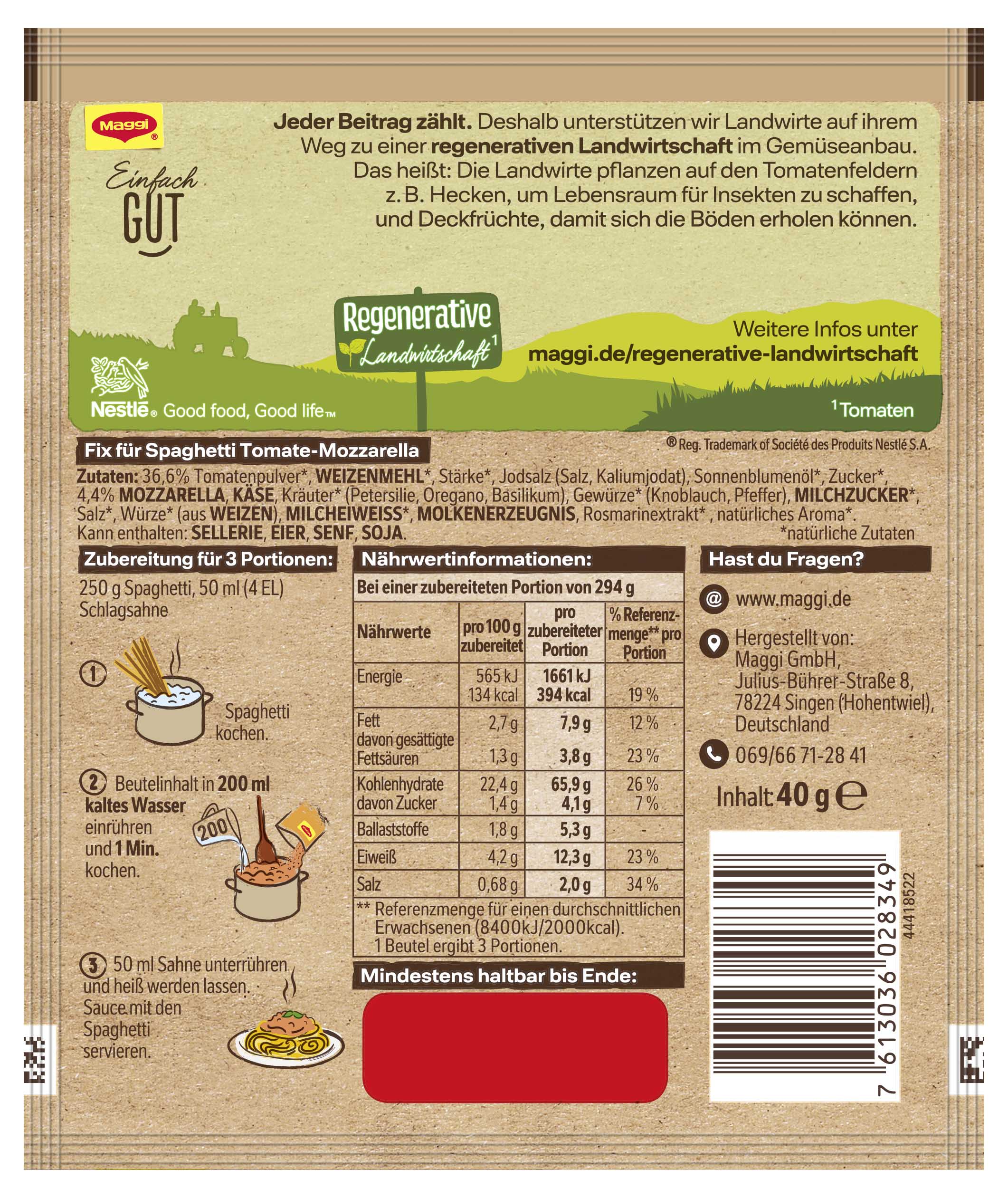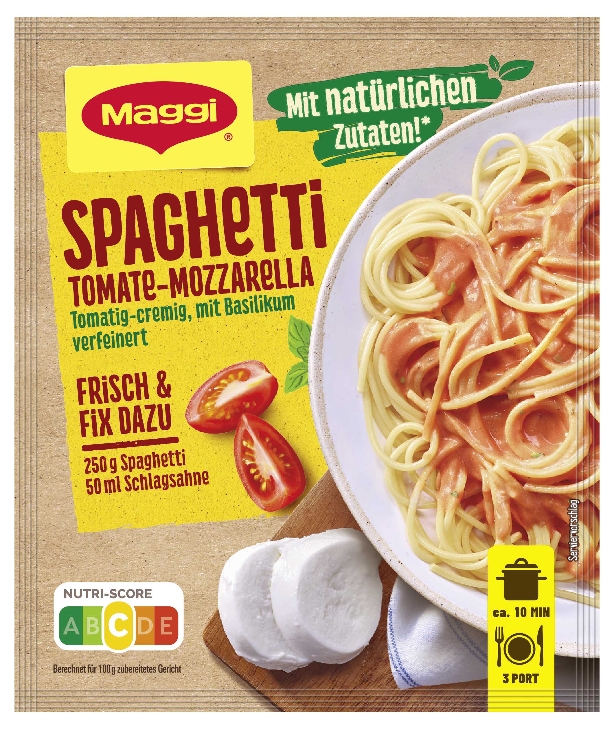myTime Assortment Yes myTime Article Number 4502070321 myTime Product Title Maggi Fix Spaghetti Tomate Mozzarella EAN 07613036028349 Material Number 12334655 Marke MAGGI Product Name MAGGI FIX Spaghetti Tomate Mozzarella 40g Net Content 40 Net Content UoM GRM Net Weight 40 Net Weight UoM GRM Artikel Höhe 150.000 Artikel Höhe UoM MMT Artikel Breite 127.000 Artikel Breite UoM MMT Artikel Länge 9.000 Artikel Länge UoM MMT Schlagwörter tüte-n, fix, soße, nudelsoßen, nudelsoße, nudelsauce-n, nudeln mit soße, sugo, gewürz-e, gewürzpaste, würzpaste-n, fertigessen, würzbasis, würzmix, würzmittel, nudel, gewürz, sauce, pulver, tomatensoße, tomatensauce Bezeichnung Fix für Spaghetti Tomate-Mozzarella Beschreibung MAGGI Fix für Spaghetti Tomate-Mozzarella: tomatig-cremig, mit Basilikum verfeinert Das fruchtig-cremige MAGGI Fix für Spaghetti Tomate-Mozzarella bringt mit sonnengereiften Tomaten und zartschmelzendem Mozzarella nicht nur Liebhaber der italienischen Küche zum Schwärmen. Mit natürlichen Zutaten* - Basilikum und Oregano verleihen der italienischen Sauce besondere Würzung. Geling- und Genussgarantie Die Rezeptur der MAGGI Würzmischung enthält bereits alle Würz-Zutaten, die für eine Tomate-Mozzarella Sauce benötigt werden. Die sorgfältig ausgewählten Kräuter und Gewürze sind bestens aufeinander abgestimmt und verleihen den frischen Zutaten die perfekte Würzung. Nachwürzen ist so nicht mehr nötig. Somit sind MAGGI Fix-Produkte der ideale Helfer im Alltag, um Gerichte einfach und schnell zuzubereiten. Was wird zusätzlich zum Fix für Spaghetti Tomate-Mozzarella benötigt? • 250g Spaghetti • 50ml Schlagsahne Zubereitung: Spaghetti kochen. Beutelinhalt in 200ml kaltes Wasser einrühren und 1 Minute kochen. 50ml Sahne unterrühren und heiß werden lassen. Sauce mit den Spaghetti servieren. Als Beilage schmeckt ein frischer Salat besonders gut. Zubereitung Zubereitung für 3 Portionen: 250 g Spaghetti, 50 ml (4 EL) Schlagsahne 1. Spaghetti kochen. 2. Beutelinhalt in 200 ml kaltes Wasser einrühren und 1 Min. kochen. 3. 50 ml Sahne unterrühren und heiß werden lassen. Sauce mit den Spaghetti servieren. Zutaten Zutaten: 36,6% Tomatenpulver*, WEIZENMEHL*, Stärke*, Jodsalz (Salz, Kaliumjodat), Sonnenblumenöl*, Zucker*, 4,4% MOZZARELLA, KÄSE, Kräuter* (Petersilie, Oregano, Basilikum), Gewürze* (Knoblauch, Pfeffer), MILCHZUCKER*, Salz*, Würze* (aus WEIZEN), MILCHEIWEISS*, MOLKENERZEUGNIS, Rosmarinextrakt*, natürliches Aroma*. Kann enthalten: SELLERIE, EIER, SENF, SOJA. *natürliche Zutaten