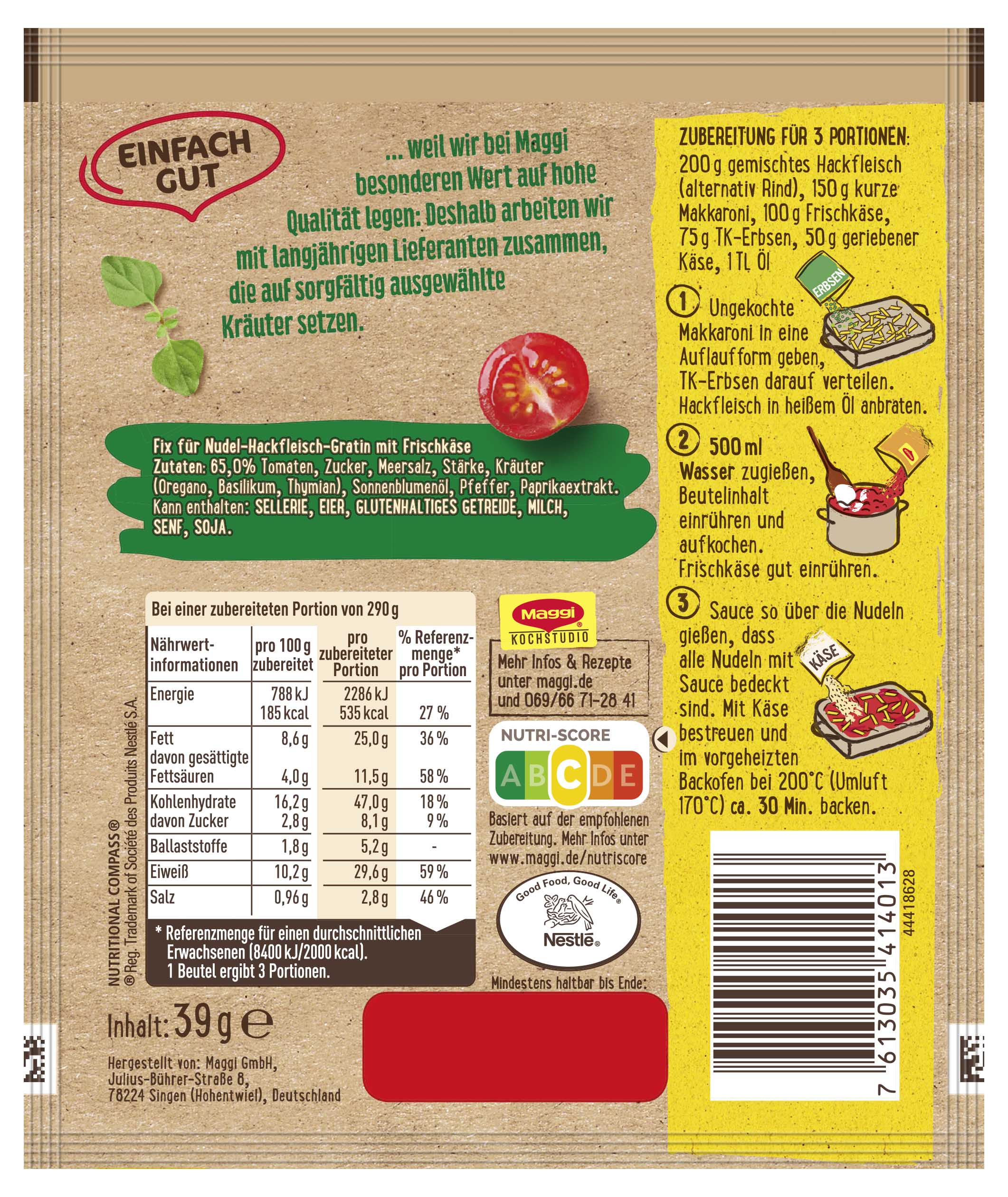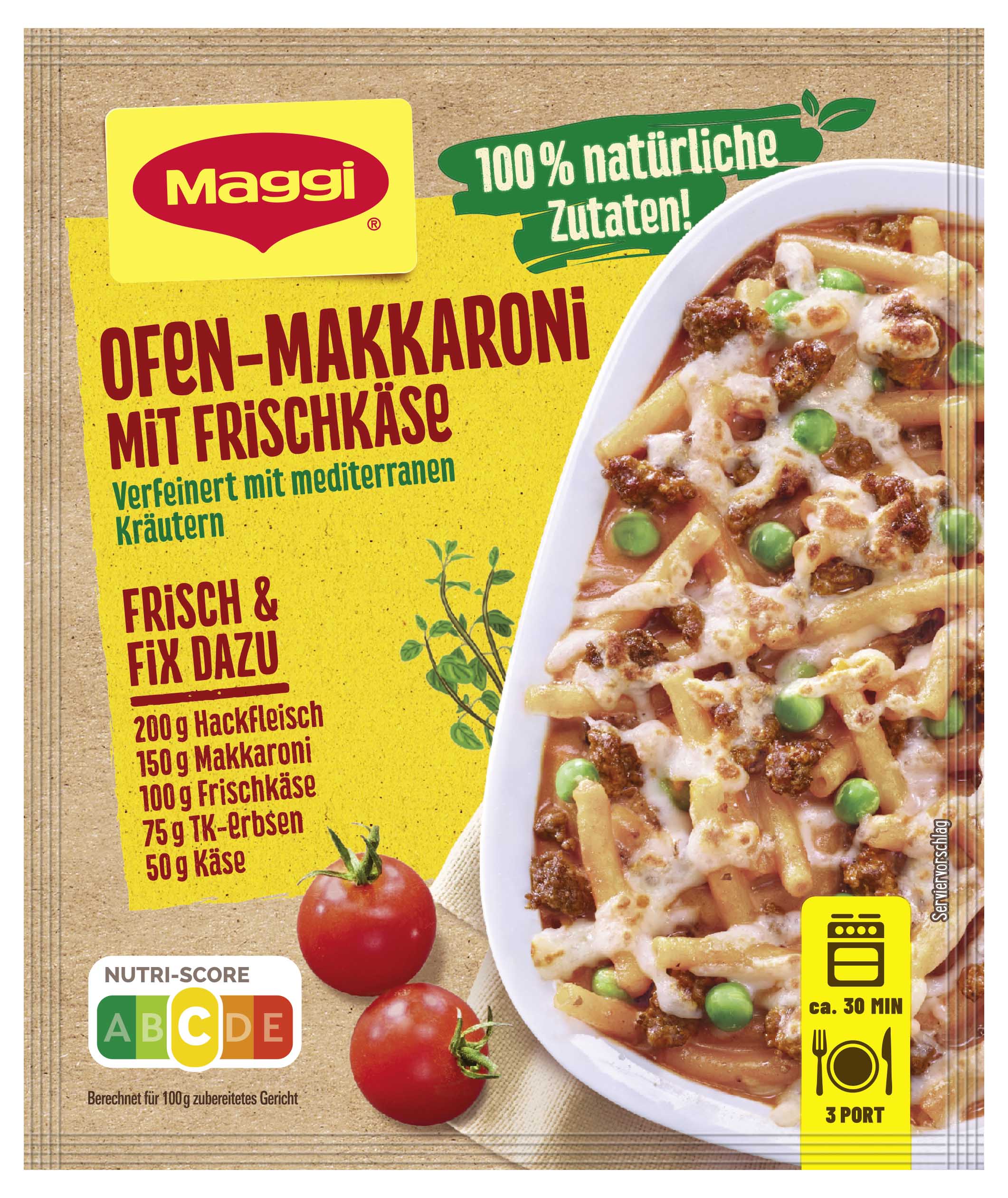 myTime Assortment Yes myTime Article Number 4502070835 myTime Product Title Maggi Fix Ofen Makkaroni Frischkäse EAN 07613035414013 Material Number 12356699 Marke MAGGI Product Name MAGGI FIX Ofen Makkaroni Frischkäse Net Content 39 Net Content UoM GRM Net Weight 39 Net Weight UoM GRM Artikel Höhe 150.000 Artikel Höhe UoM MMT Artikel Breite 127.000 Artikel Breite UoM MMT Artikel Länge 9.000 Artikel Länge UoM MMT Schlagwörter gewürz-mischung, fix, tüten, gewürzpaste, würzpaste-n, fertigessen, würzbasis, würzmix, würzmittel, fertiggericht-e, soßenpulver, fix, instant, gericht, wuerzpaste, italien, italienisch, kräuter, mediterran, makkaroni, gewürz, dinkel, cheese, käse, vollkorn Bezeichnung Fix für Nudel-Hackfleisch-Gratin mit Frischkäse Beschreibung Mit MAGGI Fix für Ofen-Makkaroni mit Frischkäse kannst du im Handumdrehen einen cremigen Nudelauflauf mit Hackfleisch, Pasta-Sauce mit Frischkäse und Erbsen zubereiten. Die Würzmischung enthält bereits alle notwendigen Zutaten, einschließlich mediterraner Kräuter wie Oregano, Basilikum und Thymian, um dem Gericht eine feine Würzung zu verleihen. Du benötigst zusätzlich 200g gemischtes Hackfleisch (alternativ Rind), 150g kurze Makkaroni, 100g Frischkäse, 75g TK-Erbsen, 50g geriebenen Käse und 1TL Öl. Die Zubereitung umfasst das Anbraten des Hackfleischs, das Hinzufügen von Wasser und der Würzmischung, das Einrühren des Frischkäses, das Verteilen der ungekochten Makkaroni und der Erbsen in einer Auflaufform, das Übergießen mit der Sauce, das Bestreuen mit Käse und das Backen im vorgeheizten Backofen bei 200°C für ca. 30 Minuten. Das Produkt hat den Nutri-Score C. Zubereitung Zubereitung für 3 Portionen: 200 g gemischtes Hackfleisch (alternativ Rind), 150 g kurze Makkaroni, 100 g Frischkäse, 75 g TK-Erbsen, 50 g geriebener Käse, 1 TL Öl 1. Ungekochte Makkaroni in eine Auflaufform geben, TK-Erbsen darauf verteilen. Hackfleisch in heißem Öl anbraten. 2. 500 ml Wasser zugießen, Beutelinhalt einrühren und aufkochen. Frischkäse gut einrühren. 3. Sauce so über die Nudeln gießen, dass alle Nudeln mit Sauce bedeckt sind. Mit Käse bestreuen und im vorgeheizten Backofen bei 200°C (Umluft 170°C) ca. 30 Min. backen. Zutaten Zutaten: 65,0% Tomaten, Zucker, Meersalz, Stärke, Kräuter (Oregano, Basilikum, Thymian), Sonnenblumenöl, Pfeffer, Paprikaextrakt. Kann enthalten: SELLERIE, EIER, GLUTENHALTIGES GETREIDE, MILCH, SENF, SOJA.