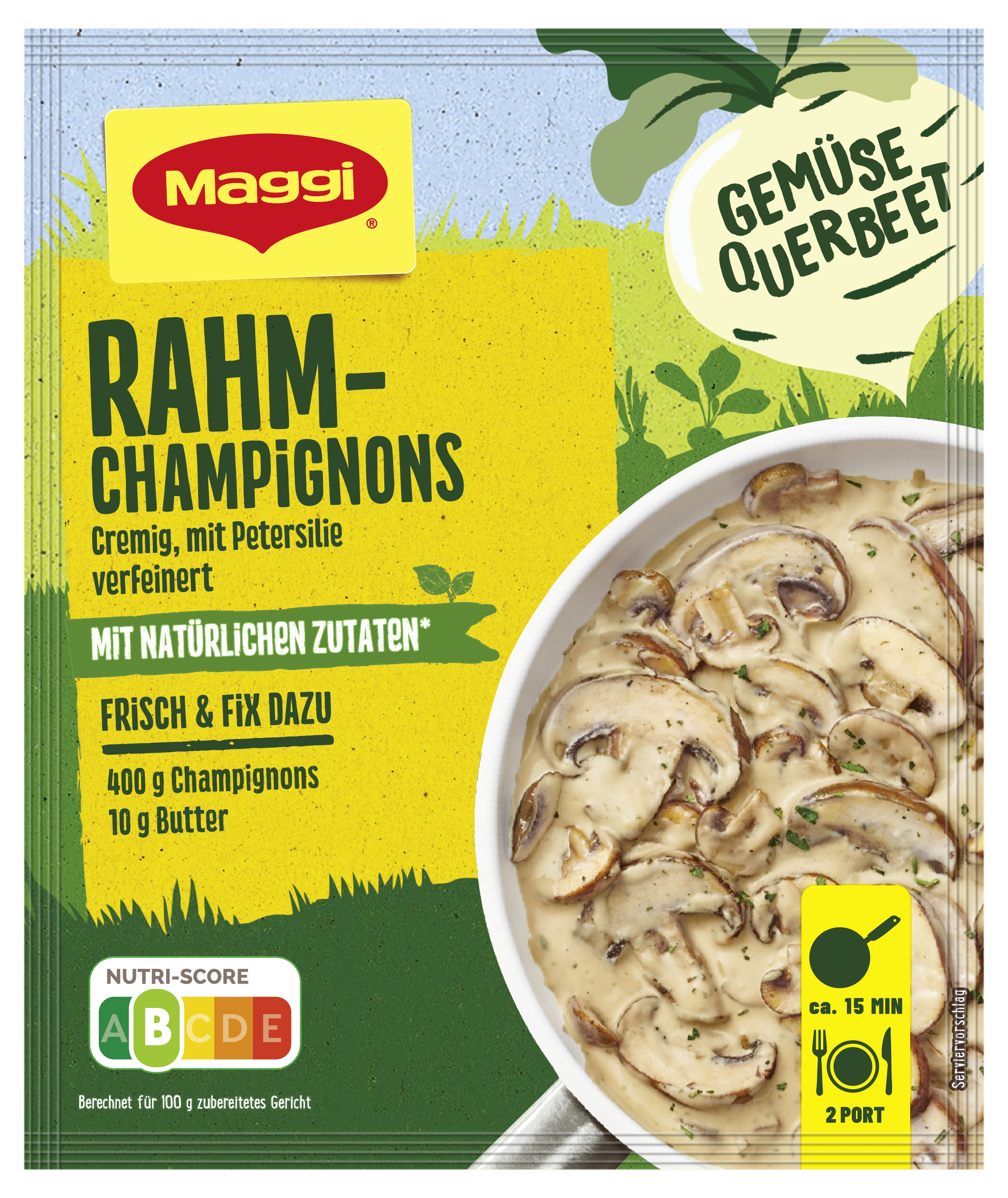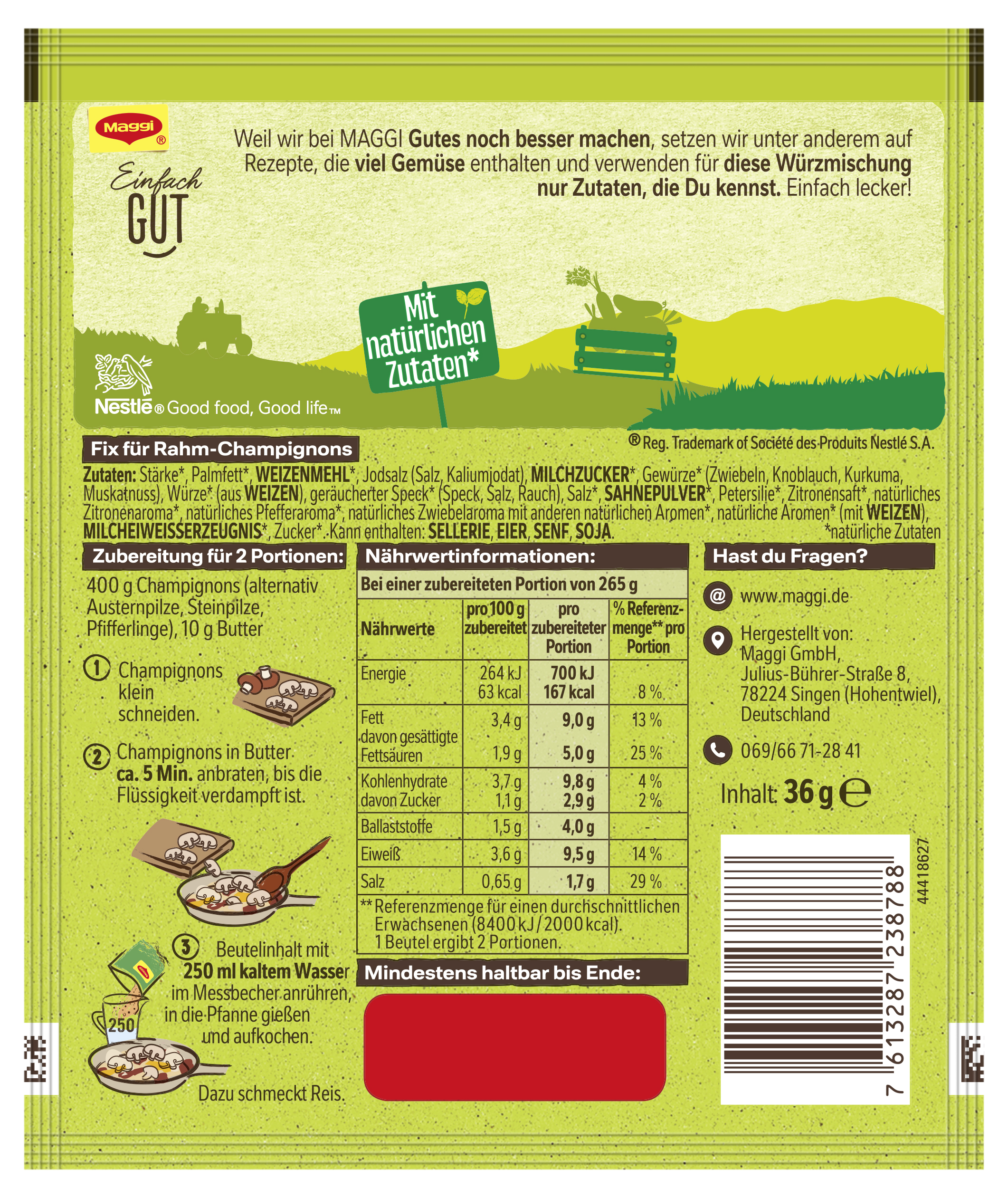 myTime Assortment Yes myTime Article Number 4502070310 myTime Product Title Maggi Fix Rahm Champignons EAN 07613287238788 Material Number 12466451 Marke MAGGI Product Name MAGGI FIX Rahm Champignons 36g Net Content 36.000 Net Content UoM GRM Net Weight 36 Net Weight UoM GRM Artikel Höhe 150.000 Artikel Höhe UoM MMT Artikel Breite 127.000 Artikel Breite UoM MMT Artikel Länge 9.000 Artikel Länge UoM MMT Schlagwörter fix, tüten, kochmischung, soßenpulver, gewürzpaste-n, würzpaste-n, fertigessen, würzbasis, würzmix, würzmittel, gewürz-mischung, fix gewürz, rahm sauce, rahmsosse, rahmsoßengewürz, rahmsoße, saucenpulver, mushroom sauce, wurzpaste, wuerzpaste Bezeichnung Fix für Rahm-Champignons Beschreibung Wer Champignons in Rahmsauce mag und den würzigen Pilz-Geschmack sowie die feine Petersilien-Note liebt, sollte unbedingt MAGGI Fix für Rahm-Champignons ausprobieren. Lecker cremig mit natürlichen Zutaten gelingt die Pilzsauce im Handumdrehen. Ein unschlagbar leckeres Trio sind Champignons in Rahmsauce mit Reis serviert. Sorgfältig ausgewählte Kräuter und Gewürze sind perfekt abgestimmt und verleihen den frischen Zutaten die ideale Würzung. Nachwürzen ist nicht nötig. MAGGI Fix-Produkte sind der ideale Helfer im Alltag, um Gerichte einfach und schnell zuzubereiten. Einfach 300g Champignons alternativ Austernpilze, Steinpilze, Pfifferlinge klein schneiden. Champignons in 10g Butter ca. 5 Minuten anbraten, bis die Flüssigkeit verdampft ist. Beutelinhalt mit 250ml kaltem Wasser im Messbecher anrühren, in die Pfanne gießen und aufkochen. Das Pfannengericht schmeckt besonders lecker zu Reis. Dieses Produkt hat den Nutri-Score B. Der Nutri-Score wird von den französischen Gesundheitsbehörden berechnet und bewertet weniger positive und positive Inhaltsstoffe. Diese Bewertung hilft dir, das Nährwertprofil deiner Lieblingsprodukte auf einen Blick zu erkennen. Die Skala reicht von dunkelgrünem A günstiger bis rotem E weniger günstig. Genieße leckere und einfache Gerichte, die schnell im Alltag zubereitet sind, dank MAGGI! Zubereitung Zubereitung für 2 Portionen: 400 g Champignons (alternativ Austernpilze, Steinpilze, Pfifferlinge), 10 g Butter 1. Champignons klein schneiden. 2. Champignons in Butter ca. 5 Min. anbraten, bis die Flüssigkeit verdampft ist. 3. Beutelinhalt mit 250ml kaltem Wasser im Messbecher anrühren, in die Pfanne gießen und aufkochen. Dazu schmeckt Reis. Zutaten Zutaten: Stärke*, Palmfett*, WEIZENMEHL*, Jodsalz (Salz, Kaliumjodat), MILCHZUCKER*, Gewürze* (Zwiebeln, Knoblauch, Kurkuma, Muskatnuss), Würze* (aus WEIZEN), geräucherter Speck* (Speck, Salz, Rauch), Salz*, SAHNEPULVER*, Petersilie*, Zitronensaft*, natürliches Zitronenaroma*, natürliches Pfefferaroma*, natürliches Zwiebelaroma mit anderen natürlichen Aromen*, natürliche Aromen* (mit WEIZEN), MILCHEIWEISSERZEUGNIS*, Zucker*. Kann enthalten: SELLERIE, EIER, SENF, SOJA. *natürliche Zutaten