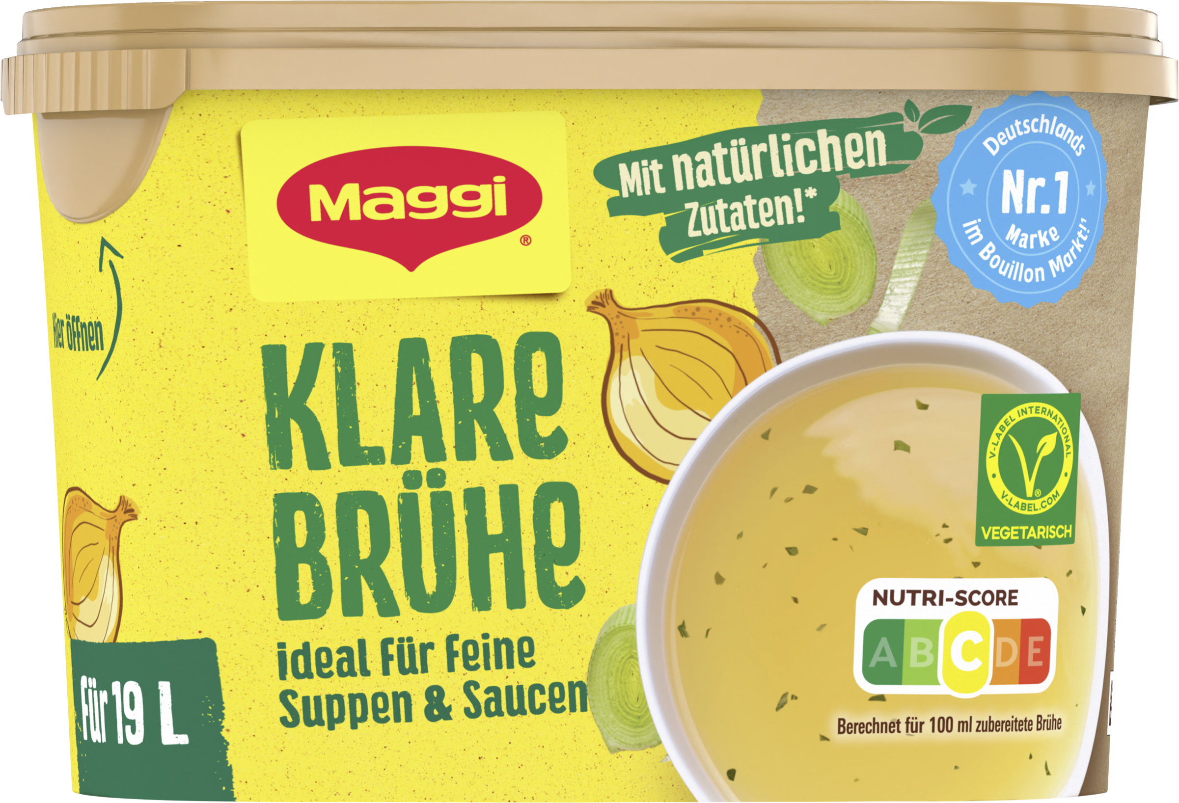 myTime Assortment Yes myTime Article Number 4502073184 myTime Product Title Maggi Klare Brühe EAN 07613287094339 Material Number 12456607 Marke MAGGI Product Name MAGGI Klare Brühe Dose 266g, ergibt 19 Liter Net Content 19 Net Content UoM LTR Net Weight 266 Net Weight UoM GRM Artikel Höhe 86.000 Artikel Höhe UoM MMT Artikel Breite 132.000 Artikel Breite UoM MMT Artikel Länge 65.000 Artikel Länge UoM MMT Schlagwörter brühwürfel, broth, gemüse-bouillon, pur, gemüsebrühe, salzarm, gemüsepaste, gewürzpaste, suppenwürfel, gemüsebrühe, fertig, suppenpulver, suppengewürz, würzpulver, vegetarische, klare suppe, gemüsesuppe, pulver, gemüse-pulver, suppenwürze, fertigsuppe Bezeichnung Klare Brühe mit 42,9% Würzmischung Beschreibung Die MAGGI Klare Brühe ist ein unverzichtbarer Bestandteil in jedem Küchenschrank. Sie wird mit guten Zutaten liebevoll hergestellt und überzeugt mit einer besonderen Gewürzmischung und einem unverwechselbaren, feinwürzigen Geschmack. Die Klare Brühe im Glas ist schnell löslich und kann individuell dosiert werden. Ein Glas reicht für 19 Liter Brühe, was sehr ergiebig ist. Die Klare Brühe von MAGGI ist vielseitig einsetzbar. Sie eignet sich als Grundlage für kräftige Suppen, Cremesuppen, zum Abschmecken von selbstgemachtem Kartoffelsalat und zum Würzen und Verfeinern von Dressings, Pfannengerichten, pikanten Saucen, Eintöpfen und vegetarischen Rezepten. Sogar Beilagen wie Reis, Couscous oder Quinoa können mit der Klaren Brühe gekocht werden. Die Zubereitung der Klaren Brühe ist unkompliziert und schnell. Einfach einen halben Teelöffel MAGGI Klare Brühe in 150ml kochendes Wasser geben oder je nach Bedarf direkt beim Kochen zum Abrunden der Gerichte hinzufügen. Mit der Klaren Brühe von MAGGI kann man im Handumdrehen eine leckere feine Suppe oder Sauce zaubern. Auch Beilagen wie Reis, Couscous oder Quinoa erhalten durch die Klare Brühe eine köstliche Würze. Zubereitung So einfach geht’s: 1/2 TL in 150 ml kochendes Wasser dazugeben. Tipp: nach Belieben beim Kochen dazugeben. Zutaten Zutaten: Jodsalz (Salz, Kaliumjodat), natürliche Aromen*, Stärke*, Würze* (aus WEIZEN), Salz*, Zucker*, Gewürze* (Zwiebeln, Muskatnuss, Pfeffer), 1,0% Lauch*, Karotten*, Sonnenblumenöl*, natürliches SELLERIEAROMA*.