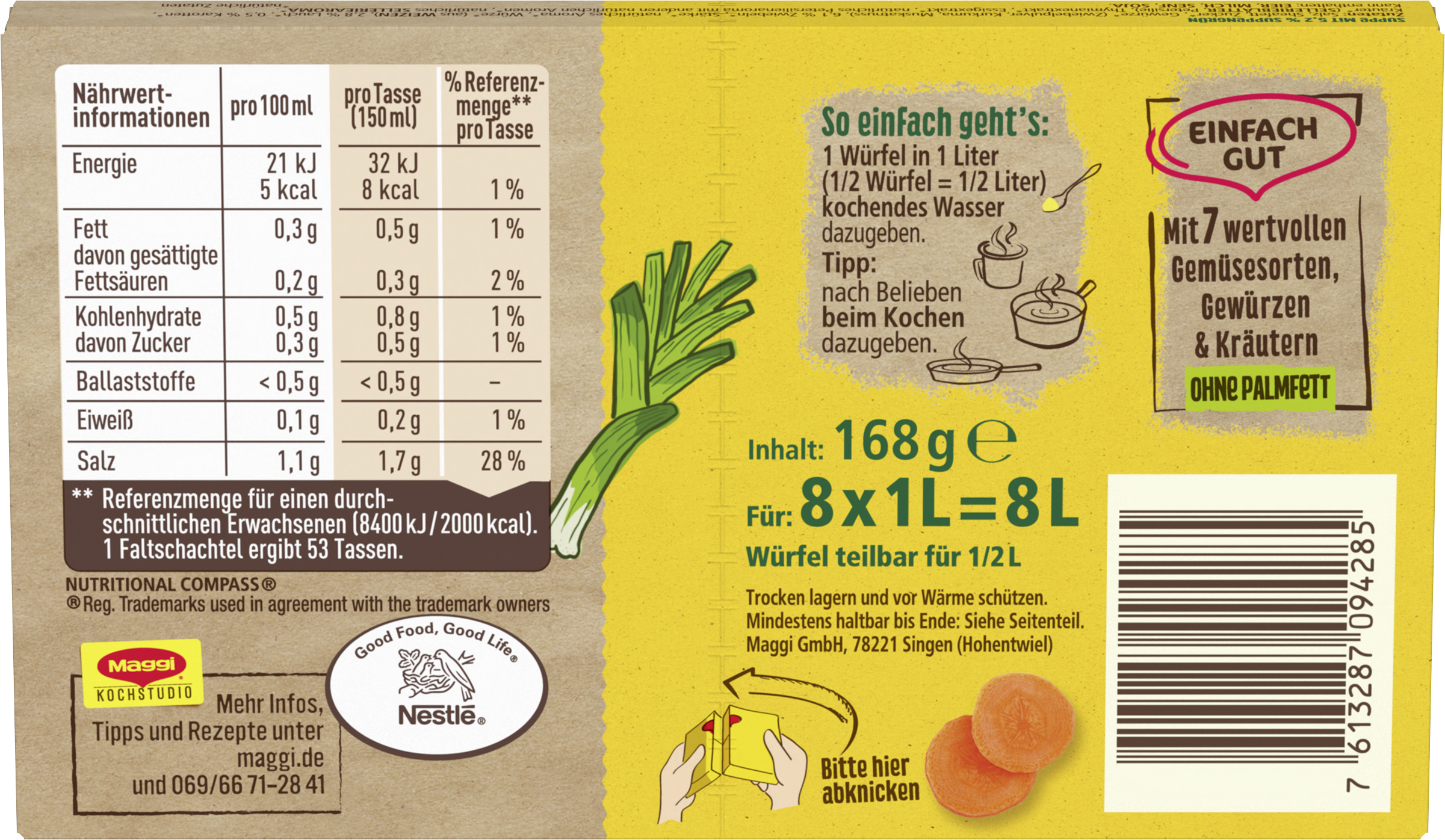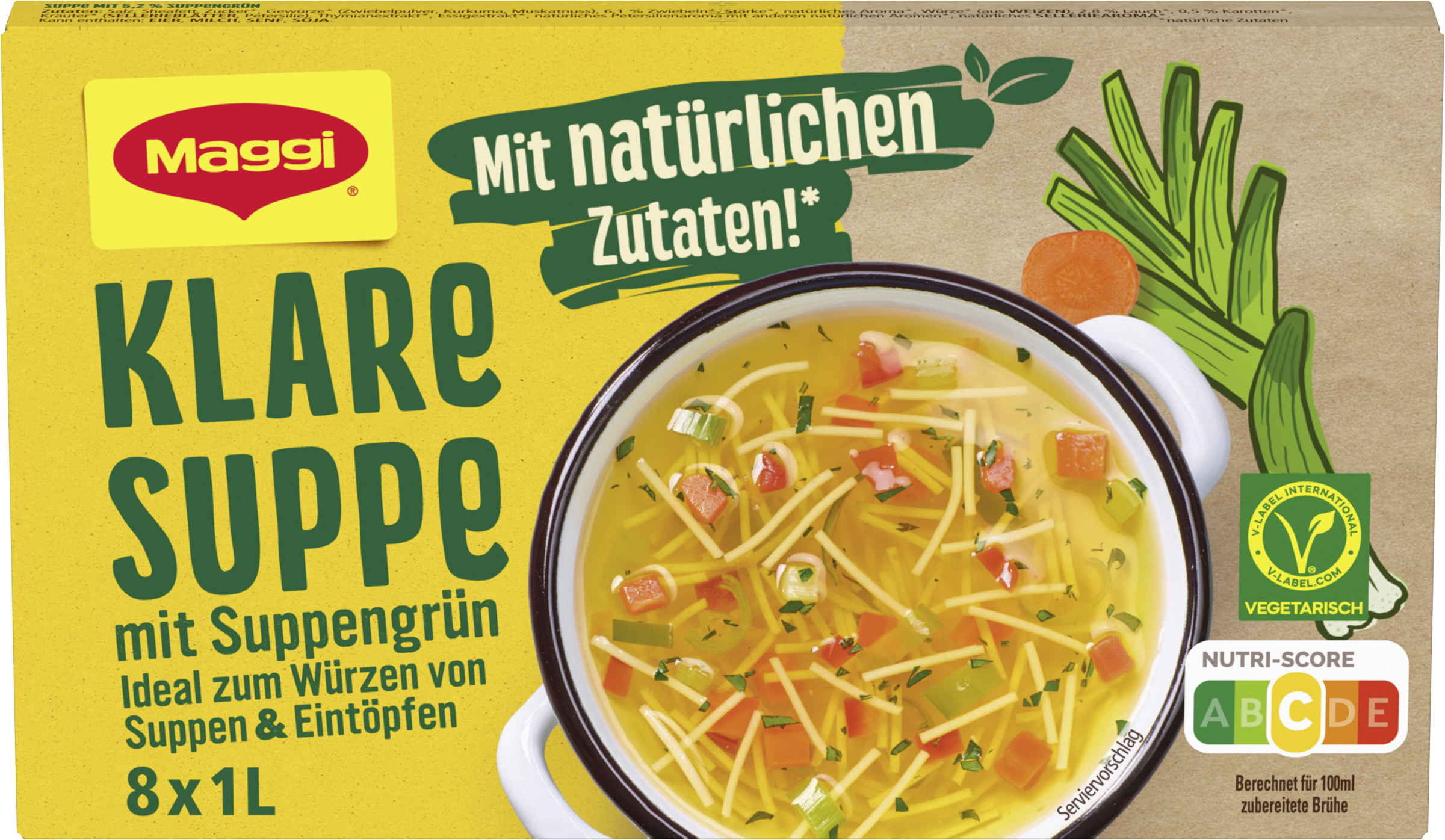 myTime Assortment Yes myTime Article Number 4502070368 myTime Product Title Maggi Klare Suppe mit Suppengrün EAN 07613287094285 Material Number 12456605 Marke MAGGI Product Name MAGGI Klare Suppe mit Suppengrün Faltschachtel 168g, ergibt 8x1L Net Content Statement 8x1L Net Content 8.0 Net Content UoM LTR Net Weight 168 Net Weight UoM GRM Artikel Höhe 91.000 Artikel Höhe UoM MMT Artikel Breite 153.000 Artikel Breite UoM MMT Artikel Länge 13.000 Artikel Länge UoM MMT Schlagwörter brühwürfel, broth, gemüse-bouillon, pur, gemüsebrühe, salzarm, gemüsepaste, gewürzpaste, suppenwürfel, gemüsebrühe, fertig, suppenpulver, suppengewürz, gemüsesuppe, pulver, gemüse-pulver, instant-brühe, suppenwürze, fertigsuppe, klare suppe, klare brühe Bezeichnung Suppe mit 5,3% Suppengrün Beschreibung Die MAGGI Klare Suppe mit Suppengrün zeichnet sich durch viel Gemüse, einen vollmundigen Geschmack und eine besondere, individuelle Würzmischung aus. Sorgfältig ausgewähltes Suppengrün wie Zwiebeln, Karotten, Lauch und Tomaten, feine Kräuter wie Petersilie und Lorbeer sowie perfekt aufeinander abgestimmte Gewürze sorgen für einen unvergleichlich leckeren, kräutrigen und gemüsigen Geschmack. Die MAGGI Klare Suppe mit Suppengrün ist ein universeller Küchenhelfer und vielseitig einsetzbar. Sie eignet sich als Basis für Gemüsesuppen, Eintöpfe, Aufläufe, selbstgemachte Saucen, Risottos, Pfannengerichte oder Salatdressings. Auch Beilagen wie Nudeln, Reis, Couscous oder Bulgur erhalten durch die Gemüsebouillon die richtige Würze. Die Zubereitung einer klaren Gemüsesuppe ist schnell und einfach. Eine Faltschachtel der MAGGI Klare Suppe mit Suppengrün reicht für 8 Liter würzige Suppe. Einfach einen Würfel in 1 Liter kochendes Wasser geben oder je nach Bedarf zum Würzen direkt beim Kochen hinzufügen. Zubereitung So einfach geht’s: 1 Würfel in 1 Liter (1/2 Würfel = 1/2 Liter) kochendes Wasser dazugeben. Tipp: nach Belieben beim Kochen dazugeben. Zutaten Zutaten: Salz, Sheafett, Zucker*, Gewürze* (Zwiebelpulver, Kurkuma, Muskatnuss), 6,1% Zwiebeln*, Stärke*, natürliches Aroma*, Würze* (aus WEIZEN), 2,8 % Lauch*, 0,5% Karotten*, Kräuter* (SELLERIEBLÄTTER, Petersilie), Thymianextrakt*, Essigextrakt*, natürliches Petersilienaroma mit anderen natürlichen Aromen*, natürliches SELLERIEAROMA*.