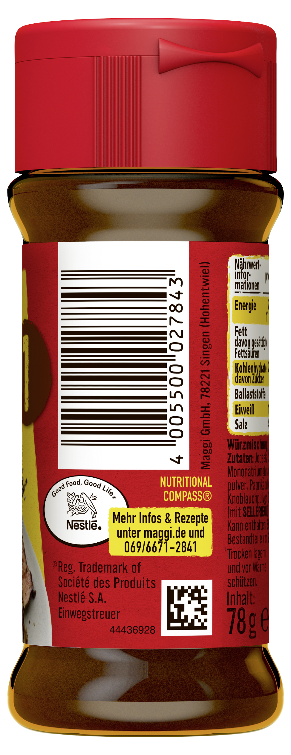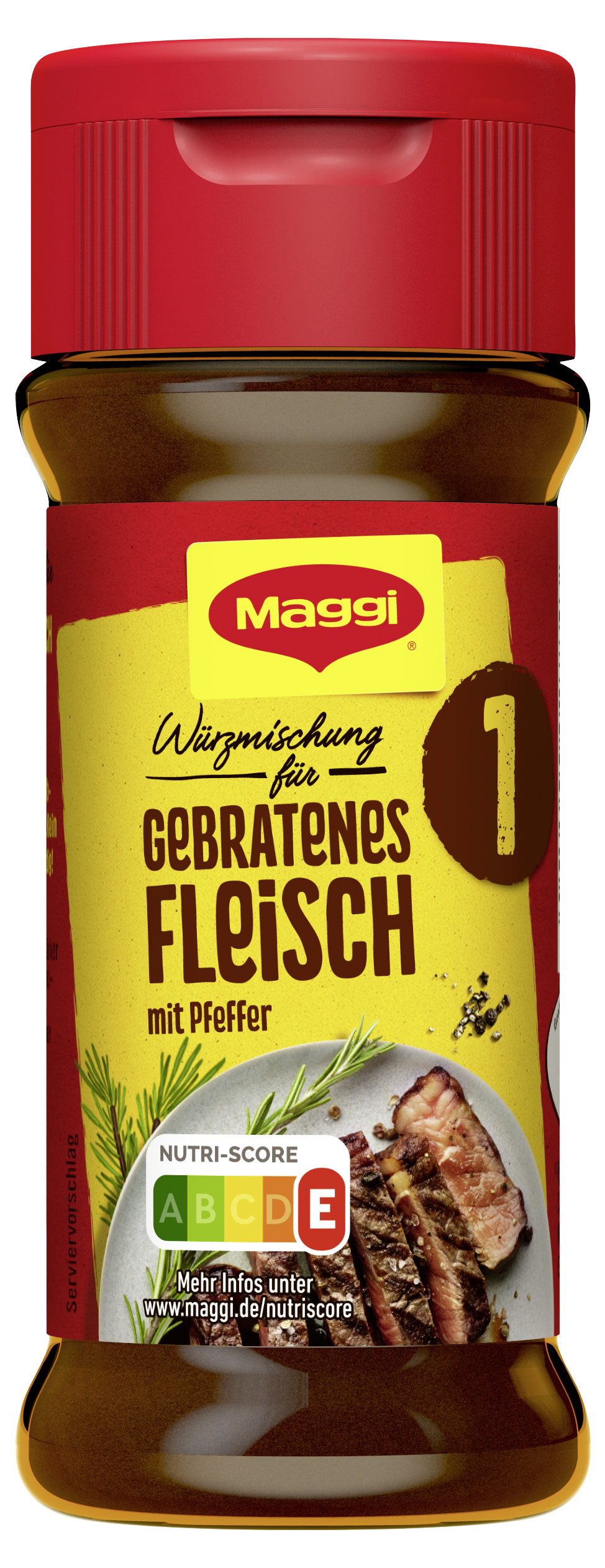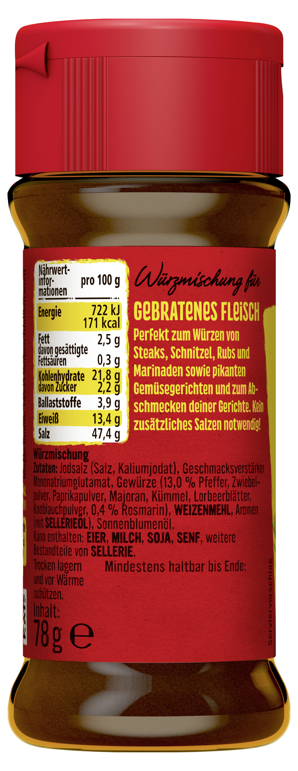 myTime Assortment Yes myTime Article Number 4502070339 myTime Product Title Maggi Würzmischung Nr. 1 für gebratenes Fleisch EAN 04005500027843 Material Number 11891220 Marke MAGGI Product Name MAGGI Würzmischung Nr. 1 für Gebratenes Fleisch 78g Net Content 78 Net Content UoM GRM Net Weight 78 Net Weight UoM GRM Artikel Höhe 120.000 Artikel Höhe UoM MMT Artikel Breite 49.000 Artikel Breite UoM MMT Artikel Länge 49.000 Artikel Länge UoM MMT Schlagwörter rind, huhn, schwein, würzmittel, gewürze, gemuese, imbiss, nudeln, suppen, schnelles gericht, essen, fertig-gericht, fast food, snack, instant, kochen, rezept, lebensmittel, convenience, food, festival, camping, produkt, kleine mahlzeit, fertigessen, unterwegs, to go, reise Bezeichnung Würzmischung Beschreibung Mit der MAGGI Würzmischung für gebratenes Fleisch erhalten herzhafte Fleischgerichte ihre perfekte Würze. Feine Kräuter und Gewürz verleihen den Gerichten einen kräftigen, pikanten Geschmack. Ob klassischer Rinderbraten oder leckere mexikanische Tortilla mit Speck – wer die richtige Würzmischung im praktischen Streuer zu Hause hat, kann sein Fleisch ganz einfach würzen! Ob saftige Steaks, leckere Schnitzel, herzhafte Fleischspieße oder deftige Rouladen – Rezepte mit Fleisch lassen sich mit der Würzmischung von MAGGI perfekt abrunden. Sie ist ideal für lang und kurz gebratene Fleischgerichte und darf in keiner Küche fehlen. Die MAGGI Würzmischung für gebratenes Fleisch ist vielseitig einsetzbar: Sie kann direkt beim Kochen und Braten oder nach der Zubereitung zum Abschmecken und Verfeinern verwendet werden. Der praktische Streuer ermöglicht ein genaues Dosieren – ganz nach individuellem Geschmack. MAGGI Würzmischung - gebratenes Fleisch ist ideal zum Würzen gebratener Fleischgerichte und dunkler Saucen. Die pikante Würzmischung mit aromatischen Kräutern und feinen Gewürzen basiert auf Pfeffer, abgerundet mit Majoran, Paprika, Kümmel, Lorbeer und Rosmarin. Einfach während des Kochens dazugeben oder danach zum Abschmecken verwenden. Genieße den einzigartigen Geschmack, den die MAGGI Würzmischung deinen Fleischgerichten verleiht! Zubereitung Perfekt zum Würzen von Steaks, Schnitzel, Rubs und Marinaden sowie pikanten Gemüsegerichten und zum Abschmecken deiner Gerichte. Kein zusätzliches Salzen notwendig! Zutaten Zutaten: Jodsalz (Salz, Kaliumjodat), Geschmacksverstärker Mononatriumglutamat, Gewürze (13,0% Pfeffer, Zwiebelpulver, Paprikapulver, Majoran, Kümmel, Lorbeerblätter, Knoblauchpulver, 0,4% Rosmarin), WEIZENMEHL, Aromen (mit SELLERIEÖL), Sonnenblumenöl.