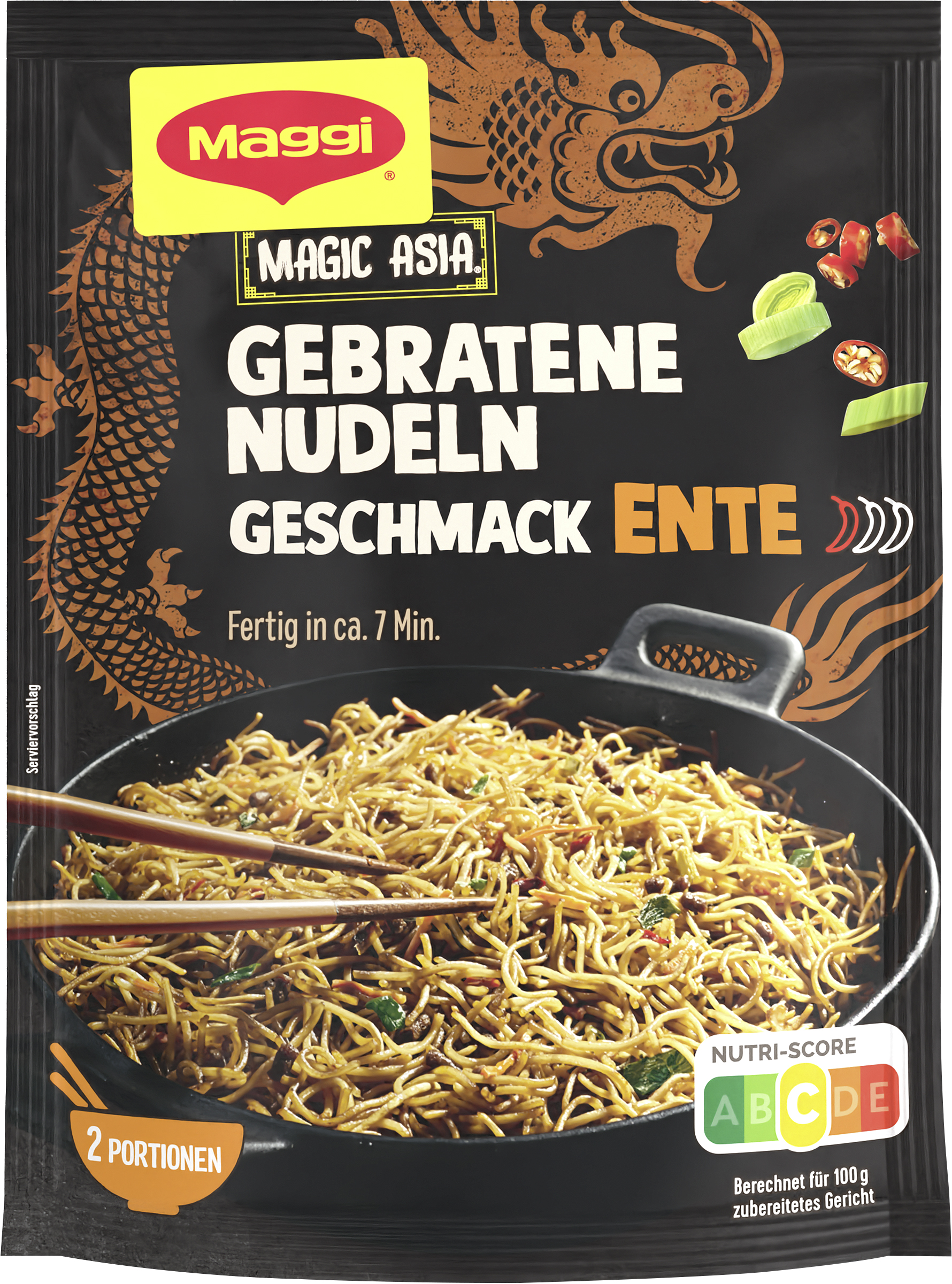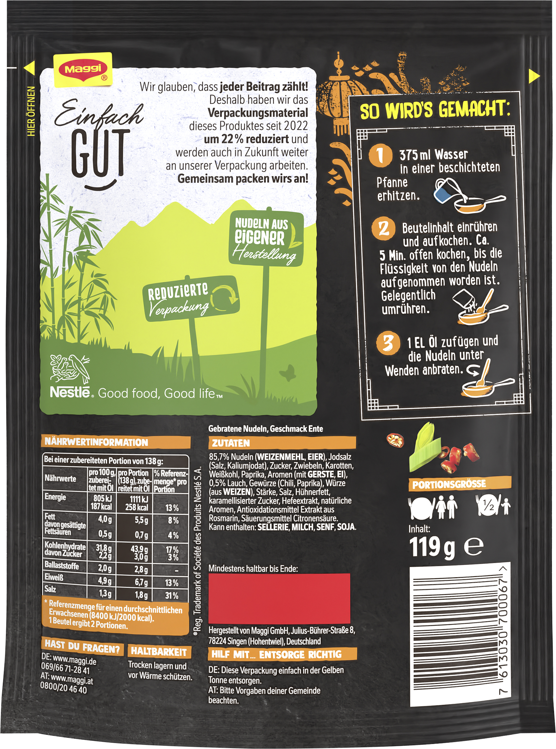myTime Assortment Yes myTime Article Number 4502050401 myTime Product Title Maggi Magic Asia Gebratene Nudeln mit Ente EAN 07613030700067 Material Number 12029389 Marke MAGGI Product Name MAGGI MAGIC ASIA Gebratene Nudeln Ente 119g Net Content 119 Net Content UoM GRM Net Weight 119 Net Weight UoM GRM Artikel Höhe 215.000 Artikel Höhe UoM MMT Artikel Breite 160.000 Artikel Breite UoM MMT Artikel Länge 37.000 Artikel Länge UoM MMT Schlagwörter ente, gemuese, asia-imbiss, nudeln, 5 minuten terrine, china, schnelles gericht, essen, fertig-gericht, fast food, snack, instant, kochen, wok-rezept, lebensmittel, convenience, food, festival, camping, produkt, kleine mahlzeit, fertigessen, unterwegs, pasta, to go, reise Bezeichnung Gebratene Nudeln Beschreibung Lust auf Abwechslung? MAGGI Magic Asia Gebratene Nudeln Geschmack Ente sorgt für ein asiatisch-würziges Geschmackserlebnis in der Küche. Mit Bratnudeln, würzigem Entenfleischgeschmack und Gemüsestückchen wie Zwiebeln, Karotten, Lauch und Paprika, fein abgeschmeckt mit einer asiatischen Gewürzmischung. Schnell und unkompliziert zubereitet und unheimlich lecker! MAGGI Asia Gebratene Nudeln Geschmack Ente, so müssen Bratnudeln schmecken Ob zum Feierabend, zum Mittagessen am Wochenende oder beim gemütlichen Asia-Dinner mit Freunden. MAGGI lädt alle Liebhaber der asiatischen Küche zu einer kulinarischen Reise nach Fernost ein. MAGGI Magic Asia Gebratene Nudeln Geschmack Ente sehen nicht nur lecker aus, sie schmecken auch hervorragend – ob mit Stäbchen oder Gabel, schon nach kurzer Zubereitungszeit kann das Schlemmen beginnen. 375 ml Wasser in einer beschichteten Pfanne erwärmen, den Beutelinhalt einrühren und aufkochen. Nun ca. 5 Minuten offen kochen lassen bis die Flüssigkeit von den Nudeln aufgenommen worden ist. Dabei gelegentlich umrühren. Schließlich 1 EL Öl hinzufügen und die Nudeln unter mehrmaligem Wenden fertig braten. MAGGI Asia Gebratene Nudeln Geschmack Ente: • Ergibt zwei leckere Portionen. • Gebratene Nudeln mit würzigem Entenfleischgeschmack und leckeren Gemüsestückchen. • Ideal für asiatische Abwechslung. • Unkompliziert und schnell zubereitet. • Das braucht man dazu: eine Pfanne, einen Pfannenwender, Wasser und Öl. Zubereitung So wird's gemacht: 1. 375ml Wasser in einer beschichteten Pfanne erhitzen. 2. Beutelinhalt einrühren und aufkochen. Ca. 5 Min. offen kochen, bis die Flüssigkeit von den Nudeln aufgenommen worden ist. Gelegentlich umrühren. 3. 1 EL Öl zufügen und die Nudeln unter Wenden anbraten. Zutaten Zutaten: 85,7% Nudeln (WEIZENMEHL, EIER), Jodsalz (Salz, Kaliumjodat), Zucker, Zwiebeln, Karotten, Weißkohl, Paprika, Aromen (mit GERSTE, EI), 0,5% Lauch, Gewürze (Chili, Paprika), Würze (aus WEIZEN), Stärke, Salz, Hühnerfett, karamellisierter Zucker, Hefeextrakt, natürliche Aromen, Antioxidationsmittel Extrakt aus Rosmarin, Säuerungsmittel Citronensäure.