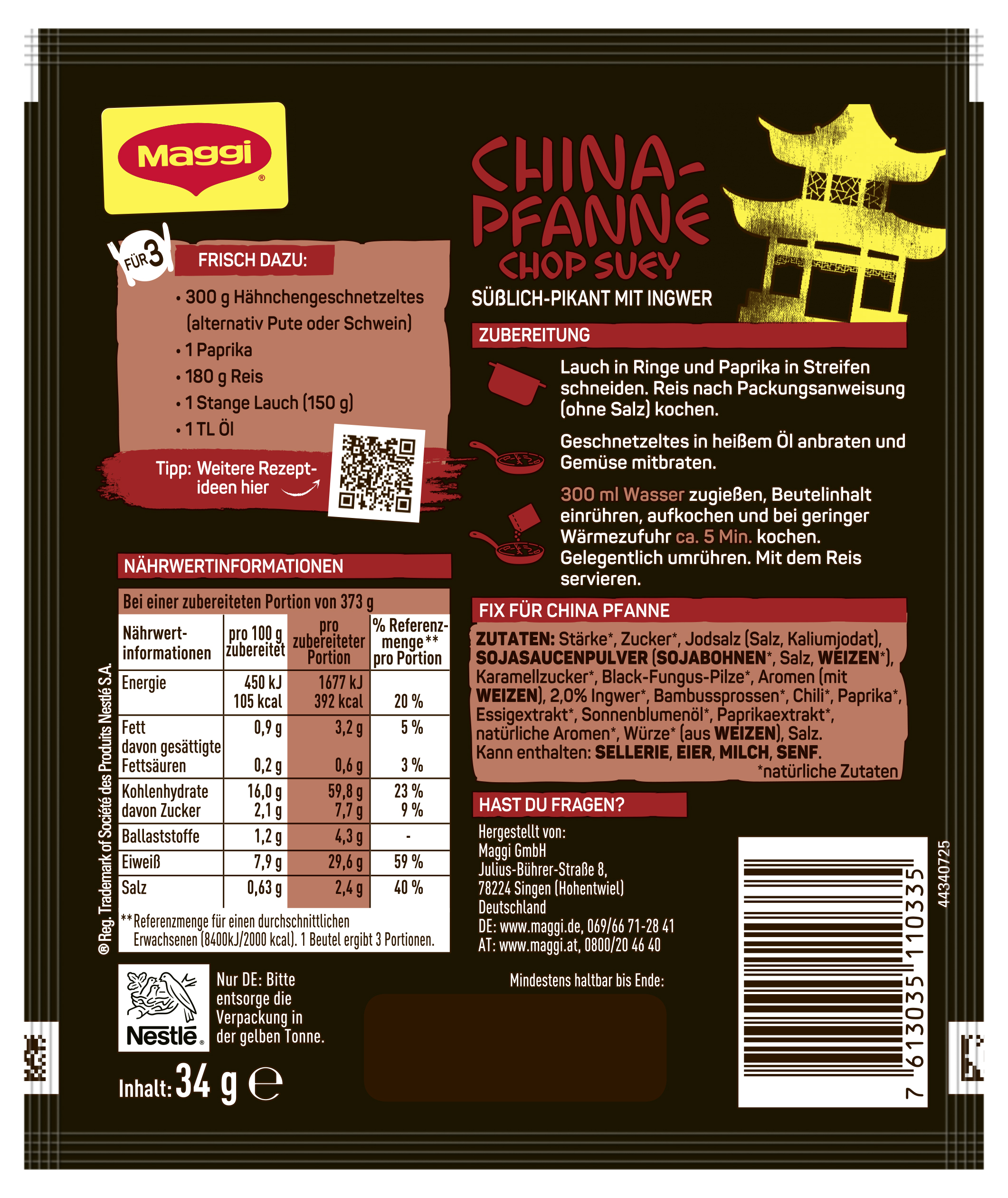 myTime Assortment Yes myTime Article Number 4502070330 myTime Product Title Maggi Magic Asia Fix China-Pfanne Chop Suey EAN 07613035110335 Material Number 12356759 Marke MAGGI Product Name MAGGI MAGIC ASIA FIX China-Pfanne Chop Suey 34g Net Content 34 Net Content UoM GRM Net Weight 34 Net Weight UoM GRM Artikel Höhe 150.000 Artikel Höhe UoM MMT Artikel Breite 127.000 Artikel Breite UoM MMT Artikel Länge 9.000 Artikel Länge UoM MMT Schlagwörter Fertigsauce, schnelle soße, fertig sauce, fertig-soße, tüte, beutel, fix-und-frisch, natürlich, verfeinern, Fix, chinesisch, asiatisch, exotisch, international Bezeichnung Fix für China Pfanne Beschreibung MAGGI Food Travel Fix für China Pfanne Chop Suey • Leckeres Chop Suey schnell und gelingsicher zu Hause zubereiten • Asiatische Gerichte ganz einfach nachkochen: Die Würzmischung enthält bereits alle einzelnen Würz-Zutaten – ohne Nachwürzen! • Mit natürlichen Zutaten – süßlich-pikant mit Ingwer • Ein Beutelinhalt ergibt 3 leckere Portionen MAGGI Food Travel Fix für China Pfanne Chop Suey Inspiriert von den Länderküchen der Welt, schickt dich die MAGGI Food Travel Linie mit leckeren Gerichten von nah und fern auf eine kulinarische Reise. Herzhaftes Fleisch, leckeres Gemüse und aromatische Gewürze wie Ingwer und Chili machen das Gericht zu einem echten Asia-Klassiker. Hol dir mit dem MAGGI Food Travel Fix für China Pfanne Chop Suey ein bisschen Urlaubsflair in deine Küche! Die Würzmischung mit Ingwer, Chili und Paprika gibt dem Gericht eine süßlich-pikante Schärfe. Lass deinen Geschmack verreisen! Zubereitung für 3 Portionen: Lauch in Ringe und Paprika in Streifen schneiden. Reis nach Packungsanweisung, ohne Salz, kochen. Geschnetzeltes in heißem Öl anbraten und Gemüse mitbraten. 300 ml Wasser zugießen, Beutelinhalt einrühren, aufkochen und bei geringer Wärmezufuhr ca. 5 Min. kochen. Gelegentlich umrühren. Mit dem Reis servieren. Dieses Produkt hat den Nutri-Score B. Zubereitung Frisch dazu: - 300g Hähnchengeschnetzeltes (alternativ Pute oder Schwein) - 1 Paprika - 180g Reis - 1 Stange Lauch (150g) - 1 TL Öl Zubereitung: Lauch in Ringe und Paprika in Streifen schneiden. Reis nach Packungsanweisung (ohne Salz) kochen. Geschnetzeltes in heißem Öl anbraten und Gemüse mitbraten. 300 ml Wasser zugießen, Beutelinhalt einrühren, aufkochen und bei geringer Wärmezufuhr ca. 5 Min. kochen. Gelegentlich umrühren. Mit dem Reis servieren. Zutaten Zutaten: Stärke*, Zucker*, Jodsalz (Salz, Kaliumjodat), SOJASAUCENPULVER (SOJABOHNEN*, Salz, WEIZEN*), Karamellzucker*, Black-Fungus-Pilze*, Aromen (mit WEIZEN), 2,0% Ingwer*, Bambussprossen*, Chili*, Paprika*, Essigextrakt*, Sonnenblumenöl*, Paprikaextrakt*, natürliche Aromen*, Würze* (aus WEIZEN), Salz.