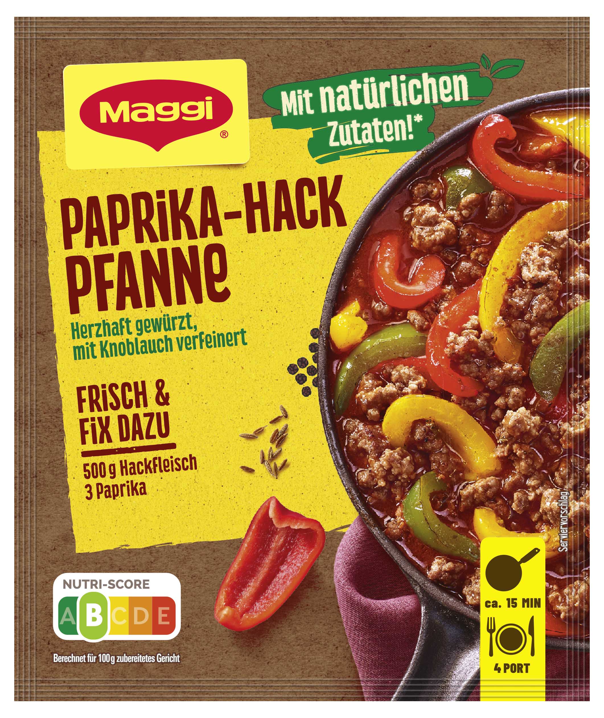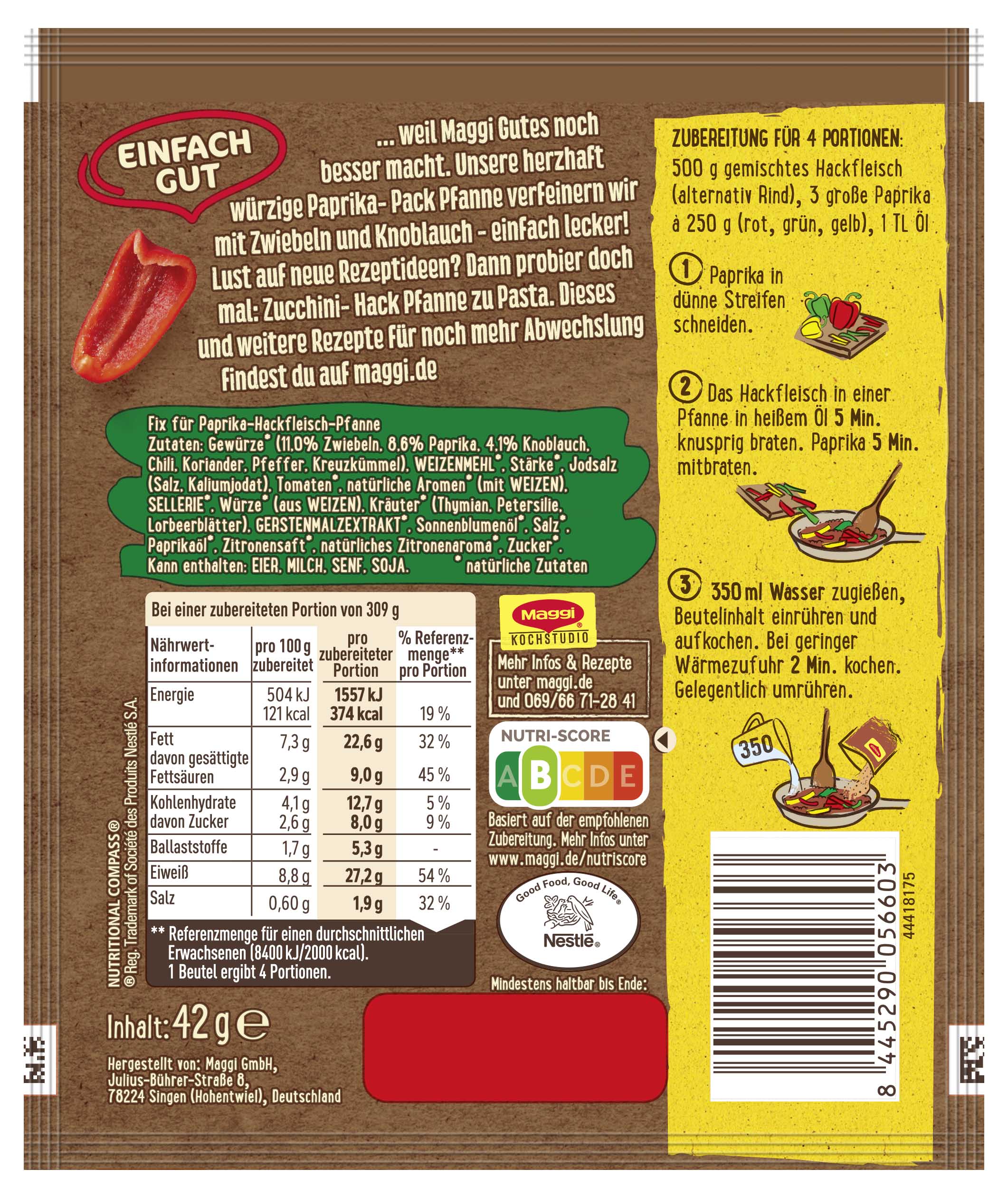 myTime Assortment Yes myTime Article Number 4502072302 myTime Product Title Maggi Fix Paprika Hack Pfanne EAN 08445290056603 Material Number 12507837 Marke MAGGI Product Name MAGGI FIX Paprika Hack Pfanne 42g Net Content 42.000 Net Content UoM GRM Net Weight 42 Net Weight UoM GRM Artikel Höhe 150.000 Artikel Höhe UoM MMT Artikel Breite 127.000 Artikel Breite UoM MMT Artikel Länge 9.000 Artikel Länge UoM MMT Schlagwörter Fertigsauce, schnelle soße, fertig sauce, fertig-soße, instant-soße, tüte, beutel, fix-und-frisch, natürlich, verfeinern, Fix Bezeichnung Fix für Paprika-Hackfleisch-Pfanne Beschreibung Herzhafte Rezepte mit Hack sind Favoriten in der Küche? Dann ist MAGGI Fix für Paprika-Hack Pfanne genau das Richtige. Genieße den Geschmack von frisch gebratenem Hackfleisch, fruchtigen Paprika-Streifen und Gewürzen! Einfach, raffiniert und lecker! Fleischgerichte mit Hackfleisch schmecken und gelingen immer Wie alle MAGGI Rezepte mit Hack schmeckt auch die Maggi Paprika-Hack Pfanne mit leckeren Gewürzen verfeinert hervorragend. Koriander und Kreuzkümmel verleihen dem Gericht eine würzig-pikante und unwiderstehlich schmackhafte Note. Mit der Rezeptanleitung kann man im Handumdrehen das Lieblingsgericht kochen. Schneide die Paprika und brate das Hackfleisch 5 Minuten knusprig. Anschließend die Paprika hinzugeben und 5 Minuten mitbraten. Danach 350ml Wasser zugießen, Beutelinhalt einrühren und aufkochen lassen. Bei geringer Wärmezufuhr 2 Minuten kochen und gelegentlich umrühren. Dieses Produkt hat den Nutri-Score B. Der Nutri-Score wird von den französischen Gesundheitsbehörden berechnet und bewertet den Energiegehalt sowie weniger positive und positive Inhaltsstoffe. Diese Bewertung hilft dir, das Nährwertprofil deiner Lieblingsprodukte auf einen Blick zu erkennen. Die Skala reicht von dunkelgrünem A günstiger bis rotem E weniger günstig. Genieße leckere und einfache Gerichte, die schnell im Alltag zubereitet sind, dank MAGGI! Zubereitung Zubereitung für 4 Portionen: 500 g gemischtes Hackfleisch (alternativ Rind), 3 Paprika (rot, grün, gelb), 1 TL Öl 1. Paprika in dünne Streifen schneiden. 2. Das Hackfleisch in einer Pfanne in heißem Öl 5 Min. knusprig braten. Paprika 5 Min. mitbraten. 3. 350 ml Wasser zugießen, Beutelinhalt einrühren und aufkochen. Bei geringer Wärmezufuhr 2 Min. kochen. Gelegentlich umrühren. Zutaten Zutaten: Gewürze* (11,0% Zwiebeln, 8,6% Paprika, 4,1% Knoblauch, Chili, Koriander, Pfeffer, Kreuzkümmel), WEIZENMEHL*, Stärke*, Jodsalz (Salz, Kaliumjodat), Tomaten*, natürliche Aromen* (mit WEIZEN), SELLERIE*, Würze* (aus WEIZEN), Kräuter* (Thymian, Petersilie, Lorbeerblätter), GERSTENMALZEXTRAKT*, Sonnenblumenöl*, Salz*, Paprikaöl*, Zitronensaft*, natürliches Zitronenaroma*, Zucker*.