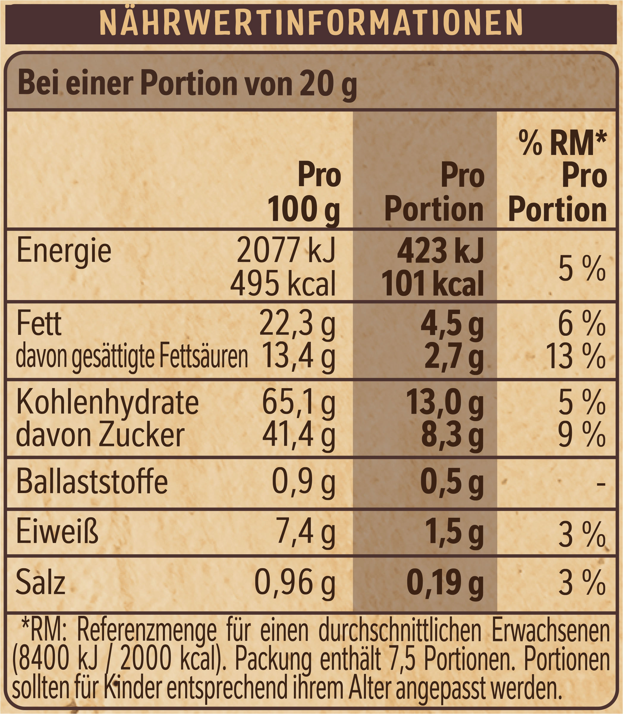 Sub Brand Name CHOCO CROSSIES Brand Owner Name Société des Produits Nestlé S.A. Functional Name Knusperpralinen Country of Origin Germany Allergen Statement Gerstenmalzextrakt, Magermilchpulver, Molkenpulvererzeugnis, Vollmilchpulver, Soja Haltbarkeit & Lagerung Trocken lagern. Vor Wärme schützen. Anwendungs- & Gebrauchshinweise Portionen sollten für Kinder entsprechend ihrem Alter angepasst werden. Third Party Accreditation RAINFOREST_ALLIANCE_PEOPLE_NATURE Nutritional Table 1 Zubereitungsgrad Bezugsgröße Portionsgröße Portionsgröße Beschreibung Tagesdosis Referenzwert Nährstoff: Teil von… Messgenauigkeit Nährwert % Messgenauigkeit % Referenzmenge UNPREPARED100GRMENER-EnergieAPPROXIMATELY2077kJ UNPREPARED100GRMENER-EnergieAPPROXIMATELY495kCal UNPREPARED100GRMFATFettAPPROXIMATELY22.3g UNPREPARED100GRMFASATFett, davon gesättigte FettsäurenAPPROXIMATELY13.4g UNPREPARED100GRMCHOAVLKohlenhydrateAPPROXIMATELY65.1g UNPREPARED100GRMSUGAR-Kohlenhydrate, davon ZuckerAPPROXIMATELY41.4g UNPREPARED100GRMFIBTGBallaststoffeAPPROXIMATELY0.9g UNPREPARED100GRMPRO-EiweißAPPROXIMATELY7.4g UNPREPARED100GRMSALTEQSalz ÄquivalentAPPROXIMATELY0.96g Nutritional Table 2 Zubereitungsgrad Bezugsgröße Portionsgröße Portionsgröße Beschreibung Tagesdosis Referenzwert Nährstoff: Teil von… Messgenauigkeit Nährwert % Messgenauigkeit % Referenzmenge UNPREPARED1PTN20GRMReferenzmenge für einen durchschnittlichen Erwachsenen (8400kJ/ 2000kcal).ENER-EnergieAPPROXIMATELY423kJ5 UNPREPARED1PTN20GRMReferenzmenge für einen durchschnittlichen Erwachsenen (8400kJ/ 2000kcal).ENER-EnergieAPPROXIMATELY101kCal5 UNPREPARED1PTN20GRMReferenzmenge für einen durchschnittlichen Erwachsenen (8400kJ/ 2000kcal).FATFettAPPROXIMATELY4.5g6 UNPREPARED1PTN20GRMReferenzmenge für einen durchschnittlichen Erwachsenen (8400kJ/ 2000kcal).FASATFett, davon gesättigte FettsäurenAPPROXIMATELY2.7g13 UNPREPARED1PTN20GRMReferenzmenge für einen durchschnittlichen Erwachsenen (8400kJ/ 2000kcal).CHOAVLKohlenhydrateAPPROXIMATELY13.0g5 UNPREPARED1PTN20GRMReferenzmenge für einen durchschnittlichen Erwachsenen (8400kJ/ 2000kcal).SUGAR-Kohlenhydrate, davon ZuckerAPPROXIMATELY8.3g9 UNPREPARED1PTN20GRMReferenzmenge für einen durchschnittlichen Erwachsenen (8400kJ/ 2000kcal).FIBTGBallaststoffeAPPROXIMATELY0.5g UNPREPARED1PTN20GRMReferenzmenge für einen durchschnittlichen Erwachsenen (8400kJ/ 2000kcal).PRO-EiweißAPPROXIMATELY1.5g3 UNPREPARED1PTN20GRMReferenzmenge für einen durchschnittlichen Erwachsenen (8400kJ/ 2000kcal).SALTEQSalz ÄquivalentAPPROXIMATELY0.19g3 Contact Nestle Deutschland AG Contact Address 60523 Frankfurt am Main, Deutschland