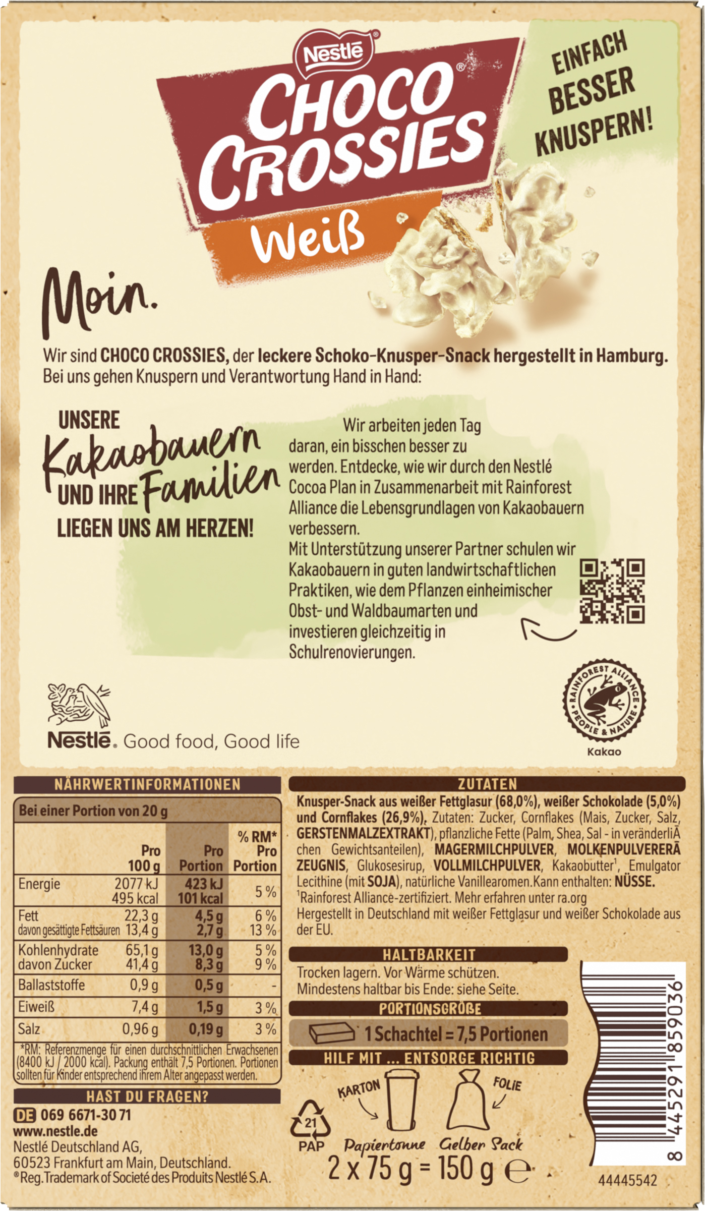 myTime Assortment Yes myTime Article Number 4502039928 myTime Product Title Nestlé Choco Crossies Weiß EAN 08445291859036 Material Number 12623331 Marke NESTLE Product Name NESTLE CHOCO CROSSIES Weiß 150g Net Content Statement 2x75g Net Content 150.000 Net Content UoM GRM Net Weight 150 Net Weight UoM GRM Artikel Höhe 110.000 Artikel Höhe UoM MMT Artikel Breite 188.000 Artikel Breite UoM MMT Artikel Länge 41.000 Artikel Länge UoM MMT Schlagwörter flake, schokolade, crossi, schoko crossis, flakes, schokolade, schoko crispies, chocolate nestle, nestle, chocolate chips, schokoflakes, choco chips, schoko chips, chococrossies, flakes, chocolate flakes mit schokolade, schoko crossies Bezeichnung Knusper-Snack aus weißer Fettglasur (68,0%), weißer Schokolade (5,0%) und Cornflakes (26,9%). Beschreibung CHOCO CROSSIES White Lass es knuspern! Knusprige Flakes, umhüllt von cremiger weißer Glasur. Der besondere Nestlé-Klassiker CHOCO CROSSIES White sorgt für ein einzigartiges Knusper-Erlebnis. • Unser besonderer Klassiker mit knusprigen Flakes in cremiger weißer Glasur • Die Kombination aus Cremigkeit und Knusprigkeit sorgt für ein tolles Geschmackserlebnis • Knuspriger Genuss für Groß und Klein • 100% Kakao aus nachhaltiger Beschaffung: Glasur mit Kakao aus Rainforest Alliance-zertifizierten Bohnen hergestellt Zutaten Zutaten: Zucker, Cornflakes (Mais, Zucker, Salz, GERSTENMALZEXTRAKT), pflanzliche Fette (Palm, Shea, Sal - in veränderlichen Gewichtsanteilen), MAGERMILCHPULVER, MOLKENPULVERERZEUGNIS, Glukosesirup, VOLLMILCHPULVER, Kakaobutter*, Emulgator Lecithine (mit SOJA), natürliche Vanillearomen.