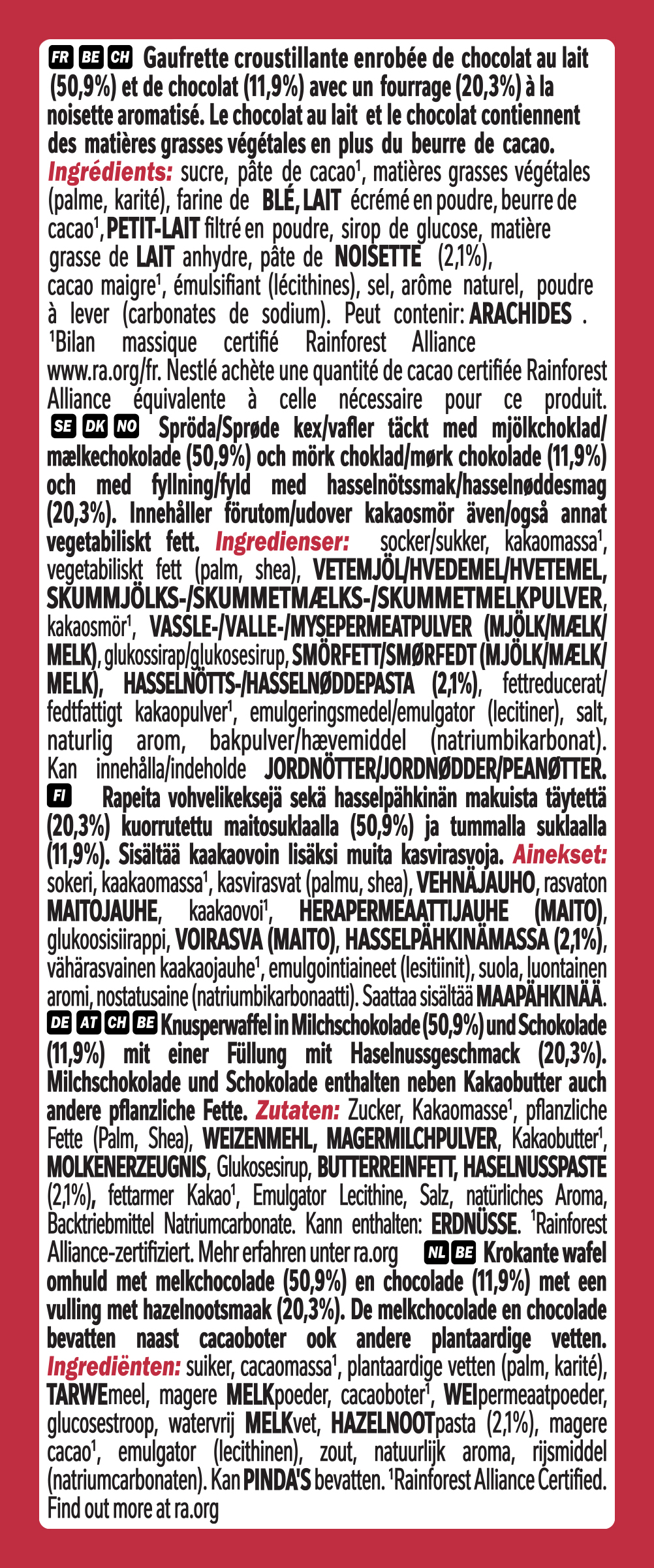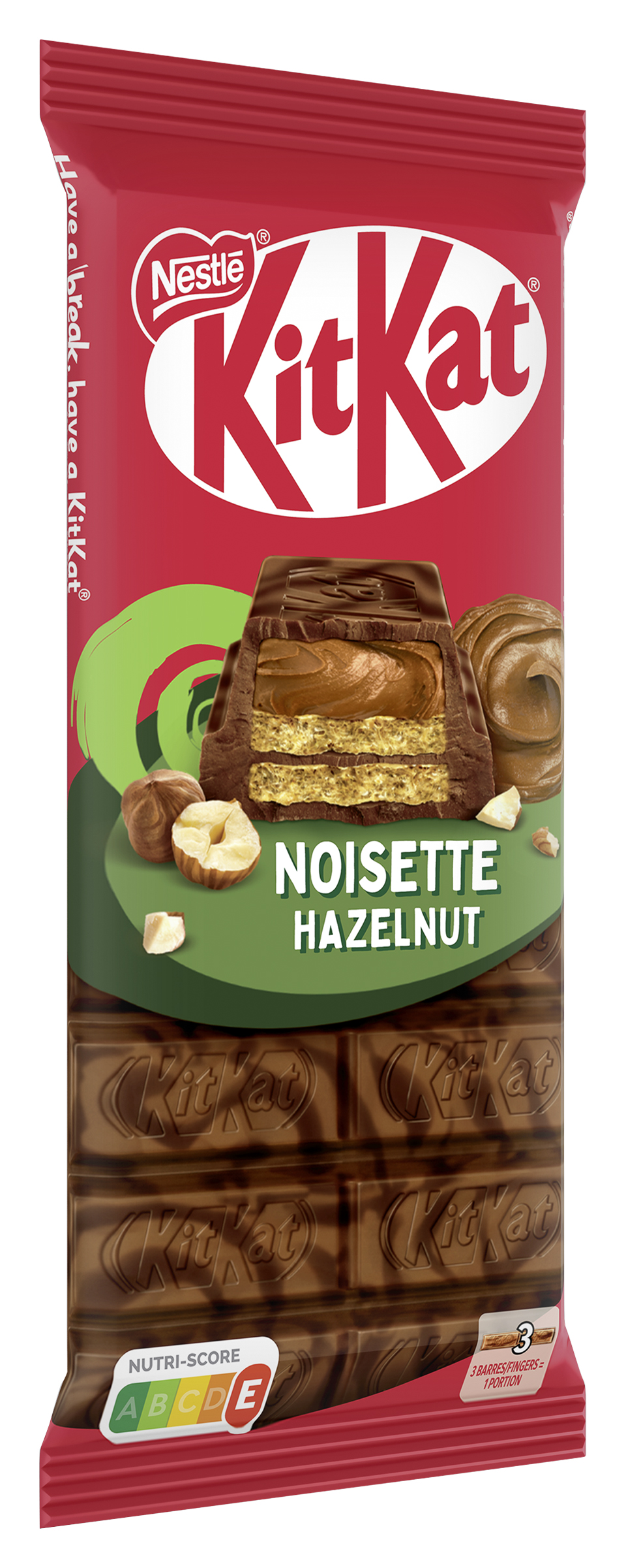 myTime Assortment Yes myTime Article Number 4502039924 myTime Product Title Nestlé Kitkat Tablet Hazelnut EAN 03800020491409 Material Number 12593933 Marke NESTLE Product Name NESTLE KITKAT Tablet Hazelnut 99g Net Content 99.000 Net Content UoM GRM Net Weight 99 Net Weight UoM GRM Artikel Höhe 152.000 Artikel Höhe UoM MMT Artikel Breite 72.000 Artikel Breite UoM MMT Artikel Länge 11.000 Artikel Länge UoM MMT Schlagwörter chocolate, food, kinder, kinderriegel, kinderschokolade, knusperriegel, nestle, süßigkeiten, box, chocolates, schokolade, süßigkeiten, süßigkeiten, süßigkeit, waffeln, snacks, süßigkeiten, chocolat, lebensmittel, süß, kat kit, studentenfutter, süßes, tafel, hazelnut Bezeichnung Knusperwaffel mit Milchschokolade (50,9%) und Schokolade (11,9%) mit einer Füllung mit Haselnussgeschmack (20,3%). Beschreibung Have a break, have a KITKAT Die neue KITKAT Tafel Hazelnut ist der ideale Snack für eine neue Art von Pause - ideal zum Teilen mit Freunden, alleine oder zu Hause. Seine einzigartige Kombination von leichter, knuspriger Waffel mit cremiger Haselnuss Füllung und leckerer marmorierter Schokolade macht die KITKAT Tafel zum idealen Pausensnack. Aber egal, ob man sie alleine oder gemeinsam genießt: eine entspannte Pause zu Hause mit der KITKAT Tafel Hazelnut lädt den Akku wieder auf. Die knusprig luftige Waffel mit cremiger Haselnuss-Füllung wird umhüllt von einer leckeren, marmorierten Schokolade. Diese Balance aus knusprig und zart schmeckt nicht nur großartig, sondern fühlt sich auch herrlich leicht an – also perfekt für Haselnuss-Fans und eine lässige Pause zwischendurch! Zutaten Zutaten: Zucker, Kakaomasse*, pflanzliche Fette (Palm, Shea), WEIZENMEHL, MAGERMILCHPULVER, Kakaobutter*, MOLKENERZEUGNIS, Glukosesirup, BUTTERREINFETT, HASELNUSSPASTE (2,1%), fettarmer Kakao*, Emulgator Lecithine, Salz, natürliches Aroma, Backtriebmittel Natriumcarbonate. Kann enthalten: ERDNÜSSE. *Rainforest Alliance-zertifiziert.