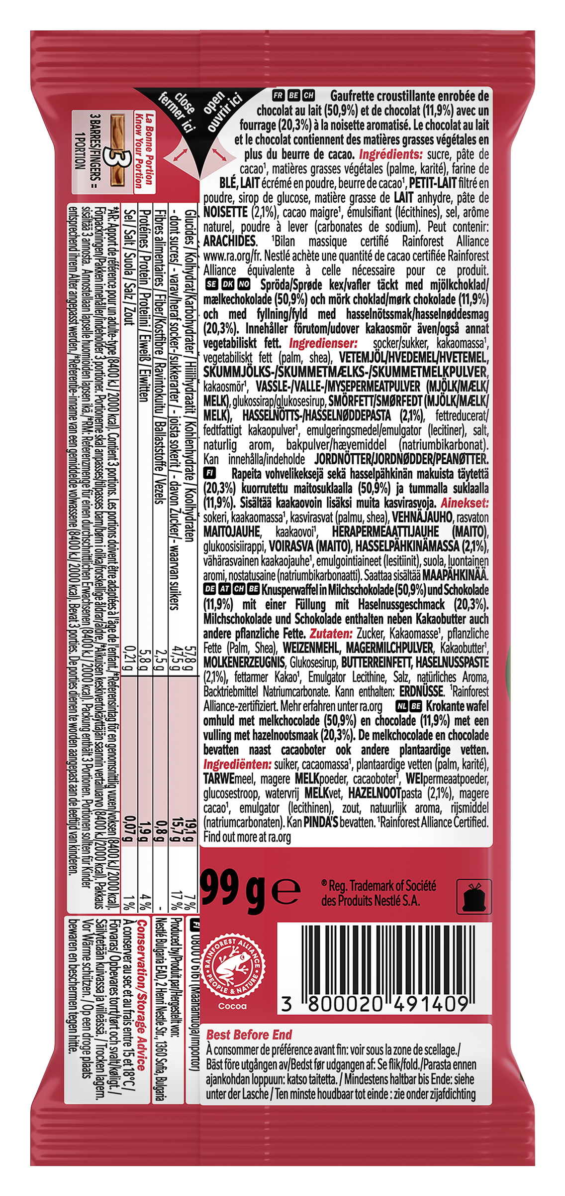 Sub Brand Name KIT KAT Brand Owner Name Société des Produits Nestlé S.A. Functional Name Schokolade Country of Origin Bulgaria Allergen Statement Weizenmehl, Magermilchpulver, Molkenerzeugnis, Butterreinfett, Haselnusspaste Haltbarkeit & Lagerung Trocken lagern. Vor Wärme schützen. Anwendungs- & Gebrauchshinweise Portionen sollte für Kinder entsprechend ihrem Alter angepasst werden. Dietary Regime Code VEGETARIAN Is Diet Type Marked on Package? TRUE Third Party Accreditation RAINFOREST_ALLIANCE_PEOPLE_NATURE Nutritional Table 1 Zubereitungsgrad Bezugsgröße Portionsgröße Portionsgröße Beschreibung Tagesdosis Referenzwert Nährstoff: Teil von… Messgenauigkeit Nährwert % Messgenauigkeit % Referenzmenge UNPREPARED100GRMENER-EnergieAPPROXIMATELY2213kJ UNPREPARED100GRMENER-EnergieAPPROXIMATELY530kCal UNPREPARED100GRMFATFettAPPROXIMATELY29.9g UNPREPARED100GRMFASATFett, davon gesättigte FettsäurenAPPROXIMATELY16.6g UNPREPARED100GRMCHOAVLKohlenhydrateAPPROXIMATELY57.8g UNPREPARED100GRMSUGAR-Kohlenhydrate, davon ZuckerAPPROXIMATELY47.5g UNPREPARED100GRMFIBTGBallaststoffeAPPROXIMATELY2.5g UNPREPARED100GRMPRO-EiweißAPPROXIMATELY5.8g UNPREPARED100GRMSALTEQSalz ÄquivalentAPPROXIMATELY0.21g Nutritional Table 2 Zubereitungsgrad Bezugsgröße Portionsgröße Portionsgröße Beschreibung Tagesdosis Referenzwert Nährstoff: Teil von… Messgenauigkeit Nährwert % Messgenauigkeit % Referenzmenge UNPREPARED1PTN33GRMReferenzmenge für einen durchschnittlichen Erwachsenen (8400 kJ/ 2000 kcal).ENER-EnergieAPPROXIMATELY730kJ9 UNPREPARED1PTN33GRMReferenzmenge für einen durchschnittlichen Erwachsenen (8400 kJ/ 2000 kcal).ENER-EnergieAPPROXIMATELY175kCal9 UNPREPARED1PTN33GRMReferenzmenge für einen durchschnittlichen Erwachsenen (8400 kJ/ 2000 kcal).FATFettAPPROXIMATELY9.9g14 UNPREPARED1PTN33GRMReferenzmenge für einen durchschnittlichen Erwachsenen (8400 kJ/ 2000 kcal).FASATFett, davon gesättigte FettsäurenAPPROXIMATELY5.5g28 UNPREPARED1PTN33GRMReferenzmenge für einen durchschnittlichen Erwachsenen (8400 kJ/ 2000 kcal).CHOAVLKohlenhydrateAPPROXIMATELY19.1g7 UNPREPARED1PTN33GRMReferenzmenge für einen durchschnittlichen Erwachsenen (8400 kJ/ 2000 kcal).SUGAR-Kohlenhydrate, davon ZuckerAPPROXIMATELY15.7g17 UNPREPARED1PTN33GRMReferenzmenge für einen durchschnittlichen Erwachsenen (8400 kJ/ 2000 kcal).FIBTGBallaststoffeAPPROXIMATELY0.8g UNPREPARED1PTN33GRMReferenzmenge für einen durchschnittlichen Erwachsenen (8400 kJ/ 2000 kcal).PRO-EiweißAPPROXIMATELY1.9g4 UNPREPARED1PTN33GRMReferenzmenge für einen durchschnittlichen Erwachsenen (8400 kJ/ 2000 kcal).SALTEQSalz ÄquivalentAPPROXIMATELY0.07g1 Contact Nestlé Bulgaria EAD Contact Address 2 Henri Nestle Str., 1360 Sofia, Bulgaria