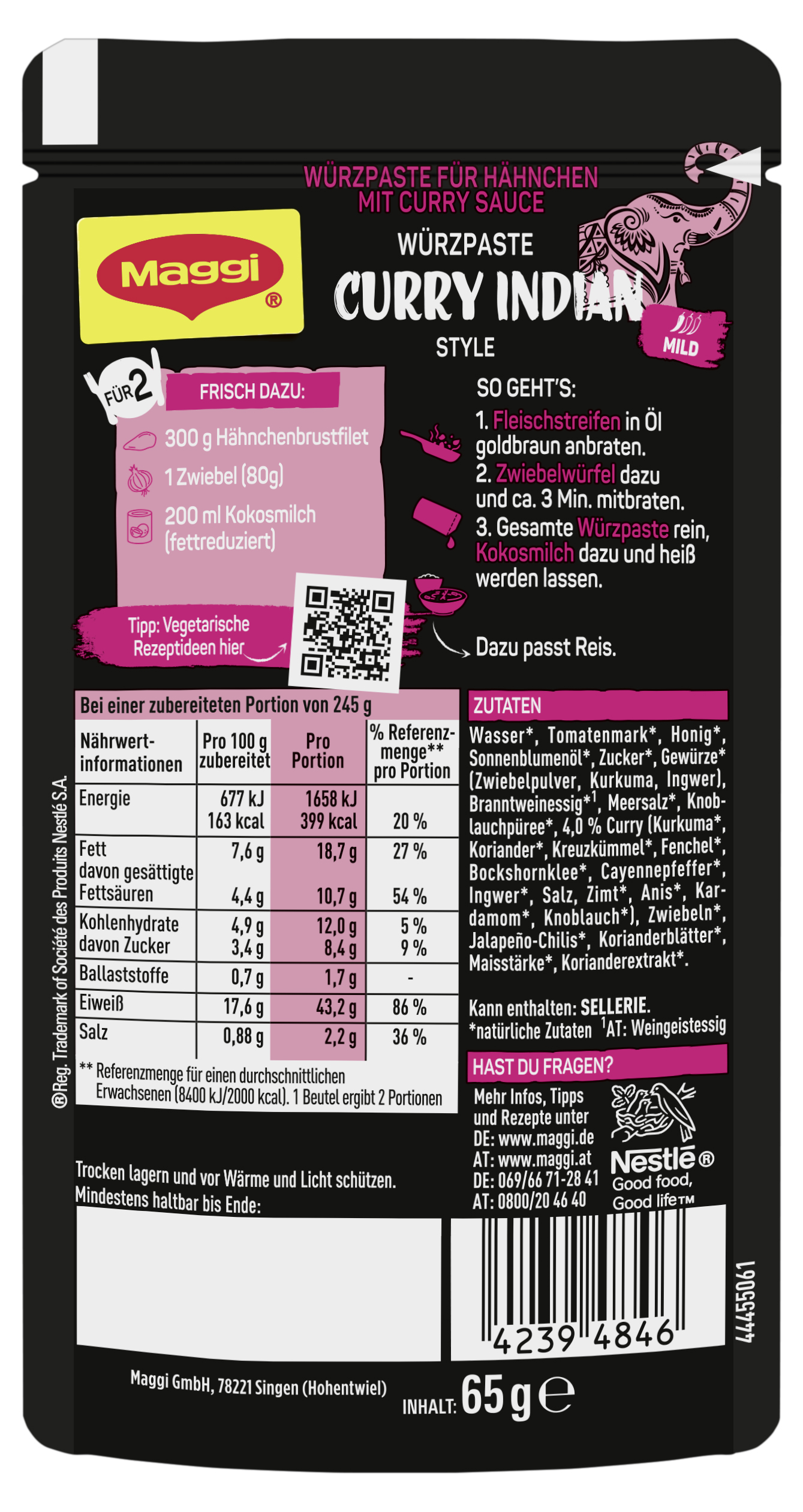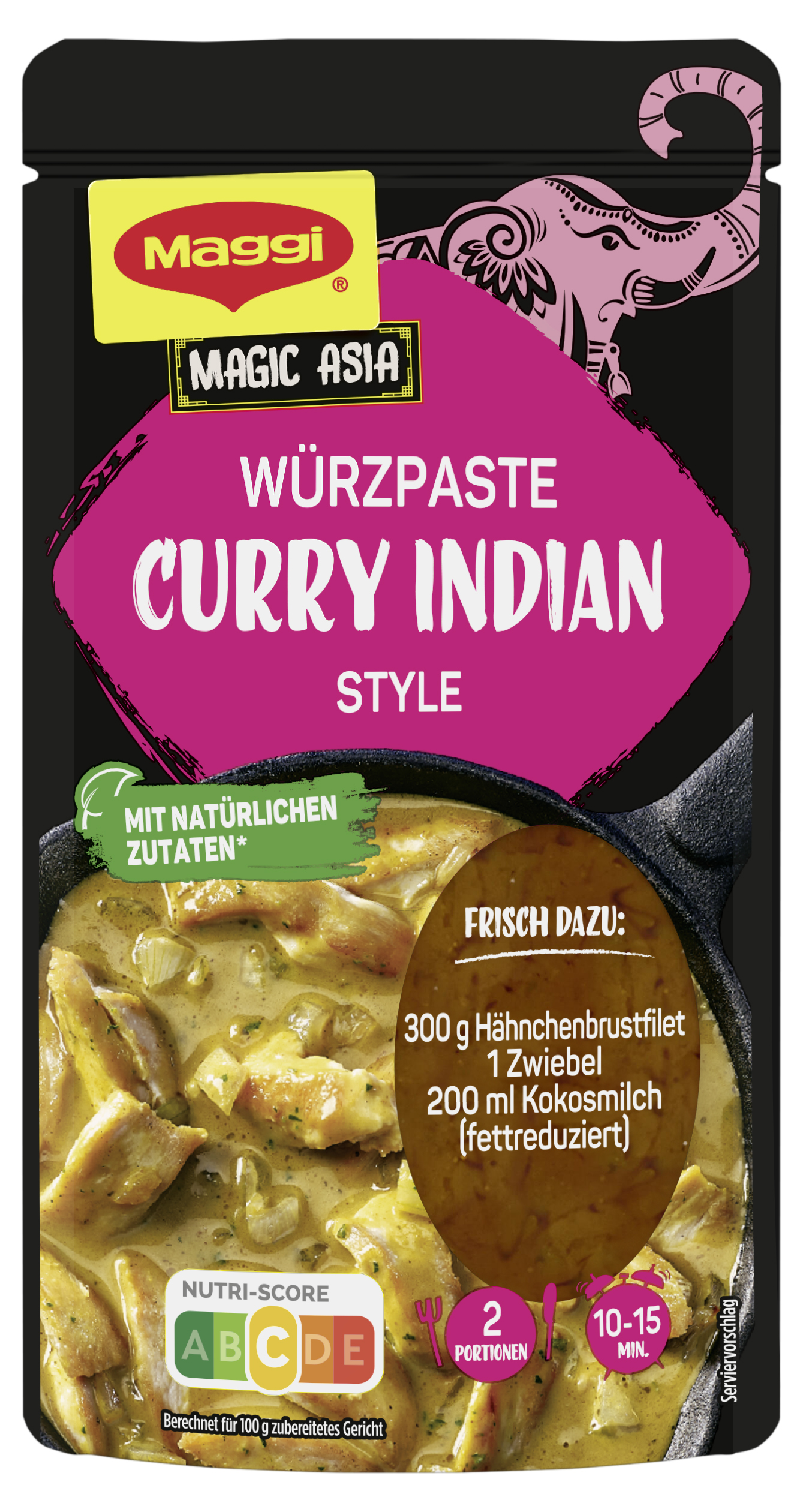 myTime Assortment Yes myTime Article Number 4502073226 myTime Product Title Maggi Magic Asia Würzpaste für Curry Indian Style EAN 00000042394846 Material Number 12593339 Marke MAGGI Product Name MAGGI MAGIC ASIA Würzpaste für Indian Curry Style 65g Net Content 65.000 Net Content UoM GRM Net Weight 65 Net Weight UoM GRM Artikel Höhe 152.000 Artikel Höhe UoM MMT Artikel Breite 83.000 Artikel Breite UoM MMT Artikel Länge 17.000 Artikel Länge UoM MMT Schlagwörter gewürzmischung, indisch, würzmischung, gewürzpaste, gewürzpasten, currypaste, asiatisch, asia Bezeichnung Würzpaste für Hähnchen mit Curry Sauce Beschreibung Entdecke mit den MAGGI Magic Asia Würzpasten die kulinarische Vielfalt Indiens direkt in deiner eigenen Küche! Diese einzigartige Würzpaste vereint alle exotischen Gewürze und Aromen, die ein authentisches Curry indischer Art ausmachen. Von saftigem Hähnchenbrustfilet bis hin zu cremiger Kokosmilch – alles ist bereits perfekt abgestimmt, um dir ein unvergessliches Geschmackserlebnis zu bieten. Die Zubereitung könnte nicht einfacher sein: Brate einfach die Hähnchenstreifen in Öl goldbraun an, gib die Zwiebelwürfel hinzu und brate sie zusammen an. Dann füge die gesamte Würzpaste hinzu, gieße die Kokosmilch dazu und lass alles heiß werden. In nur wenigen Minuten steht dein köstliches indisches Curry auf dem Tisch, perfekt begleitet von einer Portion Basmati-Reis. Eine 65g Packung reicht für zwei köstliche Portionen! Verwandle deine Küche in einen Tempel der Aromen mit MAGGI Magic Asia Würzpasten und erlebe die Magie der indischen Küche bei dir zu Hause! Erwecke deine Gerichte zum Leben mit der Einfachheit und Qualität von MAGGI. Zubereitung Frisch dazu: 300g Hähnchenbrustfilet 1 Zwiebel (80g) 200ml Kokosmilch (fettreduziert) So geht's: 1. Fleischstreifen in Öl goldbraun anbraten. 2. Zwiebelwürfel dazu und ca. 3 Min. mitbraten. 3. Gesamte Würzpaste rein, Kokosmilch dazu und heiß werden lassen. Dazu passt Reis. Zutaten Zutaten: Wasser*, Tomatenmark*, Honig*, Sonnenblumenöl*, Zucker*, Gewürze* (Zwiebelpulver, Kurkuma, Ingwer), Branntweinessig*, Meersalz*, Knoblauchpüree*, 4,0% Curry (Kurkuma*, Koriander*, Kreuzkümmel*, Fenchel*, Bockshornklee*, Cayennepfeffer*, Ingwer*, Salz, Zimt*, Anis*, Kardamom*, Knoblauch*), Zwiebeln*, Jalapeño-Chilis*, Korianderblätter*, Maisstärke*, Korianderextrakt*. Kann enthalten: SELLERIE.