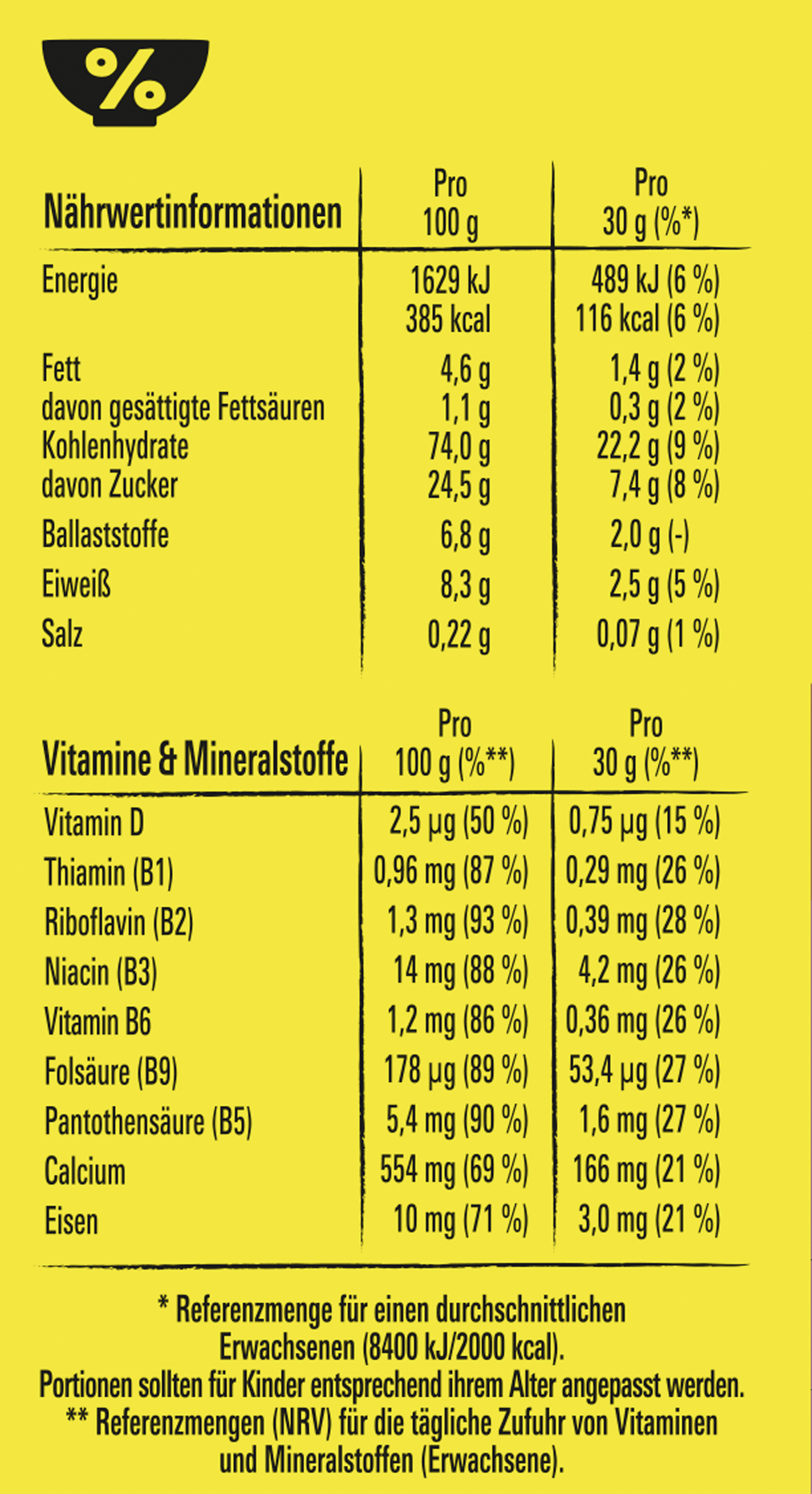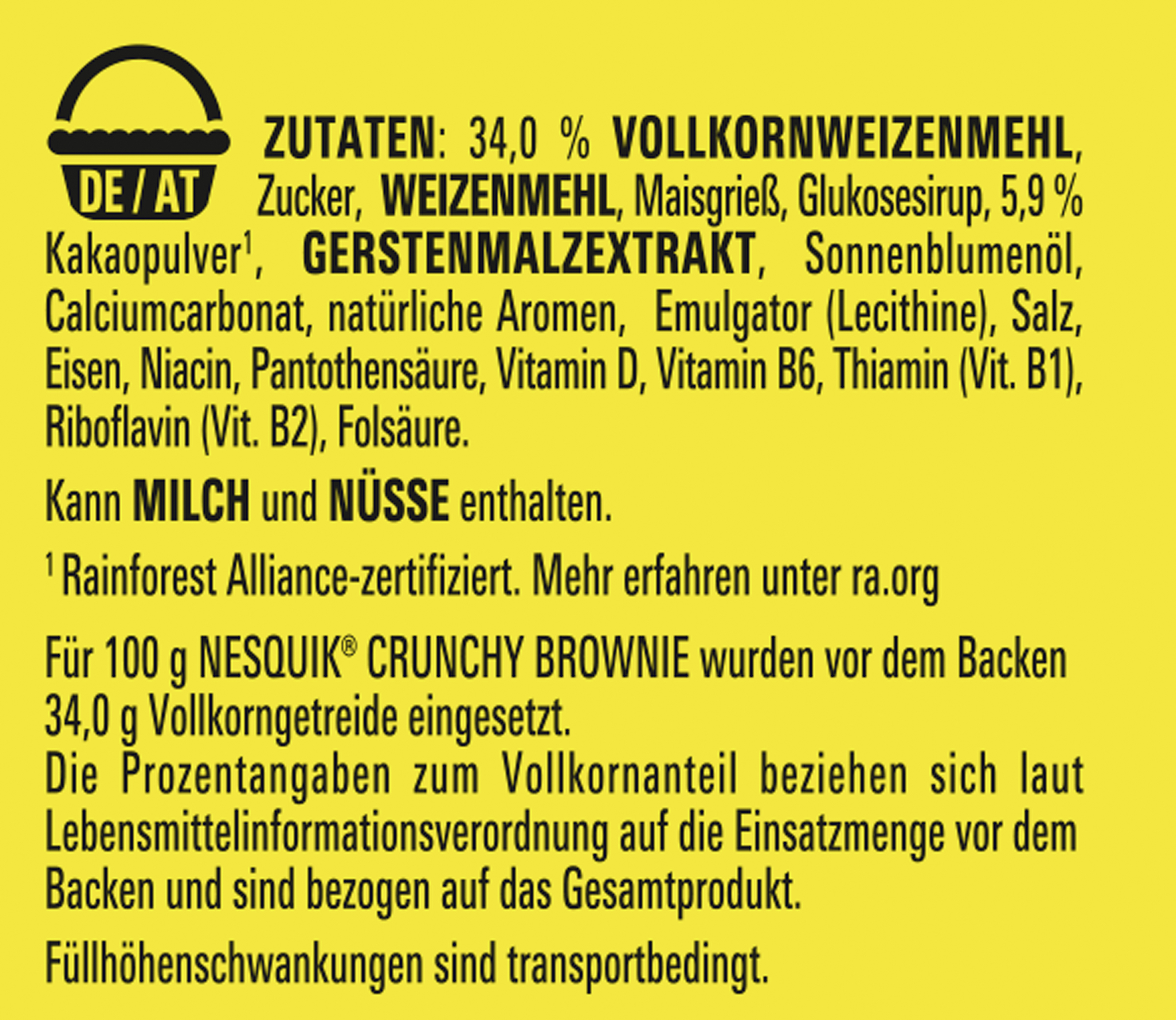 Sub Brand Name NESQUIK CRUNCHY BROWNIE Brand Owner Name Société des Produits Nestlé S.A. Functional Name Geröstete Getreidekost Country of Origin Poland Allergen Statement Vollkornweizenmehl, Weizenmehl, Gerstenmalzextrakt Haltbarkeit & Lagerung Trocken lagern. Vor Wärme schützen. Anwendungs- & Gebrauchshinweise Portionen sollten für Kinder entsprechend ihrem Alter angepasst werden. Third Party Accreditation RAINFOREST_ALLIANCE_PEOPLE_NATURE Nutritional Table 1 Zubereitungsgrad Bezugsgröße Portionsgröße Portionsgröße Beschreibung Tagesdosis Referenzwert Nährstoff: Teil von… Messgenauigkeit Nährwert % Messgenauigkeit % Referenzmenge UNPREPARED1PTN30GRMReferenzmenge für einen durchschnittlichen Erwachsenen (8400 kJ/ 2000 kcal).#Referenzmengen (NRV) für die tägliche Zufuhr von Vitaminen und Mineralstoffen (Erwachsene).ENER-EnergieAPPROXIMATELY489kJ6 UNPREPARED1PTN30GRMReferenzmenge für einen durchschnittlichen Erwachsenen (8400 kJ/ 2000 kcal).#Referenzmengen (NRV) für die tägliche Zufuhr von Vitaminen und Mineralstoffen (Erwachsene).ENER-EnergieAPPROXIMATELY116kCal6 UNPREPARED1PTN30GRMReferenzmenge für einen durchschnittlichen Erwachsenen (8400 kJ/ 2000 kcal).#Referenzmengen (NRV) für die tägliche Zufuhr von Vitaminen und Mineralstoffen (Erwachsene).FATFettAPPROXIMATELY1.4g2 UNPREPARED1PTN30GRMReferenzmenge für einen durchschnittlichen Erwachsenen (8400 kJ/ 2000 kcal).#Referenzmengen (NRV) für die tägliche Zufuhr von Vitaminen und Mineralstoffen (Erwachsene).FASATFett, davon gesättigte FettsäurenAPPROXIMATELY0.3g2 UNPREPARED1PTN30GRMReferenzmenge für einen durchschnittlichen Erwachsenen (8400 kJ/ 2000 kcal).#Referenzmengen (NRV) für die tägliche Zufuhr von Vitaminen und Mineralstoffen (Erwachsene).CHOAVLKohlenhydrateAPPROXIMATELY22.2g9 UNPREPARED1PTN30GRMReferenzmenge für einen durchschnittlichen Erwachsenen (8400 kJ/ 2000 kcal).#Referenzmengen (NRV) für die tägliche Zufuhr von Vitaminen und Mineralstoffen (Erwachsene).SUGAR-Kohlenhydrate, davon ZuckerAPPROXIMATELY7.4g8 UNPREPARED1PTN30GRMReferenzmenge für einen durchschnittlichen Erwachsenen (8400 kJ/ 2000 kcal).#Referenzmengen (NRV) für die tägliche Zufuhr von Vitaminen und Mineralstoffen (Erwachsene).FIBTGBallaststoffeAPPROXIMATELY2.0g UNPREPARED1PTN30GRMReferenzmenge für einen durchschnittlichen Erwachsenen (8400 kJ/ 2000 kcal).#Referenzmengen (NRV) für die tägliche Zufuhr von Vitaminen und Mineralstoffen (Erwachsene).PRO-EiweißAPPROXIMATELY2.5g5 UNPREPARED1PTN30GRMReferenzmenge für einen durchschnittlichen Erwachsenen (8400 kJ/ 2000 kcal).#Referenzmengen (NRV) für die tägliche Zufuhr von Vitaminen und Mineralstoffen (Erwachsene).SALTEQSalz ÄquivalentAPPROXIMATELY0.07g1 UNPREPARED1PTN30GRMReferenzmenge für einen durchschnittlichen Erwachsenen (8400 kJ/ 2000 kcal).#Referenzmengen (NRV) für die tägliche Zufuhr von Vitaminen und Mineralstoffen (Erwachsene).VITD-Vitamin DAPPROXIMATELY0.75μg15 UNPREPARED1PTN30GRMReferenzmenge für einen durchschnittlichen Erwachsenen (8400 kJ/ 2000 kcal).#Referenzmengen (NRV) für die tägliche Zufuhr von Vitaminen und Mineralstoffen (Erwachsene).THIAVitamin B 1, ThiaminAPPROXIMATELY0.29mg26 UNPREPARED1PTN30GRMReferenzmenge für einen durchschnittlichen Erwachsenen (8400 kJ/ 2000 kcal).#Referenzmengen (NRV) für die tägliche Zufuhr von Vitaminen und Mineralstoffen (Erwachsene).RIBFVitamin B 2, RiboflavinAPPROXIMATELY0.39mg28 UNPREPARED1PTN30GRMReferenzmenge für einen durchschnittlichen Erwachsenen (8400 kJ/ 2000 kcal).#Referenzmengen (NRV) für die tägliche Zufuhr von Vitaminen und Mineralstoffen (Erwachsene).NIANiacinAPPROXIMATELY4.2mg26 UNPREPARED1PTN30GRMReferenzmenge für einen durchschnittlichen Erwachsenen (8400 kJ/ 2000 kcal).#Referenzmengen (NRV) für die tägliche Zufuhr von Vitaminen und Mineralstoffen (Erwachsene).VITB6-Vitamin B 6APPROXIMATELY0.36mg26 UNPREPARED1PTN30GRMReferenzmenge für einen durchschnittlichen Erwachsenen (8400 kJ/ 2000 kcal).#Referenzmengen (NRV) für die tägliche Zufuhr von Vitaminen und Mineralstoffen (Erwachsene).FOLDFEFOLDEisenAPPROXIMATELY53.4μg27 UNPREPARED1PTN30GRMReferenzmenge für einen durchschnittlichen Erwachsenen (8400 kJ/ 2000 kcal).#Referenzmengen (NRV) für die tägliche Zufuhr von Vitaminen und Mineralstoffen (Erwachsene).PANTACPantothensäureAPPROXIMATELY1.6mg27 UNPREPARED1PTN30GRMReferenzmenge für einen durchschnittlichen Erwachsenen (8400 kJ/ 2000 kcal).#Referenzmengen (NRV) für die tägliche Zufuhr von Vitaminen und Mineralstoffen (Erwachsene).CACalciumAPPROXIMATELY166mg21 UNPREPARED1PTN30GRMReferenzmenge für einen durchschnittlichen Erwachsenen (8400 kJ/ 2000 kcal).#Referenzmengen (NRV) für die tägliche Zufuhr von Vitaminen und Mineralstoffen (Erwachsene).FEEisenAPPROXIMATELY3.0mg21 Nutritional Table 2 Zubereitungsgrad Bezugsgröße Portionsgröße Portionsgröße Beschreibung Tagesdosis Referenzwert Nährstoff: Teil von… Messgenauigkeit Nährwert % Messgenauigkeit % Referenzmenge UNPREPARED100GRMReferenzmengen (NRV) für die tägliche Zufuhr von Vitaminen und Mineralstoffen (Erwachsene).ENER-EnergieAPPROXIMATELY1629kJ UNPREPARED100GRMReferenzmengen (NRV) für die tägliche Zufuhr von Vitaminen und Mineralstoffen (Erwachsene).ENER-EnergieAPPROXIMATELY385kCal UNPREPARED100GRMReferenzmengen (NRV) für die tägliche Zufuhr von Vitaminen und Mineralstoffen (Erwachsene).FATFettAPPROXIMATELY4.6g UNPREPARED100GRMReferenzmengen (NRV) für die tägliche Zufuhr von Vitaminen und Mineralstoffen (Erwachsene).FASATFett, davon gesättigte FettsäurenAPPROXIMATELY1.1g UNPREPARED100GRMReferenzmengen (NRV) für die tägliche Zufuhr von Vitaminen und Mineralstoffen (Erwachsene).CHOAVLKohlenhydrateAPPROXIMATELY74.0g UNPREPARED100GRMReferenzmengen (NRV) für die tägliche Zufuhr von Vitaminen und Mineralstoffen (Erwachsene).SUGAR-Kohlenhydrate, davon ZuckerAPPROXIMATELY24.5g UNPREPARED100GRMReferenzmengen (NRV) für die tägliche Zufuhr von Vitaminen und Mineralstoffen (Erwachsene).FIBTGBallaststoffeAPPROXIMATE