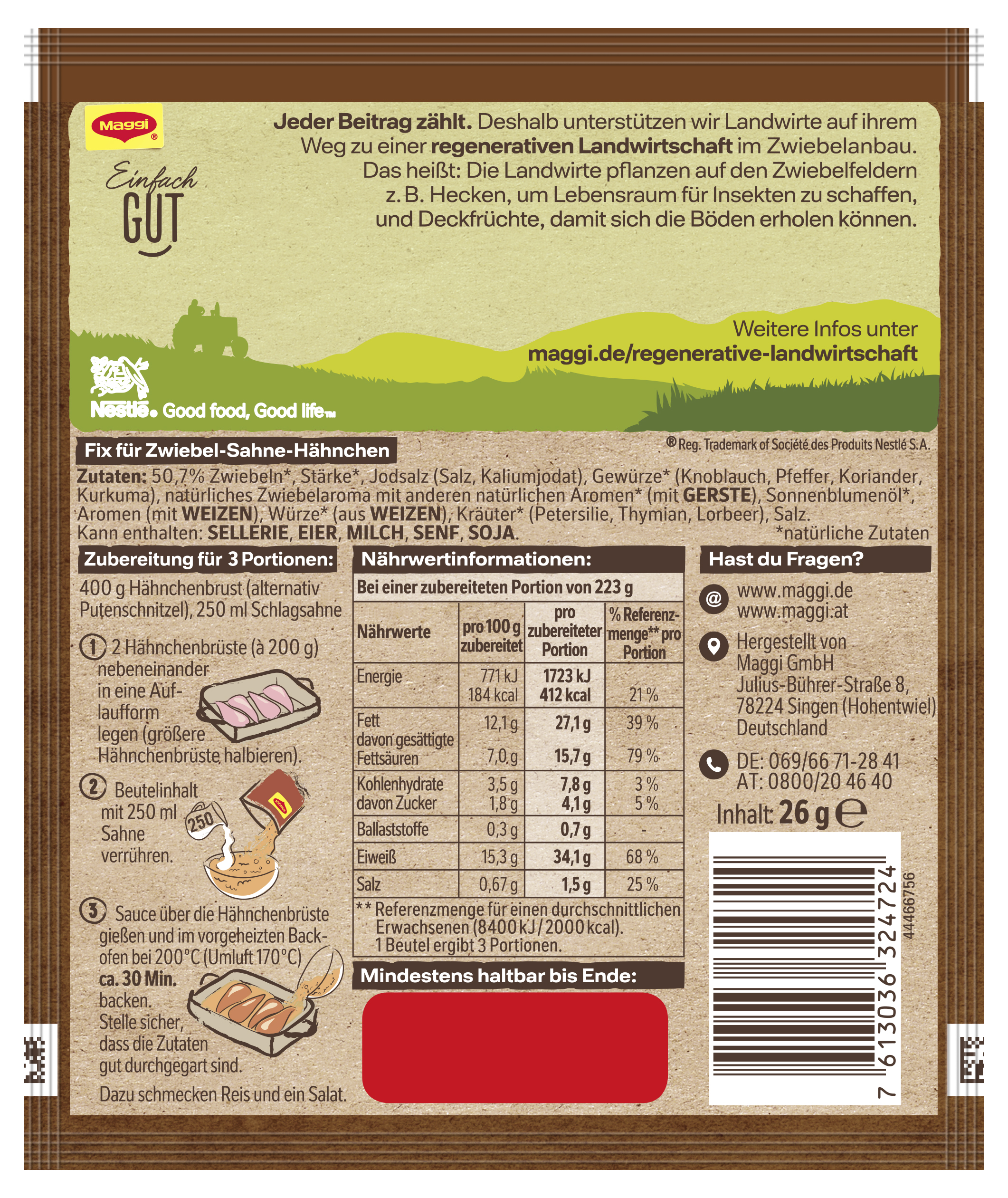 myTime Assortment Yes myTime Article Number 4502070312 myTime Product Title Maggi Fix Zwiebel Sahne Hähnchen EAN 07613036324724 Material Number 12337683 Marke MAGGI Product Name MAGGI FIX Zwiebel Sahne Hähnchen 26g Net Content 26 Net Content UoM GRM Net Weight 26 Net Weight UoM GRM Artikel Höhe 150.000 Artikel Höhe UoM MMT Artikel Breite 127.000 Artikel Breite UoM MMT Artikel Länge 7.000 Artikel Länge UoM MMT Bezeichnung Fix für Zwiebel-Sahne-Hähnchen Beschreibung MAGGI Fix für Zwiebel-Sahne Hähnchen: herzhaftes Gericht in cremiger Sauce Lust auf ein schnelles und leckeres Hähnchen-Gericht aus dem Ofen? Mit dem Maggi Fix mit natürlichen Zutaten* ist das im Handumdrehen möglich. Frische Hähnchenbrust, Schlagsahne und natürlich das MAGGI Fix für Zwiebel-Sahne Hähnchen. Mehr brauchst du nicht für ein leckeres Ofengericht in cremiger Sauce mit Zwiebeln, verfeinert mit Petersilie. Ein ideales Abend- oder Mittagessen für die ganze Familie. Geling- und Genussgarantie Die Rezeptur der MAGGI Würzmischung enthält bereits alle Würz-Zutaten, die für das leckere Geflügelgericht benötigt werden. Die sorgfältig ausgewählten Kräuter und Gewürze sind bestens aufeinander abgestimmt und verleihen den frischen Zutaten die perfekte Würzung. Nachwürzen ist so nicht mehr nötig. Somit sind MAGGI Fix-Produkte der ideale Helfer im Alltag, um Gerichte einfach und schnell zuzubereiten. Was wird zusätzlich zum Fix für Zwiebel-Sahne Hähnchen benötigt? • 400g Hähnchenbrust oder alternativ Putenschnitzel • 250ml Schlagsahne Zubereitung: Hähnchenbrust nebeneinander in eine Auflaufform legen. Beutelinhalt mit 250ml Sahne verrühren. Sauce über die Hähnchenbrust gießen und im vorgeheizten Backofen bei 200°C oder bei Umluft 170°C ca. 30 Minuten backen. Als frische Ergänzung für eine leckere Mahlzeit passen Reis und ein knackiger Salat wunderbar. Zubereitung Zubereitung für 3 Portionen: 400 g Hähnchenbrust (alternativ Putenschnitzel), 250 ml Schlagsahne 1. 2 Hähnchenbrüste (à 200g) nebeneinander in eine Auflaufform legen (größere Hähnchenbrüste halbieren). 2. Beutelinhalt mit 250 ml Sahne verrühren. 3. Sauce über die Hähnchenbrüste gießen und im vorgeheizten Backofen bei 200°C (Umluft 170°C) ca. 30 Min. backen. Stelle sicher, dass die Zutaten gut durchgegart sind. Dazu schmecken Reis und ein Salat. Zutaten Zutaten: 50,7 % Zwiebeln*, Stärke*, Jodsalz (Salz, Kaliumjodat), Gewürze* (Knoblauch, Pfeffer, Koriander, Kurkuma), natürliches Zwiebelaroma mit anderen natürlichen Aromen* (mit GERSTE), Sonnenblumenöl*, Aromen (mit WEIZEN), Würze* (aus WEIZEN), Kräuter* (Petersilie, Thymian, Lorbeer), Salz. Kann enthalten: SELLERIE, EIER, MILCH, SENF, SOJA. *natürliche Zutaten