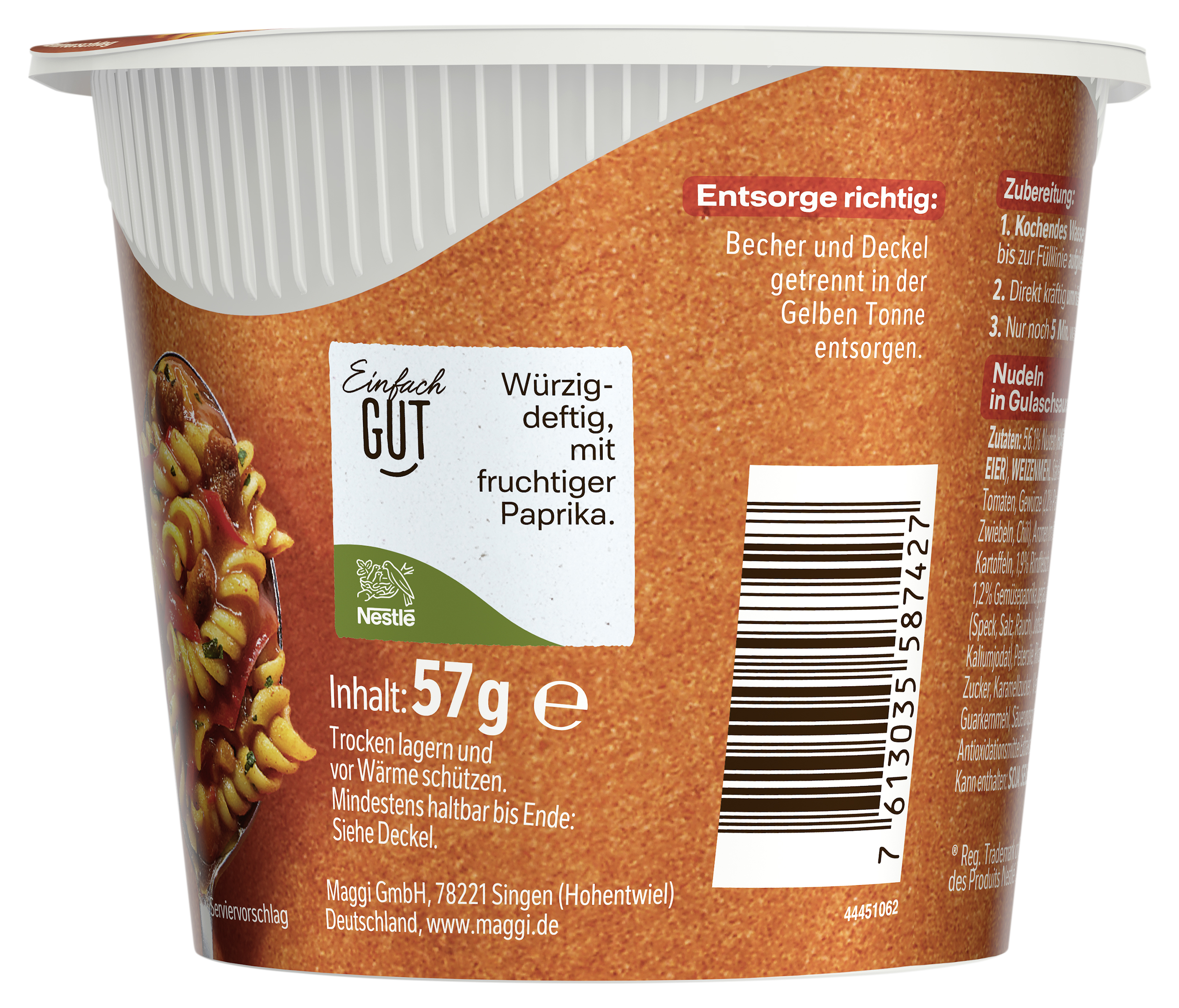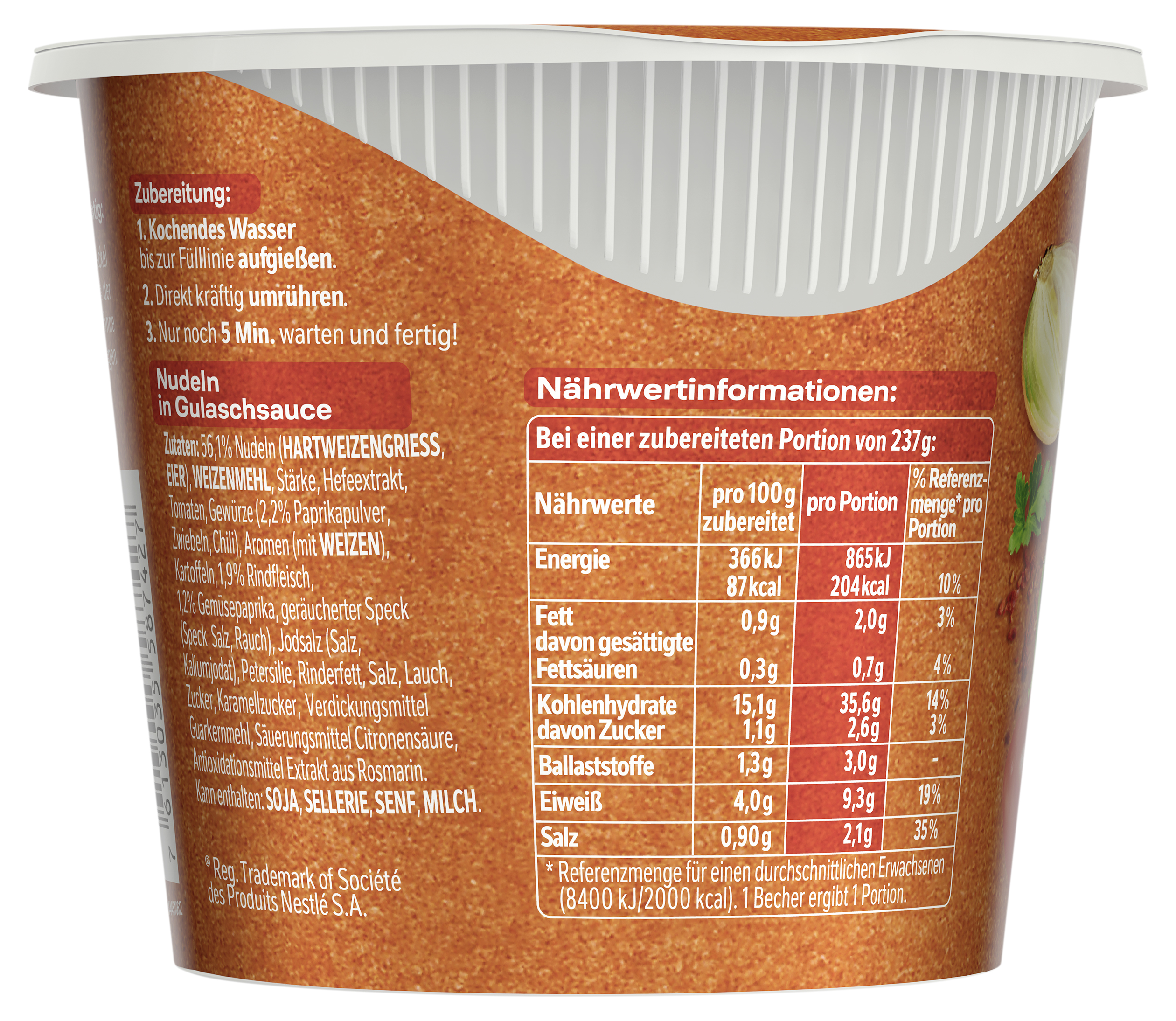 myTime Assortment Yes myTime Article Number 4502050222 myTime Product Title Maggi 5 Minuten Terrine Gulasch Topf EAN 07613035587427 Material Number 12305434 Marke MAGGI Product Name MAGGI 5 MINUTEN TERRINE Gulasch Topf 57g Net Content 57 Net Content UoM GRM Net Weight 57 Net Weight UoM GRM Artikel Höhe 81.000 Artikel Höhe UoM MMT Artikel Breite 98.000 Artikel Breite UoM MMT Artikel Länge 98.000 Artikel Länge UoM MMT Schlagwörter schnelles gericht, gesund, essen, fertig-gericht, fast food, snack, instant, kochen, kalorienarm, bandnudeln, gulasch, lebensmittel, tüten-suppe, convenience, food, noodlecup, festival, camping, produkt, kleine mahlzeit, fertigessen, unterwegs, büro, pasta to go, reise Bezeichnung Nudeln in Gulaschsauce Beschreibung MAGGI 5 Minuten Terrine Gulasch-Topf bringt den beliebten Gulasch-Topf nach ungarischer Art einfach und bequem auf den Tisch. Fans von Gulasch können sich dank der schnellen Zubereitung in nur 5 Minuten auf ihr Lieblingsgericht als Snack für unterwegs oder kleine Mahlzeit daheim freuen. Das schnelle Nudelgericht in würziger Paprikasauce mit pikantem Rindfleisch und Kräutern nach ungarischer Art schmeckt einfach lecker. MAGGI 5 Minuten Terrine Gulaschtopf – ideal für zwischendurch Ein vollgepackter Tag steht an und man hat große Lust auf eine kleine, deftige Mahlzeit? Wie wäre es mit einem herzhaften Pastagericht? Mit der MAGGI 5 Minuten Terrine Gulasch-Topf genießt man in nur fünf Minuten einen leckeren Gulasch-Topf – ungarischer Art, würzig, gut! Ob zuhause, im Büro oder unterwegs, mit der MAGGI 5 Minuten Terrine bereitet man sich ganz einfach, schnell und bequem einen leckeren Gulasch-Topf zu. Um den Gulasch-Topf zuzubereiten, einfach kochendes Wasser bis zur Fülllinie auffüllen. Rühre alles um und lass den Gulasch-Topf 5 Minuten ziehen. Rühre gelegentlich nochmal um. Fertig ist der leckere Nudel-Snack. MAGGI 5 Minuten Terrine Gulasch-Topf: • Ergibt eine leckere Portion. • Nudeln in Paprikasauce mit Rindfleisch nach ungarischer Art. • Der Klassiker für zuhause, im Büro oder unterwegs. • Schnell und unkompliziert in nur 5 Minuten zubereitet. • Das braucht man dazu: 1 Löffel und kochendes Wasser. Zubereitung Zubereitung: 1. Kochendes Wasser bis zur Fülllinie aufgießen. 2. Direkt kräftig umrühren. 3. Nur noch 5 Min. warten und fertig! Zutaten Zutaten: 56,1% Nudeln (HARTWEIZENGRIESS, EIER), WEIZENMEHL, Stärke, Hefeextrakt, Tomaten, Gewürze (2,2% Paprikapulver, Zwiebeln, Chili), Aromen (mit WEIZEN), Kartoffeln, 1,9% Rindfleisch, 1,2% Gemüsepaprika, geräucherter Speck (Speck, Salz, Rauch), Jodsalz (Salz, Kaliumjodat), Petersilie, Rinderfett, Salz, Lauch, Zucker, Karamellzucker, Verdickungsmittel Guarkernmehl, Säuerungsmittel Citronensäure, Antioxidationsmittel Extrakt aus Rosmarin. Kann enthalten: SOJA, SELLERIE, SENF, MILCH.