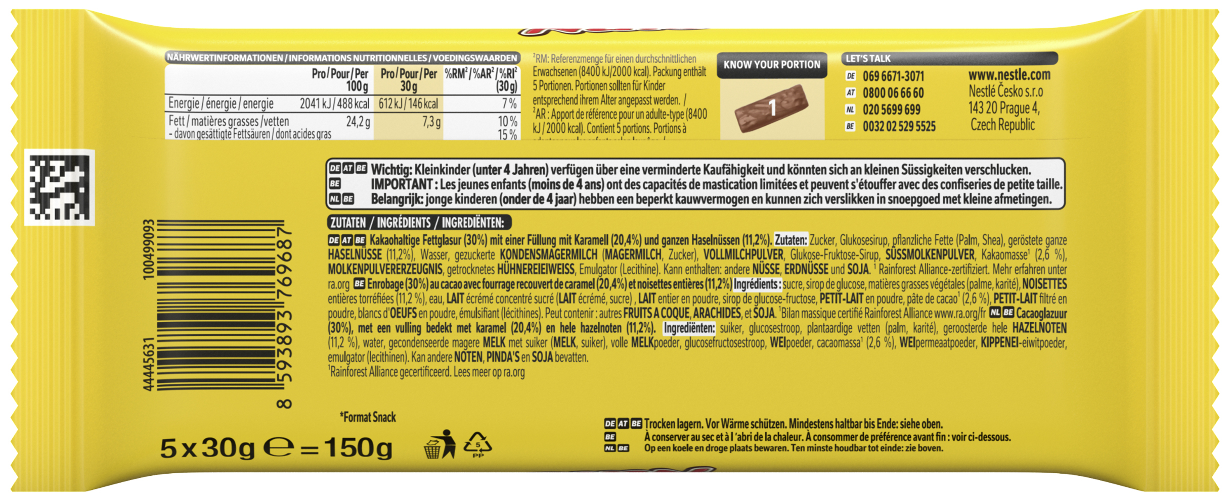 Sub Brand Name NUTS Brand Owner Name Société des Produits Nestlé S.A. Functional Name Schokoladenriegel Country of Origin Czech Republic Allergen Statement Haselnüsse, Kondensmagermilch, Magermilch, Vollmilchpulver, Süßmolkenpulver, Molkenpulvererzeugnis, Hühnereieiweiß Haltbarkeit & Lagerung Trocken lagern. Vor Wärme schützen. Anwendungs- & Gebrauchshinweise Portionen sollten für Kinder entsprechend ihrem Alter angepasst werden. Third Party Accreditation RAINFOREST_ALLIANCE_PEOPLE_NATURE Nutritional Table 1 Zubereitungsgrad Bezugsgröße Portionsgröße Portionsgröße Beschreibung Tagesdosis Referenzwert Nährstoff: Teil von… Messgenauigkeit Nährwert % Messgenauigkeit % Referenzmenge UNPREPARED100GRMENER-EnergieAPPROXIMATELY2041kJ UNPREPARED100GRMENER-EnergieAPPROXIMATELY488kCal UNPREPARED100GRMFATFettAPPROXIMATELY24.2g UNPREPARED100GRMFASATFett, davon gesättigte FettsäurenAPPROXIMATELY9.9g UNPREPARED100GRMCHOAVLKohlenhydrateAPPROXIMATELY61.6g UNPREPARED100GRMSUGAR-Kohlenhydrate, davon ZuckerAPPROXIMATELY53.1g UNPREPARED100GRMFIBTGBallaststoffeAPPROXIMATELY1.7g UNPREPARED100GRMPRO-EiweißAPPROXIMATELY4.8g UNPREPARED100GRMSALTEQSalz ÄquivalentAPPROXIMATELY0.17g Nutritional Table 2 Zubereitungsgrad Bezugsgröße Portionsgröße Portionsgröße Beschreibung Tagesdosis Referenzwert Nährstoff: Teil von… Messgenauigkeit Nährwert % Messgenauigkeit % Referenzmenge UNPREPARED1PTN30GRMReferenzmenge für einen durchschnittlichen Erwachsenen (8400 kJ/ 2000 kcal).ENER-EnergieAPPROXIMATELY612kJ7 UNPREPARED1PTN30GRMReferenzmenge für einen durchschnittlichen Erwachsenen (8400 kJ/ 2000 kcal).ENER-EnergieAPPROXIMATELY146kCal7 UNPREPARED1PTN30GRMReferenzmenge für einen durchschnittlichen Erwachsenen (8400 kJ/ 2000 kcal).FATFettAPPROXIMATELY7.3g10 UNPREPARED1PTN30GRMReferenzmenge für einen durchschnittlichen Erwachsenen (8400 kJ/ 2000 kcal).FASATFett, davon gesättigte FettsäurenAPPROXIMATELY3.0g15 UNPREPARED1PTN30GRMReferenzmenge für einen durchschnittlichen Erwachsenen (8400 kJ/ 2000 kcal).CHOAVLKohlenhydrateAPPROXIMATELY18.5g7 UNPREPARED1PTN30GRMReferenzmenge für einen durchschnittlichen Erwachsenen (8400 kJ/ 2000 kcal).SUGAR-Kohlenhydrate, davon ZuckerAPPROXIMATELY15.9g18 UNPREPARED1PTN30GRMReferenzmenge für einen durchschnittlichen Erwachsenen (8400 kJ/ 2000 kcal).FIBTGBallaststoffeAPPROXIMATELY0.5g UNPREPARED1PTN30GRMReferenzmenge für einen durchschnittlichen Erwachsenen (8400 kJ/ 2000 kcal).PRO-EiweißAPPROXIMATELY1.4g3 UNPREPARED1PTN30GRMReferenzmenge für einen durchschnittlichen Erwachsenen (8400 kJ/ 2000 kcal).SALTEQSalz ÄquivalentAPPROXIMATELY0.05g1 Contact Nestlé Česko s.r.o Contact Address 143 20 Prague 4, Czech Republic