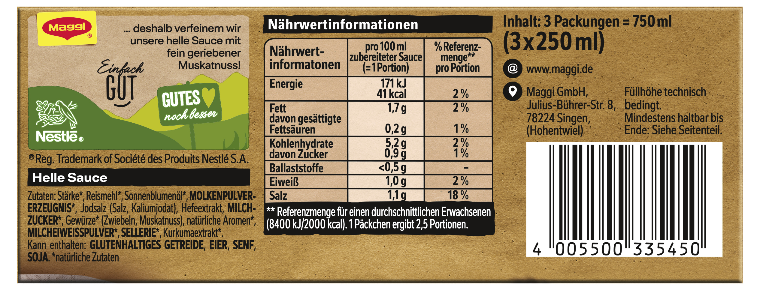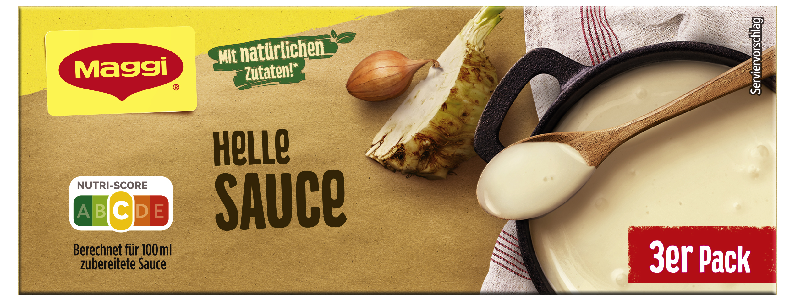 myTime Assortment Yes myTime Article Number 4502070399 myTime Product Title Maggi Helle Sauce EAN 04005500335450 Material Number 11801485 Marke MAGGI Product Name MAGGI Helle Sauce 3er Multipack, ergibt 750ml Net Content Statement 3 x 250ml Net Content 0.75 Net Content UoM LTR Net Weight 75 Net Weight UoM GRM Artikel Höhe 55.000 Artikel Höhe UoM MMT Artikel Breite 146.000 Artikel Breite UoM MMT Artikel Länge 27.000 Artikel Länge UoM MMT Schlagwörter Fertigsauce, Knorr Bezeichnung Helle Sauce Beschreibung Heute steht ein Gemüsegericht auf dem Speiseplan, ein leckerer Auflauf oder Geflügel? Dazu darf eine helle Sauce nicht fehlen! Mit Maggi Helle Sauce lässt sich im Handumdrehen eine cremige weiße Sauce kreieren. Die ideale Sauce zu Fisch, Fleisch- und Gemüsegerichten Eine harmonisch abgeschmeckte weiße Sauce rundet das Gemüse-, Fleisch- und Fischgericht perfekt ab. Ob zu Blumenkohl, Broccoli, hellem Fleisch oder Fisch – mit einer leckeren Sauce erhalten die Gerichte ihr gewisses Etwas. Nutze die individuell verfeinerte Helle Sauce von Maggi zum Beispiel für Gemüseaufläufe, Eiergerichte oder Hühnerfrikassee. Natürlich schmeckt die Sauce auch zu Fisch wunderbar. Einfach den Inhalt eines Einzelpäckchens Maggi Helle Sauce in 250ml heißes Wasser oder anfallende Flüssigkeit mit dem Schneebesen einrühren. Sauce aufkochen lassen. Die weiße Sauce mit Schlagsahne, Milch, Kräutern oder Käse verfeinern. Schon ist die leckere Sauce fertig. Am besten in ein Saucen-Kännchen füllen oder direkt auf dem Teller servieren. Zubereitung Zubereitung: Inhalt eines Einzelpäckchens in 250ml heißes, nicht kochendes Wasser mit dem Schneebesen einrühren. Sauce aufkochen und bei geringer Wärmezufuhr 3 Min. kochen. Gelegentlich umrühren. Tipp: Besonders lecker wirds durch Einrühren in anfallende Flüssigkeit. Zutaten Zutaten: Stärke*, Reismehl*, Sonnenblumenöl*, MOLKENPULVERERZEUGNIS*, Jodsalz (Salz, Kaliumjodat), Hefeextrakt, MILCHZUCKER*, Gewürze* (Zwiebeln, Muskatnuss), natürliche Aromen*, MILCHEIWEISSPULVER*, SELLERIE*, Kurkumaextrakt*.