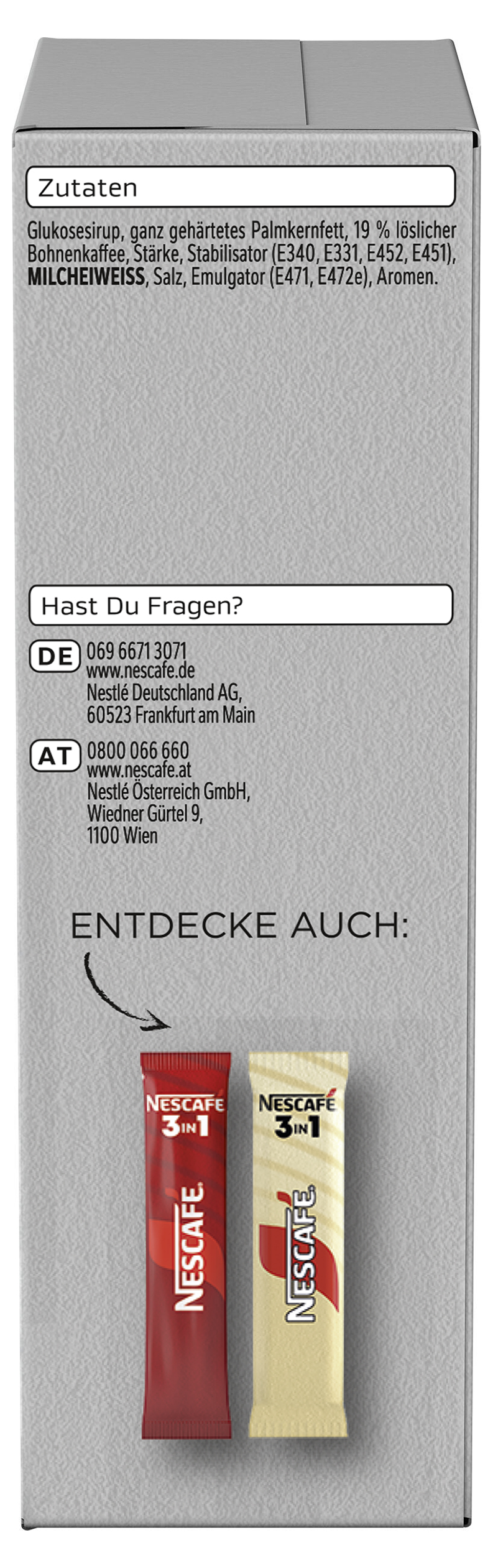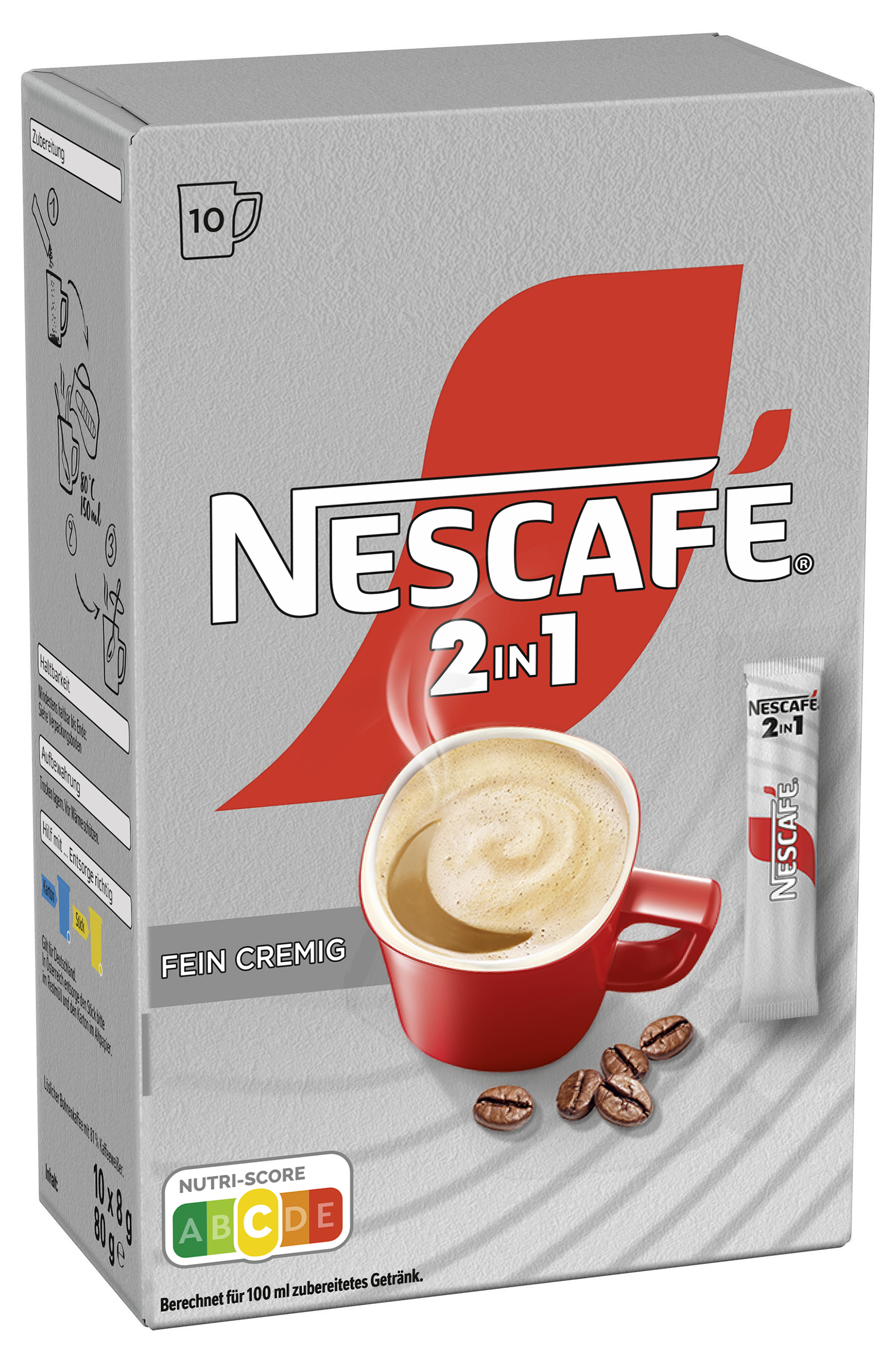 myTime Assortment Yes myTime Article Number 4502090624 myTime Product Title Nescafé Sticks 2in1 EAN 07613036960298 Material Number 12470949 Marke NESCAFE Product Name NESCAFE 2IN1 Sticks (10x8g) Net Content Statement 10 x 8g Net Content 80.000 Net Content UoM GRM Net Weight 80 Net Weight UoM GRM Artikel Höhe 145.000 Artikel Höhe UoM MMT Artikel Breite 93.000 Artikel Breite UoM MMT Artikel Länge 47.000 Artikel Länge UoM MMT Schlagwörter kaffee, löslich ,sticks ,kaffee pulver ,kaffeestiks ,löslicher kaffee ,löslicher ,kaffee sticks ,nescafe ,löslicher kaffee ,nescafe 2 in 1 kaffee mit Creamer coffee sticks ,löskaffee 2in1 kaffee ,instant-kaffee ,instant ,kaffee sticks ,kaffeesticks Bezeichnung Löslicher Bohnenkaffee mit 81 % Kaffeeweißer. Beschreibung Nescafé 2-in-1 Getränkepulver-Sticks sind die richtige Wahl für Kaffeeliebhaber, die ihren Kaffee nicht nur schwarz trinken und sich eine einfache Zubereitung wünschen. Ganz egal, ob zu Hause oder unterwegs – Nescafé 2-in-1 bietet Ihnen eine fertige Mischung aus Kaffee und Creamer, praktisch in Einzelportionssticks verpackt. Qualität und Zubereitung: Die Mischung macht's - NESCAFÉ 2-in-1 ist eine lösliche Kaffeemischung, die aus erlesenen Kaffeebohnen mit mittlerer Röstung und Creamer hergestellt ist. Genießen Sie diese besondere Kombination, abgerundet durch eine feine Schicht Crema in der Tasse. Starten Sie Ihren Tag so lecker wie einfach mit den Nescafé 2-in-1 Getränkepulver-Sticks. Zubereitung Zubereitung: 1. Beutelinhalt in eine Tasse geben. 2. 150ml heißes Wasser (80°C) hinzugeben. 3. Umrühren und genießen! Zutaten Zutaten: Glukosesirup, ganz gehärtetes Palmkernfett, 19% löslicher Bohnenkaffee, Stärke, Stabilisator (E340, E331, E452, E451), MILCHEIWEISS, Salz, Emulgator (E471, E472e), Aromen.