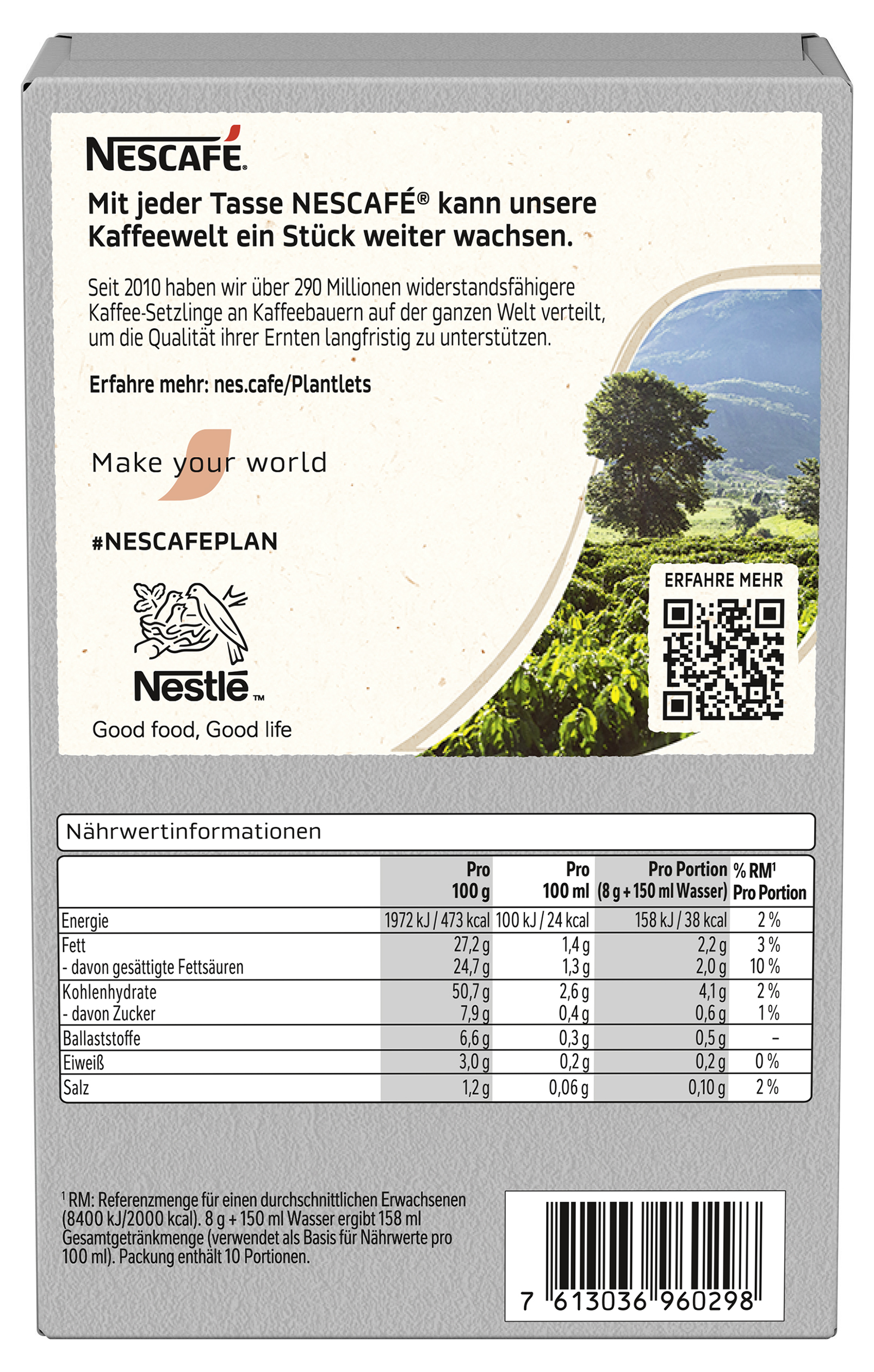 Sub Brand Name 2IN1 Brand Owner Name Société des Produits Nestlé S.A. Functional Name Instantkaffee Country of Origin Hungary Allergen Statement Milcheiweiß Haltbarkeit & Lagerung Trocken lagern. Vor Wärme schützen. Third Party Accreditation GREEN_DOT Nutritional Table 1 Zubereitungsgrad Bezugsgröße Portionsgröße Portionsgröße Beschreibung Tagesdosis Referenzwert Nährstoff: Teil von… Messgenauigkeit Nährwert % Messgenauigkeit % Referenzmenge PREPARED100MLT8g + 150ml Wasser ergibt 158ml Gesamtgetränkmenge (verwendet als Basis für Nährwerte pro 100ml)ENER-EnergieAPPROXIMATELY100kJ PREPARED100MLT8g + 150ml Wasser ergibt 158ml Gesamtgetränkmenge (verwendet als Basis für Nährwerte pro 100ml)ENER-EnergieAPPROXIMATELY24kCal PREPARED100MLT8g + 150ml Wasser ergibt 158ml Gesamtgetränkmenge (verwendet als Basis für Nährwerte pro 100ml)FATFettAPPROXIMATELY1.4g PREPARED100MLT8g + 150ml Wasser ergibt 158ml Gesamtgetränkmenge (verwendet als Basis für Nährwerte pro 100ml)FASATFett, davon gesättigte FettsäurenAPPROXIMATELY1.3g PREPARED100MLT8g + 150ml Wasser ergibt 158ml Gesamtgetränkmenge (verwendet als Basis für Nährwerte pro 100ml)CHOAVLKohlenhydrateAPPROXIMATELY2.6g PREPARED100MLT8g + 150ml Wasser ergibt 158ml Gesamtgetränkmenge (verwendet als Basis für Nährwerte pro 100ml)SUGAR-Kohlenhydrate, davon ZuckerAPPROXIMATELY0.4g PREPARED100MLT8g + 150ml Wasser ergibt 158ml Gesamtgetränkmenge (verwendet als Basis für Nährwerte pro 100ml)FIBTGBallaststoffeAPPROXIMATELY0.3g PREPARED100MLT8g + 150ml Wasser ergibt 158ml Gesamtgetränkmenge (verwendet als Basis für Nährwerte pro 100ml)PRO-EiweißAPPROXIMATELY0.2g PREPARED100MLT8g + 150ml Wasser ergibt 158ml Gesamtgetränkmenge (verwendet als Basis für Nährwerte pro 100ml)SALTEQSalz ÄquivalentAPPROXIMATELY0.06g Nutritional Table 2 Zubereitungsgrad Bezugsgröße Portionsgröße Portionsgröße Beschreibung Tagesdosis Referenzwert Nährstoff: Teil von… Messgenauigkeit Nährwert % Messgenauigkeit % Referenzmenge PREPARED1PTN8g + 150ml WasserReferenzmenge für einen durchschnittlichen Erwachsenen (8400 kJ/ 2000 kcal).ENER-EnergieAPPROXIMATELY158kJ2 PREPARED1PTN8g + 150ml WasserReferenzmenge für einen durchschnittlichen Erwachsenen (8400 kJ/ 2000 kcal).ENER-EnergieAPPROXIMATELY38kCal2 PREPARED1PTN8g + 150ml WasserReferenzmenge für einen durchschnittlichen Erwachsenen (8400 kJ/ 2000 kcal).FATFettAPPROXIMATELY2.2g3 PREPARED1PTN8g + 150ml WasserReferenzmenge für einen durchschnittlichen Erwachsenen (8400 kJ/ 2000 kcal).FASATFett, davon gesättigte FettsäurenAPPROXIMATELY2.0g10 PREPARED1PTN8g + 150ml WasserReferenzmenge für einen durchschnittlichen Erwachsenen (8400 kJ/ 2000 kcal).CHOAVLKohlenhydrateAPPROXIMATELY4.1g2 PREPARED1PTN8g + 150ml WasserReferenzmenge für einen durchschnittlichen Erwachsenen (8400 kJ/ 2000 kcal).SUGAR-Kohlenhydrate, davon ZuckerAPPROXIMATELY0.6g1 PREPARED1PTN8g + 150ml WasserReferenzmenge für einen durchschnittlichen Erwachsenen (8400 kJ/ 2000 kcal).FIBTGBallaststoffeAPPROXIMATELY0.5g PREPARED1PTN8g + 150ml WasserReferenzmenge für einen durchschnittlichen Erwachsenen (8400 kJ/ 2000 kcal).PRO-EiweißAPPROXIMATELY0.2g0 PREPARED1PTN8g + 150ml WasserReferenzmenge für einen durchschnittlichen Erwachsenen (8400 kJ/ 2000 kcal).SALTEQSalz ÄquivalentAPPROXIMATELY0.10g2 Nutritional Table 3 Zubereitungsgrad Bezugsgröße Portionsgröße Portionsgröße Beschreibung Tagesdosis Referenzwert Nährstoff: Teil von… Messgenauigkeit Nährwert % Messgenauigkeit % Referenzmenge UNPREPARED100GRMENER-EnergieAPPROXIMATELY1972kJ UNPREPARED100GRMENER-EnergieAPPROXIMATELY473kCal UNPREPARED100GRMFATFettAPPROXIMATELY27.2g UNPREPARED100GRMFASATFett, davon gesättigte FettsäurenAPPROXIMATELY24.7g UNPREPARED100GRMCHOAVLKohlenhydrateAPPROXIMATELY50.7g UNPREPARED100GRMSUGAR-Kohlenhydrate, davon ZuckerAPPROXIMATELY7.9g UNPREPARED100GRMFIBTGBallaststoffeAPPROXIMATELY6.6g UNPREPARED100GRMPRO-EiweißAPPROXIMATELY3.0g UNPREPARED100GRMSALTEQSalz ÄquivalentAPPROXIMATELY1.2g Contact Nestlé Deutschland AG Contact Address 60523 Frankfurt am Main