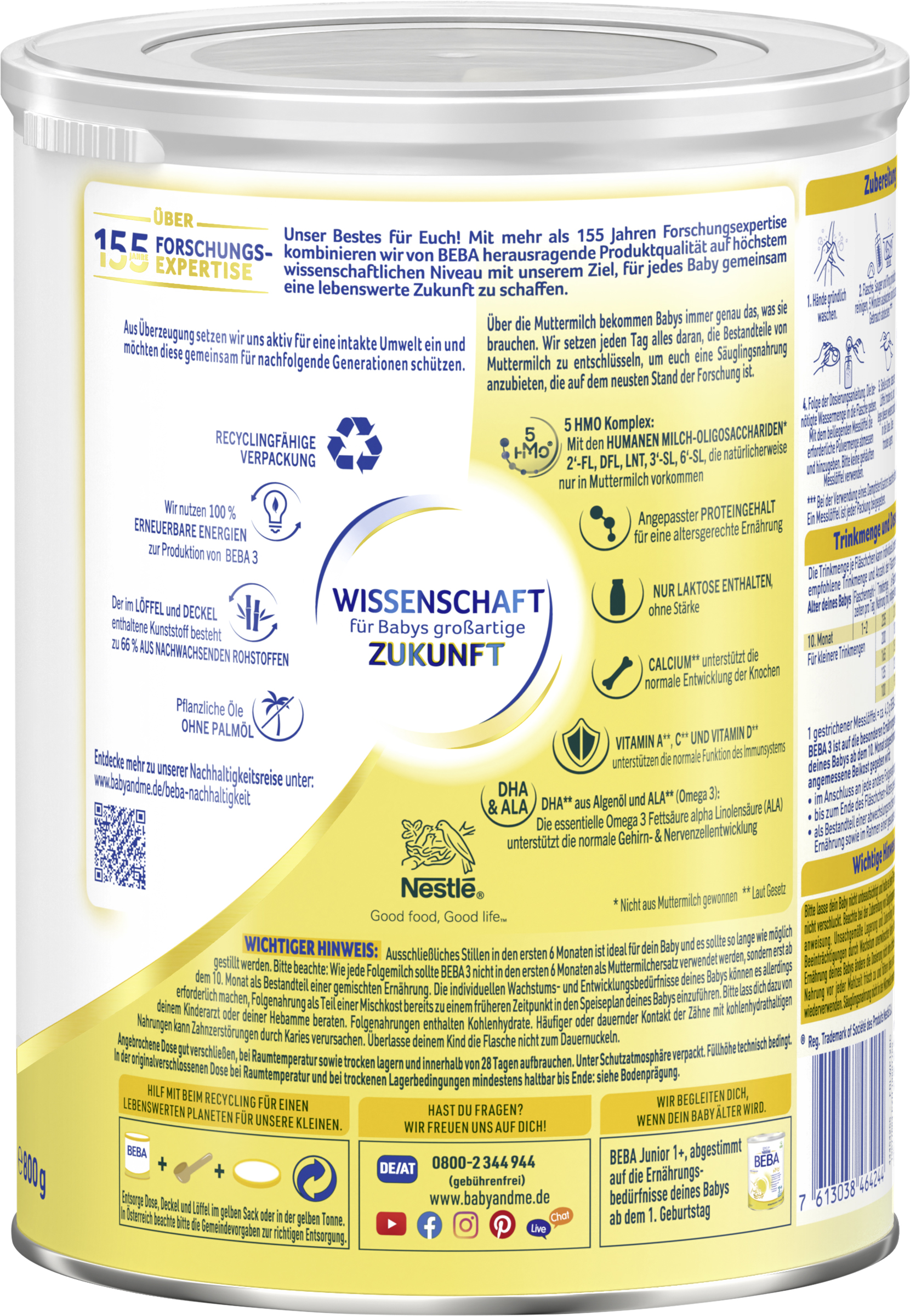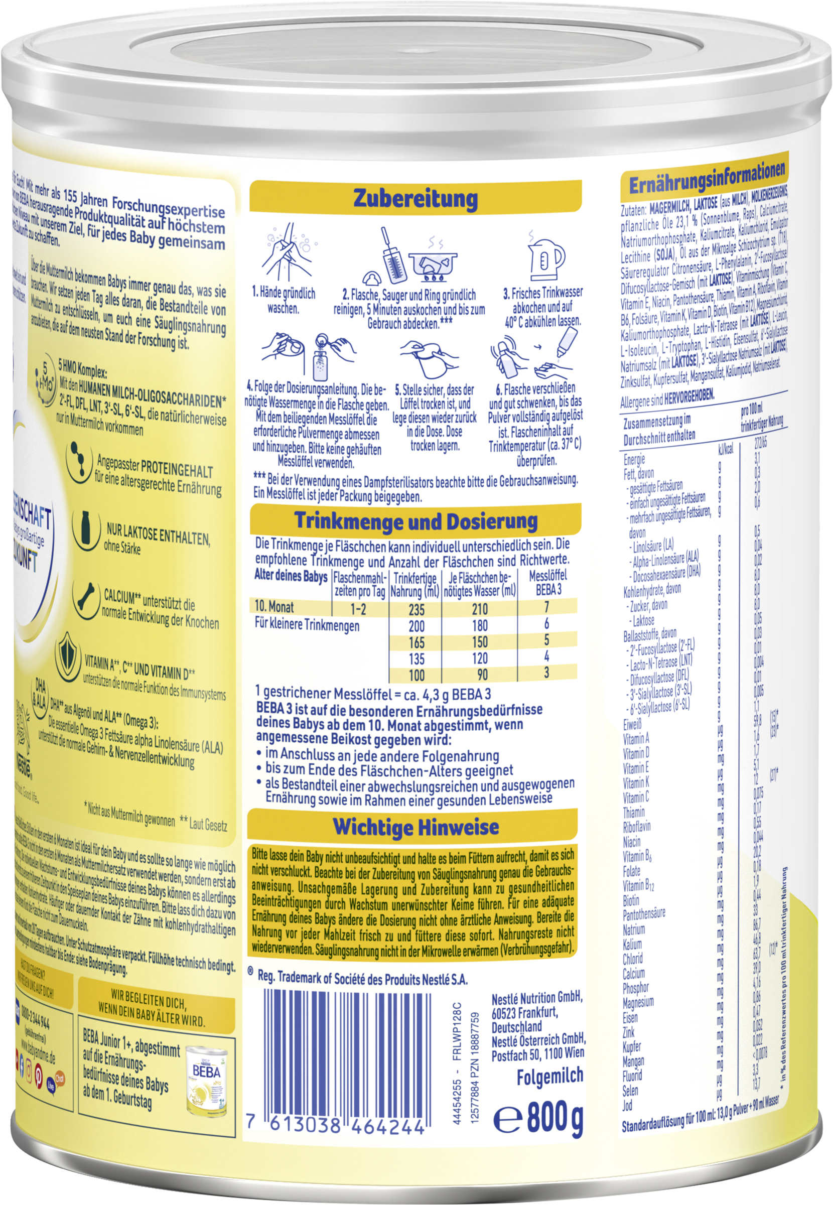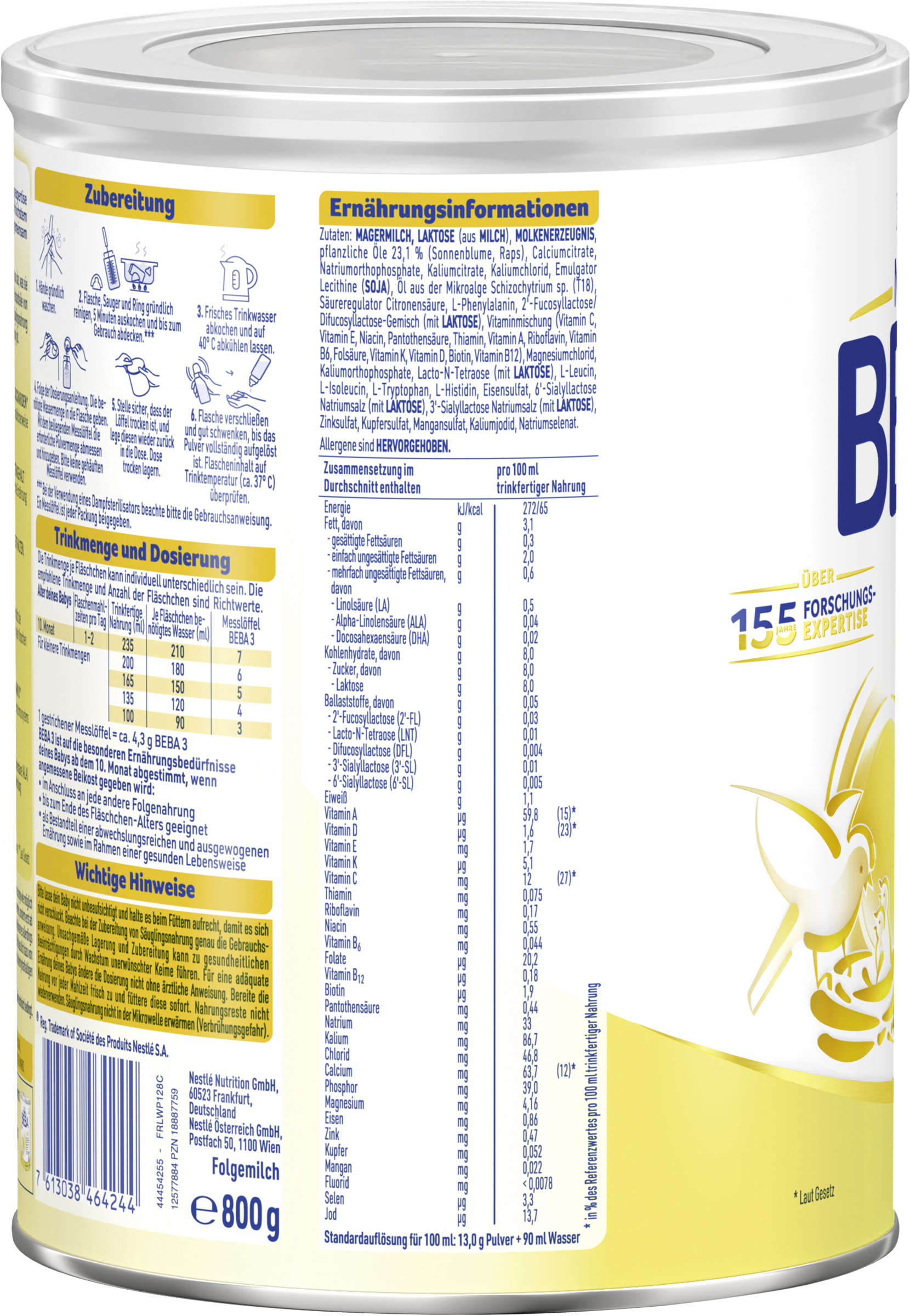 myTime Assortment Yes myTime Article Number 4502131251 EAN 07613038464244 Material Number 12577884 Marke NESTLE Product Name BEBA 3 Folgemilch ab dem 10. Monat 800g Net Content 800.000 Net Content UoM GRM Net Weight 800 Net Weight UoM GRM Artikel Höhe 167.000 Artikel Höhe UoM MMT Artikel Breite 134.000 Artikel Breite UoM MMT Artikel Länge 134.000 Artikel Länge UoM MMT Schlagwörter babymilch, geburt, kindermilch, Nahrung, milchnahrung, milchpulver, pulver, trinkmahlzeit, trinknahrung, Calcium Bezeichnung Folgemilch Beschreibung Unser Bestes für Euch! Mit mehr als 155 Jahren Forschungsexpertise kombinieren wir von BEBA herausragende Produktqualität auf höchstem wissenschaftlichem Niveau mit unserem Ziel, für jedes Baby gemeinsam eine lebenswerte Zukunft zu schaffen. BEBA 3 Folgemilch ist auf die Bedürfnisse deines Babys ab dem 10. Monat abgestimmt. Warum BEBA 3 Folgemilch? - 5 HMO Komplex (Humane Milch-Olisaccharide), die natürlicherweise nur in Muttermilch vorkommen (nicht aus Muttermilch gewonnen) - Stufenkonzept mit bedarfsgerecht gesenktem Proteingehalt angepasst an das Alter / die Bedürfnisse deines Babys - Nur Laktose enthalten, ohne Stärke - Calcium* unterstützt die normale Entwicklung der Knochen - Vitamine A*,C*und D* unterstützen eine normale Funktion des Immunsystems - DHA* aus Algenöl sowie ALA* (Omega-3 Fettsäuren). ALA* unterstützt eine normale Gehirn- & Nervenentwicklung - Enthält pflanzliche Öle ohne Palmöl Zubereitung Wichtige Hinweise: Beachte bei der Zubereitung von Säuglingsnahrung genau die Gebrauchsanweisung. Unsachgemäße Lagerung und Zubereitung kann zu gesundheitlichen Beeinträchtigungen durch Wachstum unerwünschter Keime führen. Für eine adäquate Ernährung deines Babys ändere die Dosierung nicht ohne ärztliche Anweisung. Bereite die Nahrung vor jeder Mahlzeit frisch zu und füttere diese sofort. Nahrungsreste nicht wiederverwenden. Flasche, Sauger und Ring gründlich reinigen und 5 Minuten auskochen. Säuglingsnahrung nicht in der Mikrowelle erwärmen (Verbrühungsgefahr). Zubereitung: 1. Hände gründlich waschen. 2. Flasche, Sauger und Ring gründlich reinigen, 5 Minuten auskochen und bis zum Gebrauch abdecken.* 3. Frisches Trinkwasser abkochen und auf 40°C abkühlen lassen. 4. Folge der Dosierungsanleitung. Die benötigte Wassermenge in die Flasche geben. Mit dem beiliegenden Messlöffel die erforderliche Pulvermenge abmessen und hinzugeben. Bitte keine gehäuften Messlöffel verwenden. 5. Stelle sicher, dass der Löffel trocken ist, und lege diesen zurück in die Dose. Dose trocken lagern. 6. Flasche verschließen und gut schwenken, bis das Pulver vollständig aufgelöst ist. Flascheninhalt auf Trinktemperatur (ca. 37°C) überprüfen. *Bei der Verwendung eines Dampfsterilisators beachte bitte die Gebrauchsanweisung. Ein Messlöffel ist jeder Packung beigegeben. Zutaten Zutaten: MAGERMILCH, LAKTOSE (aus MILCH), MOLKENERZEUGNIS, pflanzliche Öle 23,1 % (Sonnenblume, Raps), Calciumcitrate, Natriumorthophosphate, Kaliumcitrate, Kaliumchlorid, Emulgator Lecithine (SOJA), Öl aus der Mikroalge Schizochytrium sp. (T18), Säureregulator Citronensäure, L-Phenylalanin, 2‘-Fucosyllactose/Difucosyllactose-Gemisch (mit LAKTOSE), Vitaminmischung (Vitamin C, Vitamin E, Niacin, Pantothensäure, Thiamin, Vitamin A, Riboflavin, Vitamin B6, Folsäure, Vitamin K, Vitamin D, Biotin, Vitamin B12), Magnesiumchlorid, Kaliumorthophosphate, Lacto-N-Tetraose (mit LAKTOSE), L-Leucin, L-Isoleucin, L-Tryptophan, L-Histidin, Eisensulfat, 6'-Sialyllactose Natriumsalz (mit LAKTOSE), 3'-Sialyllactose Natriumsalz (mit LAKTOSE), Zinksulfat, Kupfersulfat, Mangansulfat, Kaliumjodid, Natriumselenat.