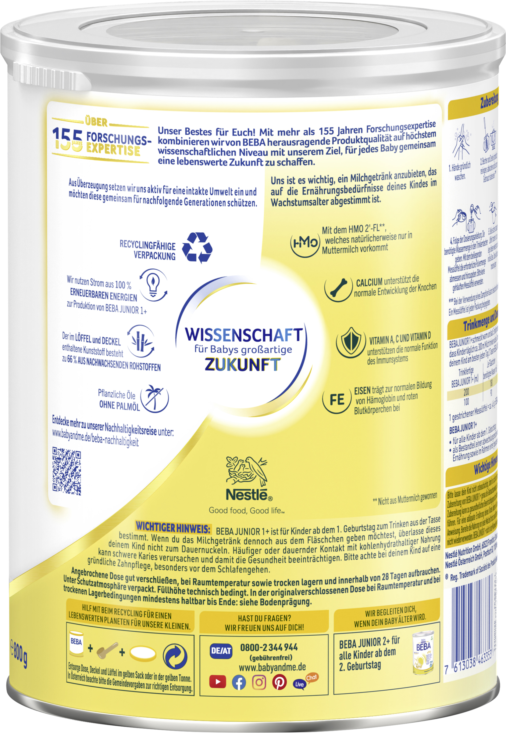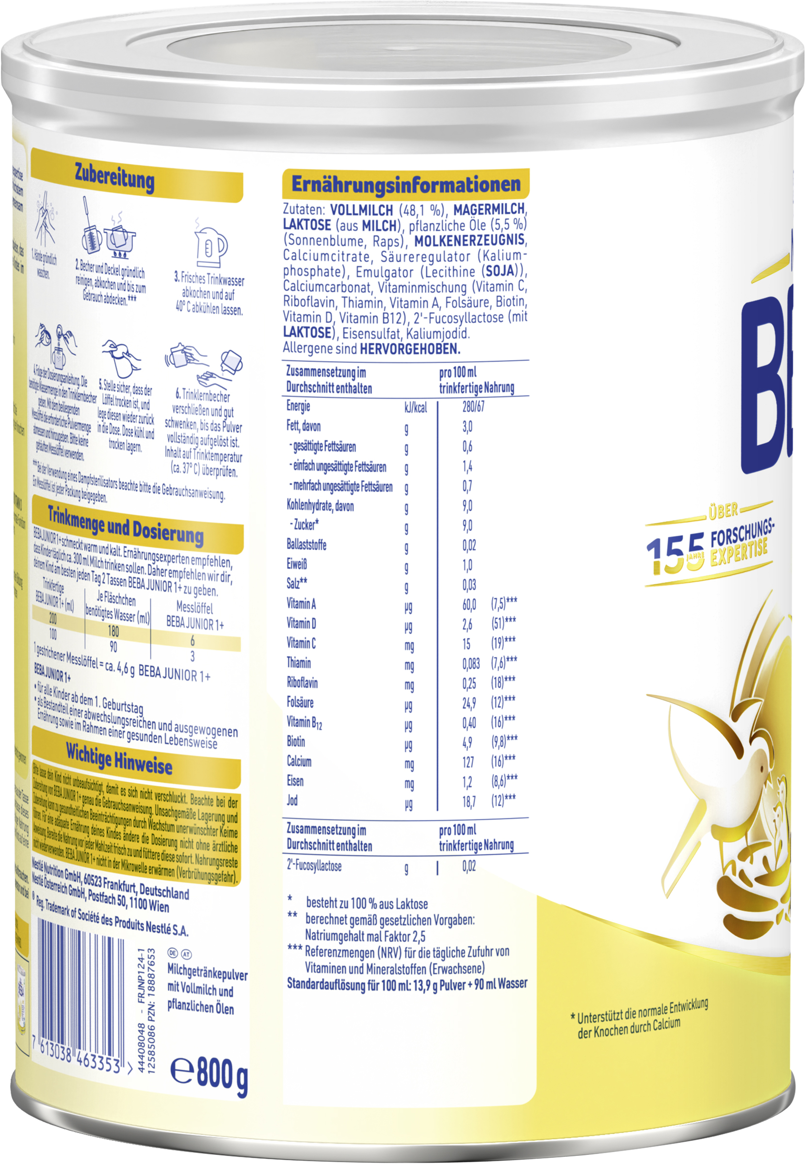 myTime Assortment Yes myTime Article Number 4502131252 myTime Product Title BEBA Junior 1+ Milchgetränk ab dem 1. Geburtstag EAN 07613038463353 Material Number 12585086 Marke NESTLE Product Name BEBA JUNIOR 1 Milchgetränk ab dem 1. Geburtstag, 800g Net Content 800.000 Net Content UoM GRM Net Weight 800 Net Weight UoM GRM Artikel Höhe 167.000 Artikel Höhe UoM MMT Artikel Breite 133.000 Artikel Breite UoM MMT Artikel Länge 133.000 Artikel Länge UoM MMT Schlagwörter Kindermilch, Kindermilch ab 1 Jahr, Kindermilch 1 Jahr, Milchgetränk, Kindermilch 1, Junior, Juniormilch, Milchpulver, Fläschchen Bezeichnung Milchgetränkepulver mit Vollmilch und pflanzlichen Ölen Beschreibung Unser Bestes für Euch! Mit mehr als 155 Jahren Forschungsexpertise kombinieren wir von BEBA herausragende Produktqualität auf höchstem wissenschaftlichem Niveau mit unserem Ziel, für jedes Baby gemeinsam eine lebenswerte Zukunft zu schaffen. BEBA Junior 1+ Milchgetränk ist auf die Bedürfnisse deines Babys ab dem 1. Geburtstag abgestimmt. Warum BEBA Junior 1+ Milchgetränk? - Mit dem Humanen Milch-Oligosaccharid 2'-FL, das natürlicherweise nur in Muttermilch vorkommt - nicht aus Muttermilch gewonnen - Mit altersgerechtem Proteingehalt - Calcium unterstützt die normale Entwicklung der Knochen - Vitamin A, C und D unterstützen die normale Funktion des Immunsystems - Eisen trägt zur normalen Bildung von roten Blutkörperchen und Hämoglobin bei - Enthält pflanzliche Öle ohne Palmöl Zubereitung Wichtige Hinweise: Beachte bei der Zubereitung von BEBA JUNIOR 1+ genau die Gebrauchsanweisung. Unsachgemäße Lagerung und Zubereitung kann zu gesundheitlichen Beeinträchtigungen durch Wachstum unerwünschter Keime führen. Für eine adäquate Ernährung deines Kindes ändere die Dosierung nicht ohne ärztliche Anweisung. Bereite die Nahrung vor jeder Mahlzeit frisch zu und füttere diese sofort. Nahrungsreste nicht wiederverwenden. BEBA JUNIOR 1+ nicht in der Mikrowelle erwärmen (Verbrühungsgefahr). Zubereitung: 1. Hände gründlich waschen. 2. Becher und Deckel gründlich reinigen, abkochen und bis zum Gebrauch abdecken.* 3. Frisches Trinkwasser abkochen und auf 40°C abkühlen lassen. 4. Folge der Dosierungsanleitung. Die benötigte Wassermenge in den Trinklernbecher geben. Mit dem beiliegenden Messlöffel die erforderliche Pulvermenge abmessen und hinzugeben. Bitte keine gehäuften Messlöffel verwenden. 5. Stelle sicher, dass der Löffel trocken ist, und lege diesen wieder zurück in die Dose. Dose kühl und trocken lagern. 6. Trinklernbecher verschließen und gut schwenken, bis das Pulver vollständig aufgelöst ist. Inhalt auf Trinktemperatur (ca. 37°C) überprüfen. *Bei der Verwendung eines Dampfsterilisators beachte bitte die Gebrauchsanweisung. Ein Messlöffel ist jeder Packung beigegeben. Zutaten Zutaten: VOLLMILCH (48,1 %), MAGERMILCH, LAKTOSE (aus MILCH), pflanzliche Öle (5,5 %) (Sonnenblume, Raps), MOLKENERZEUGNIS, Calciumcitrate, Säureregulator (Kaliumphosphate), Emulgator (Lecithine (SOJA)), Calciumcarbonat, Vitaminmischung (Vitamin C, Riboflavin, Thiamin, Vitamin A, Folsäure, Biotin, Vitamin D, Vitamin B12), 2'-Fucosyllactose (mit LAKTOSE), Eisensulfat, Kaliumjodid.