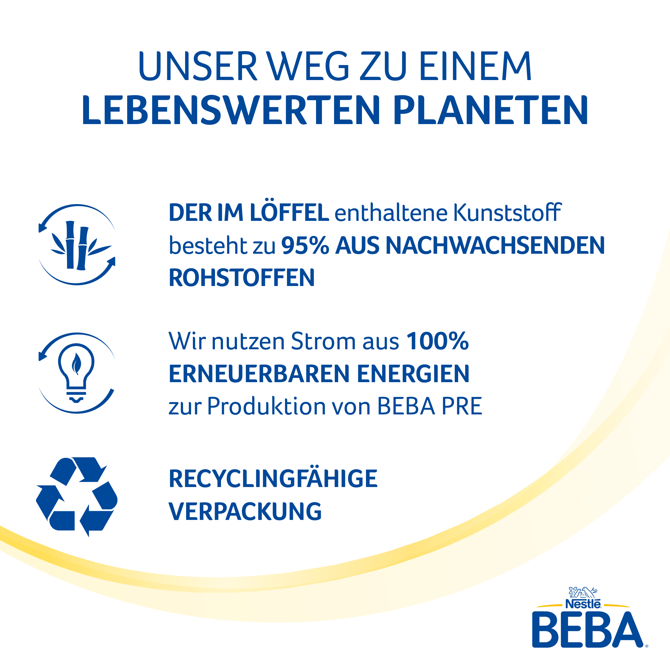 myTime Assortment Yes myTime Article Number 4502131641 myTime Product Title BEBA Pre Anfangsmilch von Geburt an EAN 08445291643635 Material Number 12609166 Marke NESTLE Product Name BEBA PRE Anfangsmilch von Geburt an, 1200g Net Content 1200.000 Net Content UoM GRM Net Weight 1200 Net Weight UoM GRM Artikel Höhe 198.000 Artikel Höhe UoM MMT Artikel Breite 142.000 Artikel Breite UoM MMT Artikel Länge 128.000 Artikel Länge UoM MMT Schlagwörter milchpulver, milk, powder, baby, milch, food, kindermilch, babymilch, formula, säuglingsmilch, kalzium, mineralstoffe, vitamin d, milchnahrung, trinkmahlzeit, pulver, trinknahrung Bezeichnung Säuglingsmilchnahrung Beschreibung Unser Bestes für Euch! Mit mehr als 155 Jahren Forschungsexpertise kombinieren wir von BEBA herausragende Produktqualität auf höchstem wissenschaftlichem Niveau mit unserem Ziel, für jedes Baby gemeinsam eine lebenswerte Zukunft zu schaffen. BEBA PRE Anfangsmilch im 1,2kg Vorratspack ist auf die Bedürfnisse deines Babys von Geburt an abgestimmt. Warum BEBA PRE Anfangsmilch? - Enthält pflanzliche Öle ohne Palmöl - Nur Laktose enthalten - Geeignet als alleinige Nahrung, wenn nicht gestillt wird, oder zum Zufüttern Als Mama oder Papa möchtest du nur das Beste für dein kleines Wunder und einen großartigen Start ins Leben. Dazu gehört: deine Liebe, Fürsorge und die richtige Ernährung. Über die Muttermilch bekommen Babys immer genau das, was sie brauchen. Daher setzen wir jeden Tag alles daran, die Bestandteile von Muttermilch zu entschlüsseln. Uns ist es wichtig, euch eine Säuglingsnahrung anzubieten, die auf dem neusten Stand der Forschung ist. Wichtiger Hinweis: Stillen ist die beste Ernährung für dein Baby, daher sollte so lange wie möglich gestillt werden. Sprich bitte mit deinem Kinderarzt oder deiner Hebamme, wenn du eine Säuglingsnahrung verwenden willst. Zubereitung Wichtige Hinweise: Beachte bei der Zubereitung von Säuglingsnahrung genau die Gebrauchsanweisung. Unsachgemäße Lagerung und Zubereitung kann zu gesundheitlichen Beeinträchtigungen durch Wachstum unerwünschter Keime führen. Für eine adäquate Ernährung deines Babys ändere die Dosierung nicht ohne ärztliche Anweisung. Bereite die Nahrung vor jeder Mahlzeit frisch zu und füttere diese sofort. Nahrungsreste nicht wiederverwenden. Säuglingsnahrung nicht in der Mikrowelle erwärmen (Verbrühungsgefahr). Zubereitung: 1. Hände gründlich waschen. 2. Flasche, Sauger und Ring gründlich reinigen, auskochen und bis zum Gebrauch abdecken.* 3. Frisches Trinkwasser abkochen und auf 40°C abkühlen lassen. 4. Folge der Dosierungsanleitung. Die benötigte Wassermenge in die Flasche geben. Mit dem beiliegenden Messlöffel die erforderliche Pulvermenge abmessen und hinzugeben. Bitte keine gehäuften Messlöffel verwenden. 5. Stelle sicher, dass der Löffel trocken ist, und lege diesen wieder zurück in die Packung. Beutel verschließen und trocken lagern. 6. Flasche verschließen und gut schwenken, bis das Pulver vollständig aufgelöst ist. Flascheninhalt auf Trinktemperatur (ca. 37°C) überprüfen. *Bei der Verwendung eines Dampfsterilisators beachte bitte die Gebrauchsanweisung. Ein Messlöffel ist jeder Packung beigegeben. Zutaten Zutaten: MOLKENERZEUGNIS, MAGERMILCH, pflanzliche Öle 26,3 % (Sonnenblume, Raps), LAKTOSE (aus MILCH), MAGERMILCHPULVER, Calciumcitrate, 2'-Fucosyllactose/Difucosyllactose-Gemisch (mit LAKTOSE), Kaliumcitrate, Öl aus Mortierella alpina, Lacto-N-Tetraose (mit LAKTOSE), Öl aus der Mikroalge Schizochytrium sp. (T 18), Kaliumhydroxid, Emulgator (Lecithine (SOJA)), Magnesiumchlorid, Kaliumchlorid, L-Phenylalanin, Cholinbitartrat, Säureregulator (Citronensäure), Vitaminmischung (Vitamin C, Vitamin E, Niacin, Pantothensäure, Thiamin, Vitamin A, Riboflavin, Vitamin B6, Folsäure, Vitamin K, Vitamin D, Biotin, Vitamin B12), Natriumchlorid, 6'-Sialyllactose Natriumsalz (mit LAKTOSE), Natriumorthophosphate, 3'-Sialyllactose Natriumsalz (mit LAKTOSE), Taurin, Eisensulfat, L-Histidin, Inositol, Nukleotide (Uridin-5'-monophosphat, Cytidin-5'-monophosphat, Adenosin-5'-monophosphat, Guanosin-5'-monophosphat), Zinksulfat, L-Carnitin, Kupfersulfat, Mangansulfat, Kaliumjodid, Natriumselenat.
