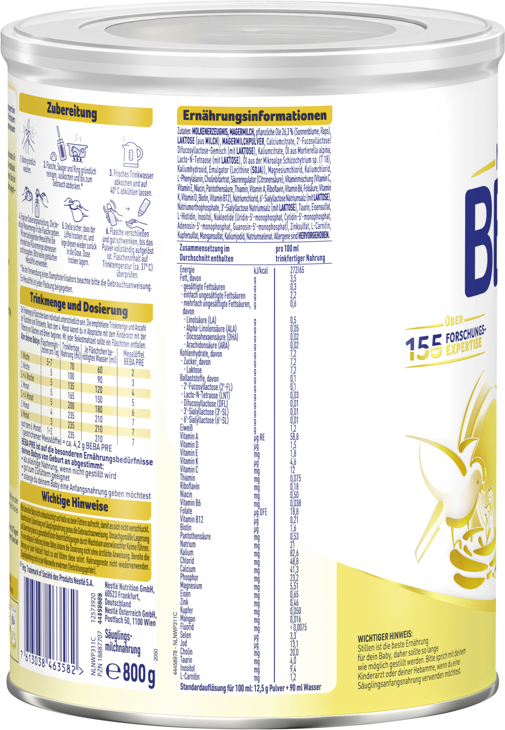 myTime Assortment Yes myTime Article Number 4502131153 myTime Product Title BEBA Pre Anfangsmilch von Geburt an EAN 07613038463582 Material Number 12573920 Marke NESTLE Product Name BEBA PRE Anfangsmilch von Geburt an, 800g Net Content 800.000 Net Content UoM GRM Net Weight 800 Net Weight UoM GRM Artikel Höhe 165.000 Artikel Höhe UoM MMT Artikel Breite 133.000 Artikel Breite UoM MMT Artikel Länge 133.000 Artikel Länge UoM MMT Schlagwörter milchpulver, milk, powder, baby, milch, food, kindermilch, babymilch, formula, säuglingsmilch, kalzium, mineralstoffe, vitamin d, milchnahrung, trinkmahlzeit, pulver, trinknahrung Bezeichnung Säuglingsmilchnahrung Beschreibung Unser Bestes für Euch! Mit mehr als 155 Jahren Forschungsexpertise kombinieren wir von BEBA herausragende Produktqualität auf höchstem wissenschaftlichem Niveau mit unserem Ziel, für jedes Baby gemeinsam eine lebenswerte Zukunft zu schaffen. BEBA PRE Anfangsmilch ist auf die Bedürfnisse deines Babys von Geburt an abgestimmt. Warum BEBA PRE Anfangsmilch? - Enthält pflanzliche Öle ohne Palmöl - Nur Laktose enthalten - Geeignet als alleinige Nahrung, wenn nicht gestillt wird, oder zum Zufüttern Als Mama oder Papa möchtest du nur das Beste für dein kleines Wunder und einen großartigen Start ins Leben. Dazu gehört: deine Liebe, Fürsorge und die richtige Ernährung. Über die Muttermilch bekommen Babys immer genau das, was sie brauchen. Daher setzen wir jeden Tag alles daran, die Bestandteile von Muttermilch zu entschlüsseln. Uns ist es wichtig, euch eine Säuglingsnahrung anzubieten, die auf dem neusten Stand der Forschung ist. Wichtiger Hinweis: Stillen ist die beste Ernährung für dein Baby, daher sollte so lange wie möglich gestillt werden. Sprich bitte mit deinem Kinderarzt oder deiner Hebamme, wenn du eine Säuglingsnahrung verwenden willst. Zubereitung Wichtige Hinweise: Beachte bei der Zubereitung von Säuglingsnahrung genau die Gebrauchsanweisung. Unsachgemäße Lagerung und Zubereitung kann zu gesundheitlichen Beeinträchtigungen durch Wachstum unerwünschter Keime führen. Für eine adäquate Ernährung deines Babys ändere die Dosierung nicht ohne ärztliche Anweisung. Bereite die Nahrung vor jeder Mahlzeit frisch zu und füttere diese sofort. Nahrungsreste nicht wiederverwenden. Säuglingsnahrung nicht in der Mikrowelle erwärmen (Verbrühungsgefahr). Zubereitung: 1. Hände gründlich waschen. 2. Flasche, Sauger und Ring gründlich reinigen, auskochen und bis zum Gebrauch abdecken.* 3. Frisches Trinkwasser abkochen und auf 40°C abkühlen lassen. 4. Folge der Dosierungsanleitung. Die benötigte Wassermenge in die Flasche geben. Mit dem beiliegenden Messlöffel die erforderliche Pulvermenge abmessen und hinzugeben. Bitte keine gehäuften Messlöffel verwenden. 5. Stelle sicher, dass der Löffel trocken ist, und lege diesen wieder zurück in die Dose. Dose trocken lagern. 6. Flasche verschließen und gut schwenken, bis das Pulver vollständig aufgelöst ist. Flascheninhalt auf Trinktemperatur (ca. 37°C) überprüfen. *Bei der Verwendung eines Dampfsterilisators beachte bitte die Gebrauchsanweisung. Ein Messlöffel ist jeder Packung beigegeben. Zutaten Zutaten: MOLKENERZEUGNIS, MAGERMILCH, pflanzliche Öle 26,3 % (Sonnenblume, Raps), LAKTOSE (aus MILCH), MAGERMILCHPULVER, Calciumcitrate, 2'-Fucosyllactose/Difucosyllactose-Gemisch (mit LAKTOSE), Kaliumcitrate, Öl aus Mortierella alpina, Lacto-N-Tetraose (mit LAKTOSE), Öl aus der Mikroalge Schizochytrium sp. (T 18), Kaliumhydroxid, Emulgator (Lecithine (SOJA)), Magnesiumchlorid, Kaliumchlorid, L-Phenylalanin, Cholinbitartrat, Säureregulator (Citronensäure), Vitaminmischung (Vitamin C, Vitamin E, Niacin, Pantothensäure, Thiamin, Vitamin A, Riboflavin, Vitamin B6, Folsäure, Vitamin K, Vitamin D, Biotin, Vitamin B12), Natriumchlorid, 6'-Sialyllactose Natriumsalz (mit LAKTOSE), Natriumorthophosphate, 3'-Sialyllactose Natriumsalz (mit LAKTOSE), Taurin, Eisensulfat, L-Histidin, Inositol, Nukleotide (Uridin-5'-monophosphat, Cytidin-5'-monophosphat, Adenosin-5'-monophosphat, Guanosin-5'-monophosphat), Zinksulfat, L-Carnitin, Kupfersulfat, Mangansulfat, Kaliumjodid, Natriumselenat.
