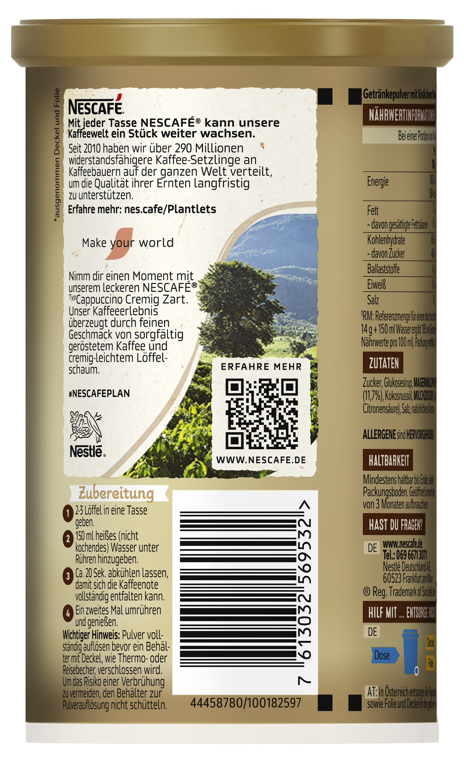 myTime Assortment Yes myTime Article Number 4502090281 myTime Product Title Nescafé Typ Cappuccino Cremig Zart EAN 07613032569532 Material Number 12503392 Marke NESCAFE Product Name NESCAFE Typ Cappuccino Cremig Zart 250g Net Content 250.000 Net Content UoM GRM Net Weight 250 Net Weight UoM GRM Artikel Höhe 137.000 Artikel Höhe UoM MMT Artikel Breite 73.000 Artikel Breite UoM MMT Artikel Länge 73.000 Artikel Länge UoM MMT Bezeichnung Getränkepulver mit löslichem Bohnenkaffee. Beschreibung Eine kleine Tasse Kaffee kann Großes bewirken. Dieser NESCAFE Typ Cappuccino Cremig Zart enthält zu 100% verantwortungsvoll beschafften Kaffee. Das bedeutet nachhaltige Anbau-Methoden und bessere Lebensbedingungen der Kaffeefarmer. Nimm dir einen Moment mit unserem leckeren NESCAFE Typ Cappuccino Cremig Zart. Unser Kaffeeerlebnis überzeugt durch feinen Geschmack von sorgfältig geröstetem Kaffee und cremig-leichtem Löffelschaum. Hergestellt mit ausgewähltem und verantwortungsvoll beschafftem Kaffee. Zubereitung Zubereitung: 1. 2-3 Löffel in eine Tasse geben. 2. 150 ml heißes (nicht kochendes) Wasser unter Rühren hinzugeben. 3. Ca. 20 Sek. abkühlen lassen, damit sich die Kaffeenote vollständig entfalten kann. 4. Ein zweites Mal umrühren und genießen. Zutaten Zutaten: Zucker, Glukosesirup, MAGERMILCHPULVER (20,6%), löslicher Bohnenkaffee (11,7%), Kokosnussöl, MILCHZUCKER, Säureregulator (Natriumcarbonate, Citronensäure), Salz, natürliches Aroma.