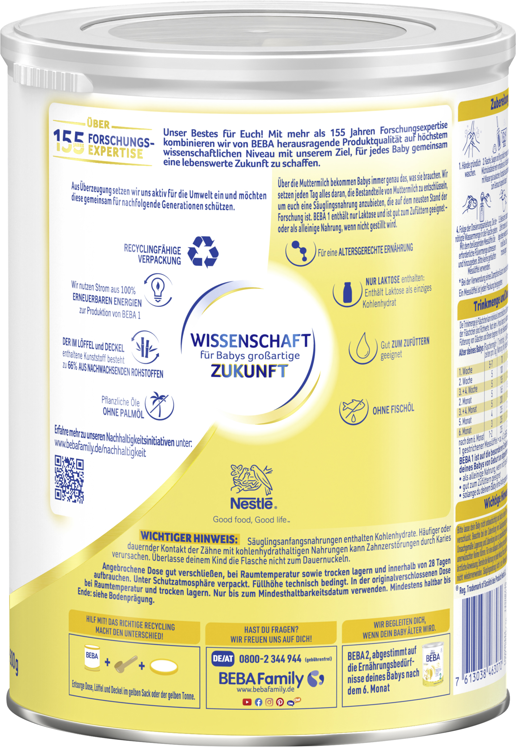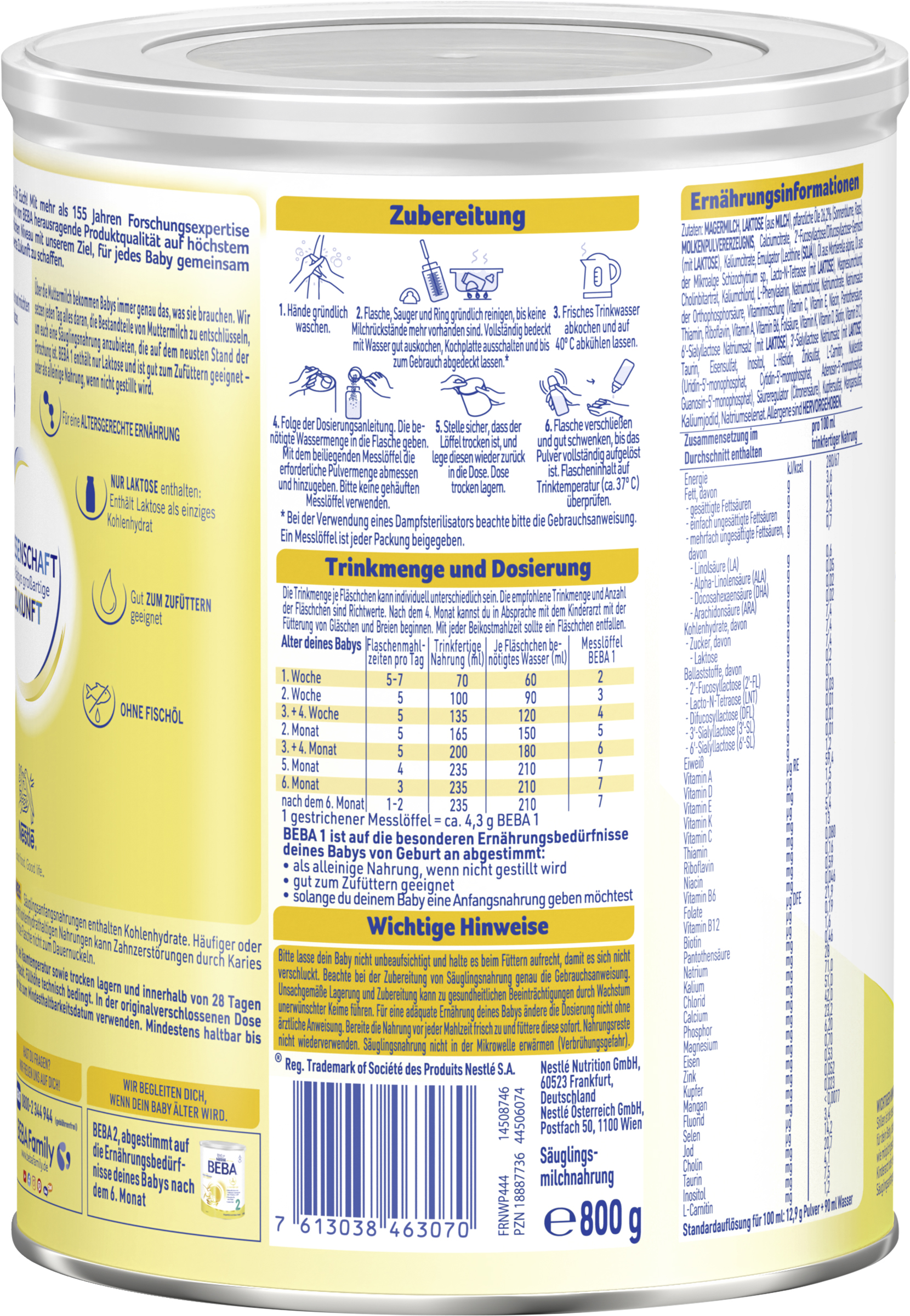 myTime Assortment Yes myTime Article Number 4502131154 EAN 07613038463070 Material Number 14508746 Marke NESTLE Product Name BEBA 1 Anfangsmilch von Geburt an, 800g Net Content 800.000 Net Content UoM GRM Net Weight 800 Net Weight UoM GRM Artikel Höhe 167.000 Artikel Höhe UoM MMT Artikel Breite 133.000 Artikel Breite UoM MMT Artikel Länge 133.000 Artikel Länge UoM MMT Schlagwörter milchpulver, milk, powder, baby, milch, food, kindermilch, babymilch, formula, säuglingsmilch, kalzium, mineralstoffe, vitamin, d, babyfeeding, milchnahrung, trinkmahlzeit, pulver, trinknahrung Bezeichnung Säuglingsmilchnahrung Beschreibung BEBA 1 Anfangsmilch ist auf die Bedürfnisse deines Babys von Geburt an abgestimmt. Warum BEBA 1 Anfangsmilch? - Enthält pflanzliche Öle ohne Palmöl - Ohne Fischöl - Nur Laktose enthalten - Geeignet als alleinige Nahrung, wenn nicht gestillt wird, oder zum Zufüttern Als Mama oder Papa möchtest du nur das Beste für dein kleines Wunder und einen großartigen Start ins Leben. Dazu gehört: deine Liebe, Fürsorge und die richtige Ernährung. Über die Muttermilch bekommen Babys immer genau das, was sie brauchen. Daher setzen wir jeden Tag alles daran, die Bestandteile von Muttermilch zu entschlüsseln. Uns ist es wichtig, euch eine Säuglingsnahrung anzubieten, die auf dem neusten Stand der Forschung ist. Wir setzen auf Nachhaltigkeit und Umweltschutz. Der Löffel und Deckel von BEBA 1 bestehen zu 66% aus nachwachsenden Rohstoffen. Darüber hinaus nutzen wir 100% Strom aus erneuerbaren Energien zur Herstellung von BEBA 1. Wichtiger Hinweis: Wichtiger Hinweis: Stillen ist die beste Ernährung für dein Baby, daher sollte so lange wie möglich gestillt werden. Sprich bitte mit deinem Kinderarzt oder deiner Hebamme, wenn du eine Säuglingsnahrung verwenden willst. Zubereitung Wichtige Hinweise: Beachte bei der Zubereitung von Säuglingsnahrung genau die Gebrauchsanweisung. Unsachgemäße Zubereitung und Lagerung kann zu gesundheitlichen Beeinträchtigungen durch Wachstum unerwünschter Keime führen. Für eine adäquate Ernährung deines Babys ändere die Dosierung nicht ohne ärztliche Anweisung. Bereite die Nahrung vor jeder Mahlzeit frisch zu und füttere diese sofort. Nahrungsreste nicht wiederverwenden. Säuglingsnahrung nicht in der Mikrowelle erwärmen (Verbrühungsgefahr). Zubereitung: 1. Hände gründlich waschen. 2. Flasche, Sauger und Ring gründlich reinigen, bis keine Milchrückstände mehr vorhanden sind. Vollständig bedeckt mit Wasser gut auskochen, Kochplatte ausschalten und bis zum Gebrauch abgedeckt lassen.* 3. Frisches Trinkwasser abkochen und auf 40°C abkühlen lassen. 4. Folge der Dosierungsanleitung. Die benötigte Wassermenge in die Flasche geben. Mit dem beiliegenden Messlöffel die erforderliche Pulvermenge abmessen und hinzugeben. Bitte keine gehäuften Messlöffel verwenden. 5. Stelle sicher, dass der Löffel trocken ist, und lege diesen zurück in die Dose. Dose trocken lagern. 6. Flasche verschließen und gut schwenken, bis das Pulver vollständig aufgelöst ist. Flascheninhalt auf Trinktemperatur (ca. 37°C) überprüfen. *Bei der Verwendung eines Dampfsterilisators beachte bitte die Gebrauchsanweisung. Ein Messlöffel ist jeder Packung beigegeben. Zutaten Zutaten: MAGERMILCH, LAKTOSE (aus MILCH), pflanzliche Öle 26,2% (Sonnenblume, Raps), MOLKENPULVERERZEUGNIS, Calciumcitrate, 2'-Fucosyllactose/Difucosyllactose-Gemisch (mit LAKTOSE), Kaliumcitrate, Emulgator (Lecithine (SOJA)), Öl aus Mortierella alpina, Öl aus der Mikroalge Schizochytrium sp., Lacto-N-Tetraose (mit LAKTOSE), Magnesiumchlorid, Cholinbitartrat, Kaliumchlorid, L-Phenylalanin, Natriumchlorid, Natriumcitrate, Natriumsalze der Orthophosphorsäure, Vitaminmischung (Vitamin C, Vitamin E, Niacin, Pantothensäure, Thiamin, Riboflavin, Vitamin A, Vitamin B6, Folsäure, Vitamin K, Vitamin D, Biotin, Vitamin B12), 6'-Sialyllactose Natriumsalz (mit LAKTOSE), 3'-Sialyllactose Natriumsalz (mit LAKTOSE), Taurin, Eisensulfat, Inositol, L-Histidin, Zinksulfat, L-Carnitin, Nukleotide (Uridin-5'-monophosphat, Cytidin-5'-monophosphat, Adenosin-5'-monophosphat, Guanosin-5'-monophosphat), Säureregulator (Citronensäure), Kupfersulfat, Mangansulfat, Kaliumjodid, Natriumselenat.