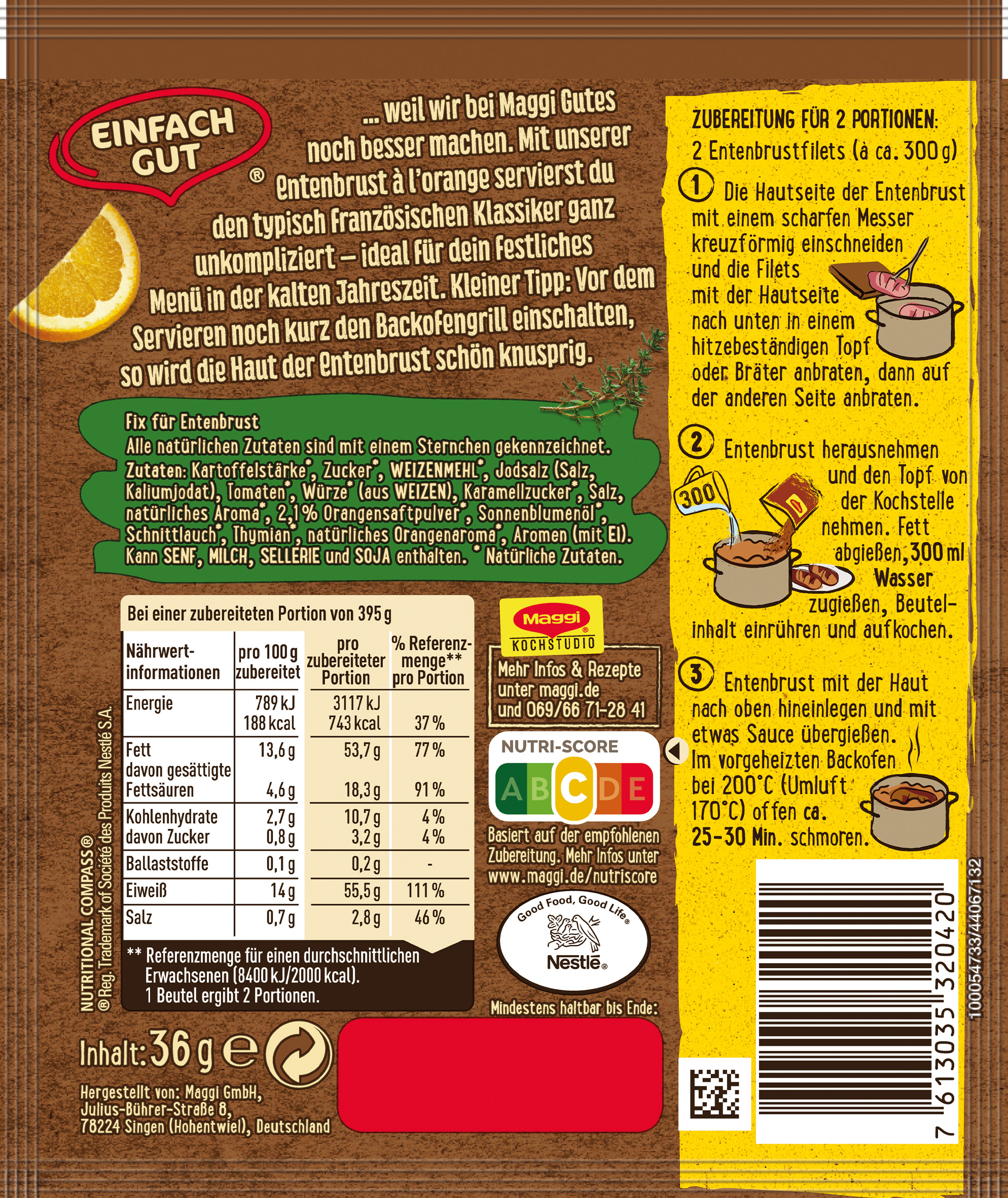 | Marketing Message | Nur für kurze Zeit im Saison-Sortiment: MAGGI Fix für herzhafte Entenbrust à l´Orange - genau das richtige für dein festliches Menü in der kalten Jahreszeit. Mit MAGGI Fix für Entenbrust à l´Orange mit natürlichen Zutaten* gelingt dir der französische Klassiker ganz einfach zu Hause. Die würzige Sauce mit feiner Orangennote bildet die perfekte Ergänzung zur krossen Entenbrust und kann beliebig je nach Vorliebe ergänzt werden, z.B. mit Rotkohl und Knödeln. Kurz zusammengefasst – MAGGI Fix für Entenbrust à l´Orange: • Ergibt 2 Portionen • Mit feiner Orangennote • Minimaler Zeitaufwand • Maximale Erfolgsgarantie bei vollmundigem Geschmack • Ausgewählte Zutaten Folgendes wird zusätzlich benötigt: • 2 Entenbrustfilets Unser Extra-Tipp: Vor dem Servieren noch kurz den Backofengrill einschalten, so wird die Haut der Entenbrust schön knusprig. Weitere kreative und leckere Rezeptideen für noch mehr Inspiration und Abwechslung beim Kochen findest du im Rezeptbereich auf maggi.de – Natürlich mit Geling-Garantie. *Hinweis: Das Produkt besteht nicht 100% aus natürlichen Zutaten. Für detaillierte Zutaten, s. Zutatenliste |