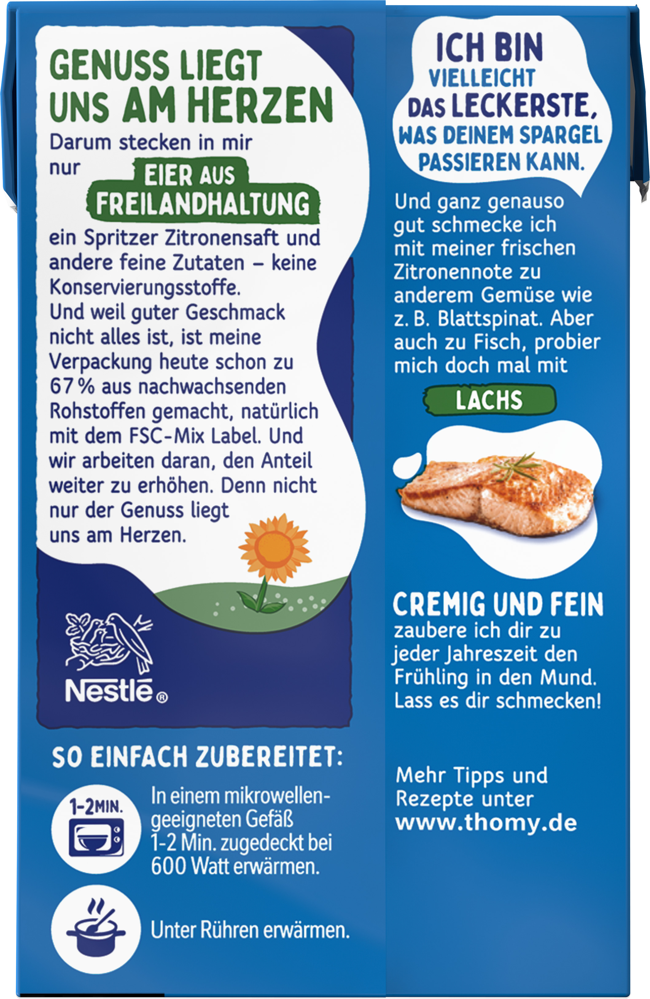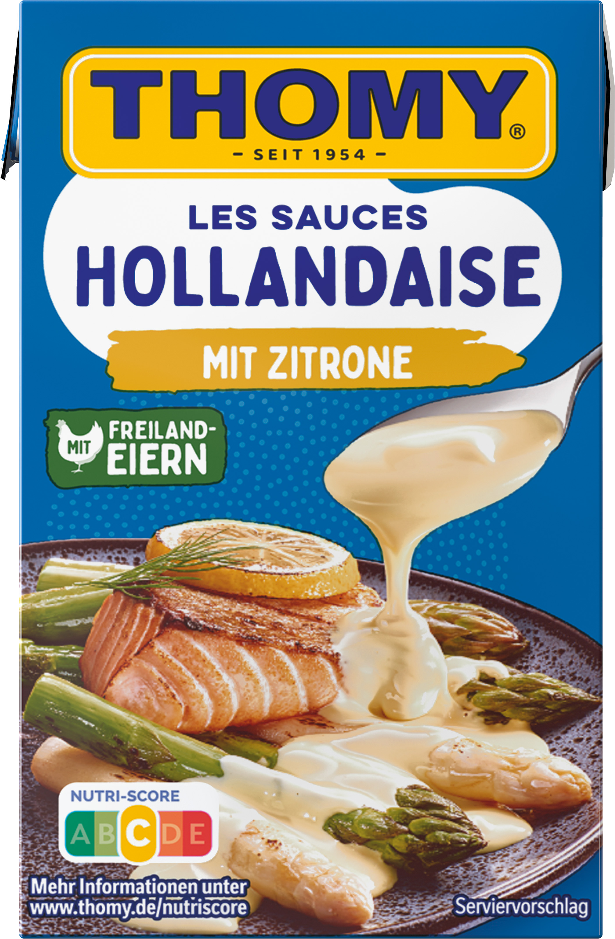 | Marketing Message | GENUSS LIEGT UNS AM HERZEN Darum stecken in dieser Thomy Les Sauces Hollandaise nur EIER AUS FREILANDHALTUNG, ein Spritzer Zitronensaft und andere feine Zutaten – keine Konservierungsstoffe. Und weil guter Geschmack nicht alles ist, ist die Verpackung heute schon zu 67% aus nachwachsenden Rohstoffen gemacht, natürlich mit dem FSC-Mix Label. • Mit Eiern aus Freilandhaltung und Zitronensaft • Ohne Konservierungsstoffe • Zitronig feiner Geschmack und lecker cremig • Nutri-Score C • Zu 67% aus nachwachsenden Rohstoffen: Mach mit und schließe den Recyclingkreis. • Vielleicht dass leckerste, was Deinem Spargel passieren kann • Ideal auch zu anderem Gemüse, wie z.B. Blattspinat oder auch zu Fisch – z.B. Lachs THOMY… hier kommt der Genuss In höchster Thomy-Qualität Der Nutri-Score ist ein freiwilliges Kennzeichnungssystem, das als Orientierungshilfe dient, Lebensmittel nach ihrer Nährwertqualität zu bewerten. Verbraucher können mithilfe der fünfstufigen und farbig hinterlegten Buchstabenskala das Nährwertprofil eines Produkts erkennen. |