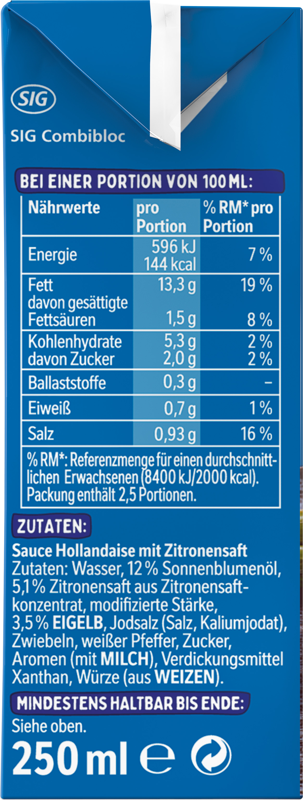 | Ingredient List | Zutaten: Wasser, 12% Sonnenblumenöl, 5,1 % Zitronensaft aus Zitronensaftkonzentrat, modifizierte Stärke, 3,5 % EIGELB, Jodsalz (Salz, Kaliumjodat), Zwiebeln, weißer Pfeffer, Zucker, Aromen (mit MILCH), Verdickungsmittel Xanthan, Würze (aus WEIZEN). |