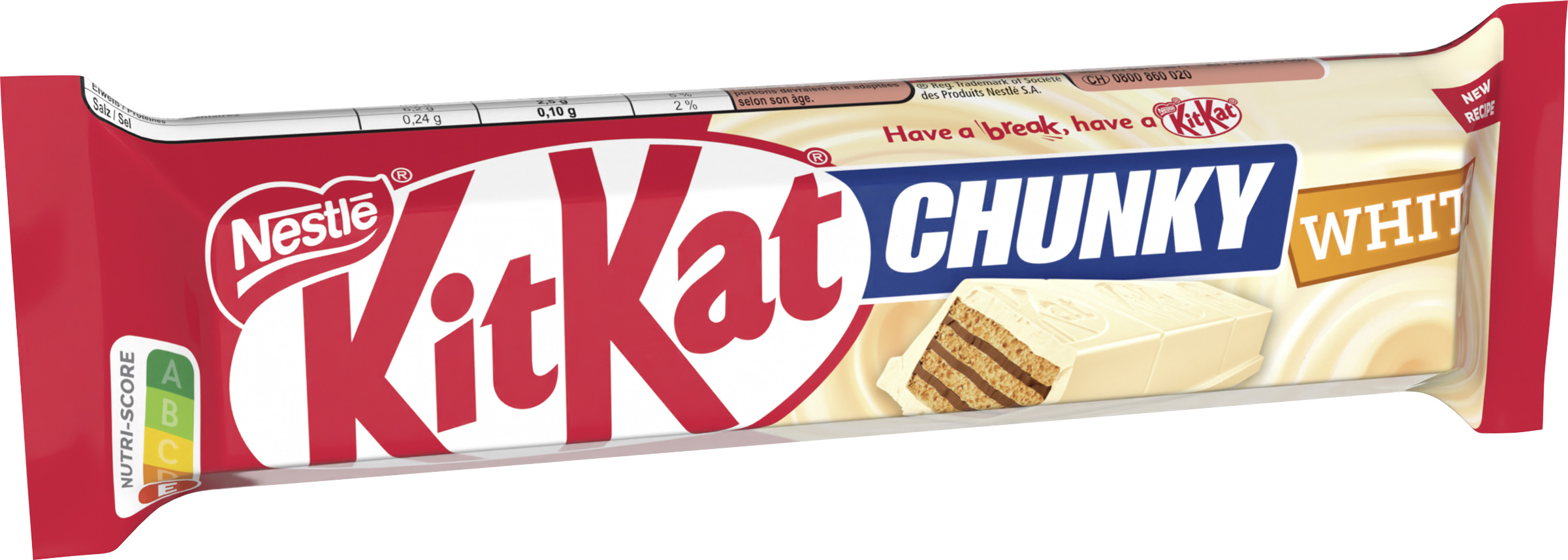 | Marketing Message | "NESTLÉ KITKAT CHUNKY White Riegel mit weißer Fettglasur & knuspriger Waffel KitKat® Chunky White ist die weiße Version des beliebten Schokoladen-Klassikers und zwar in einer Großpackung. Seine einzigartige Kombination aus der leckeren, weißen Hülle und knuspriger Waffel macht KitKat® zum leckeren Pausensnack. Durch sein Format macht ihn zum perfekten Begleiter für eine satte Pause, die den Akku wieder auflädt. – KitKat® Chunky White - Der beliebte Riegel mit knuspriger Waffel und einer leckeren, weißen Glasur – Der ideale Pausensnack für eine satte Pause – Schoko-Snack für Groß und Klein, ideal für den Hunger zwischendurch Der Schokoladenriegel überzeugt Jung und Alt. Gönnen Sie sich eine wohlverdiente Auszeit vom stressigen Alltag und genießen Sie unseren Knusper-Riegel." |