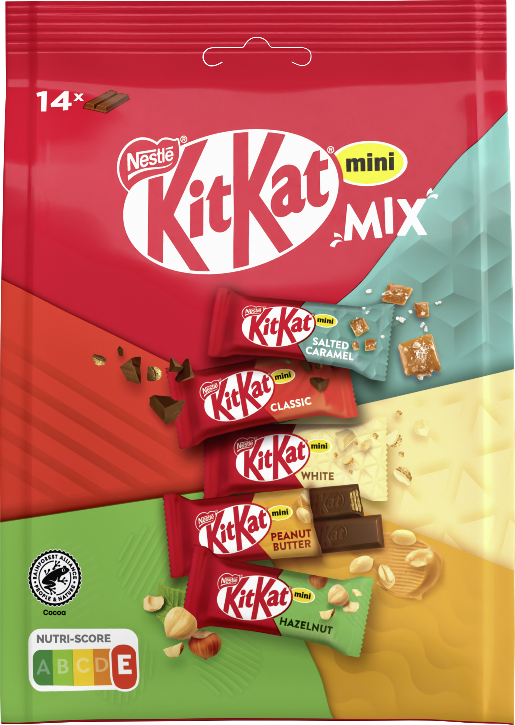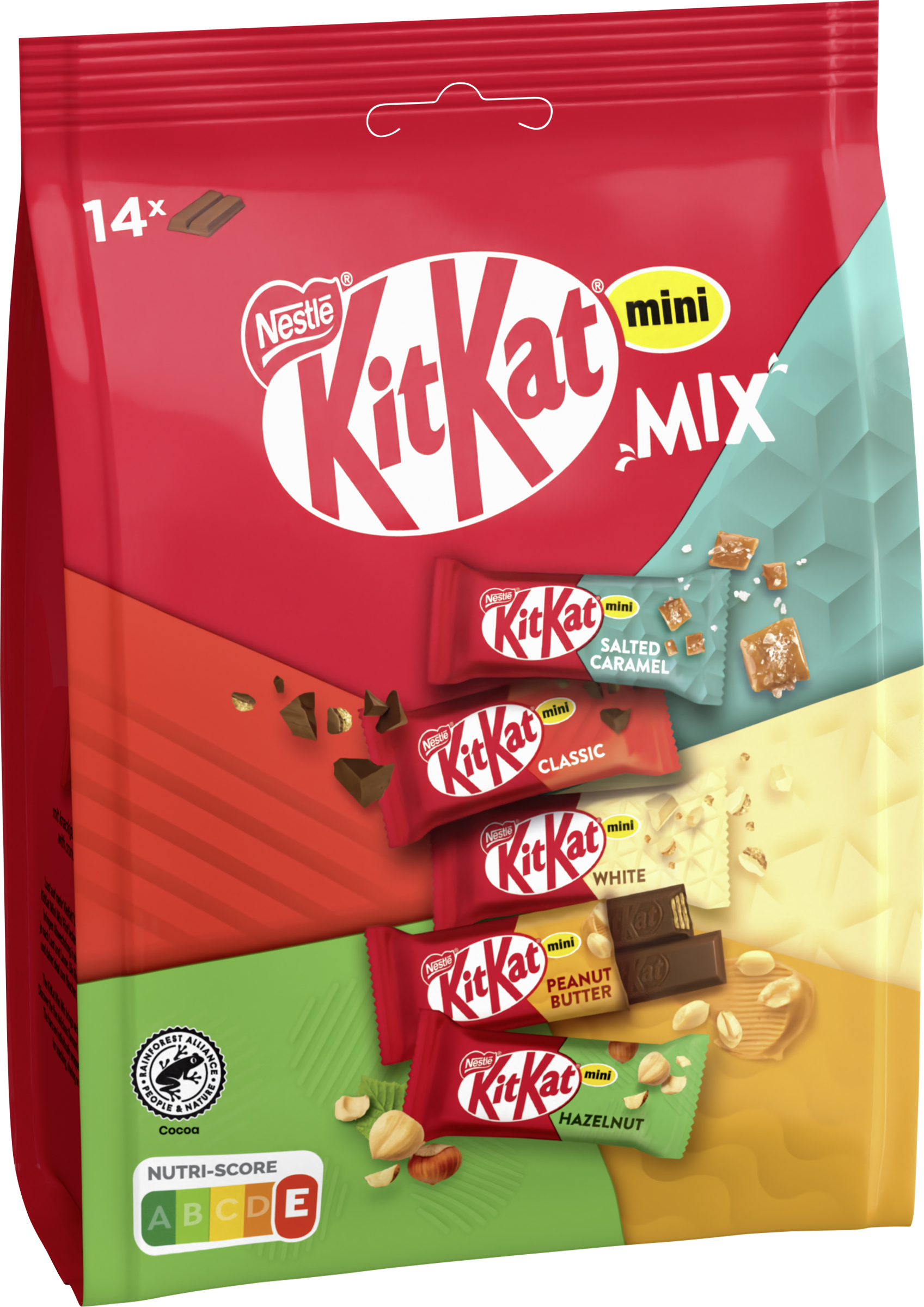 | Marketing Message | Lust auf mehr Vielfalt? Dann ist jetzt Zeit für den neuen KITKAT Mini Mix. Die fünf leckeren Geschmacksrichtigungen im Mix-Beutel bringen Abwechslung in den Pausenmoment - ganz nach Lust und Laune: - Hazelnut: mit knackigen Haselnussstückchen - Peanut Butter: leckere Füllung mit Erdnusscreme - Salted Caramel: mit aufregendem gesalzenem Karamell - White: für KitKat White Fans - Classic: knusprige Waffel überzogen mit zartschmelzender Milchschokolade Die Riegel sind einzeln verpackt und daher ideal zum Naschen, Mitnehmen oder Teilen. Egal ob man den Mix-Beutel allein oder gemeinsam genießt: Die 5 unterschiedlichen Sorten machen jeden Pausenmoment abwechslungsreicher. Der verwendete Kakao ist Rainforest-Alliance-zertifiziert und stammt aus dem Nachhaltigkeitsprogramm des Nestlé Cocoa Plans. Have a break, have a KitKat |