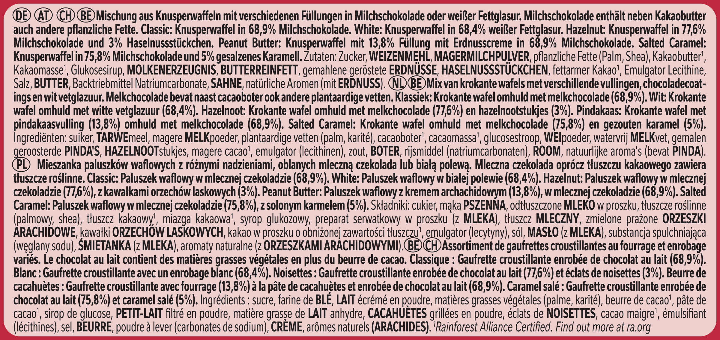 | Regulated Product Name | Mischung aus Knusperwaffeln mit verschiedenen Füllungen in Milchschokolade oder weißer Fettglasur. Classic: Knusperwaffel in 68,9% Milchschokolade. |