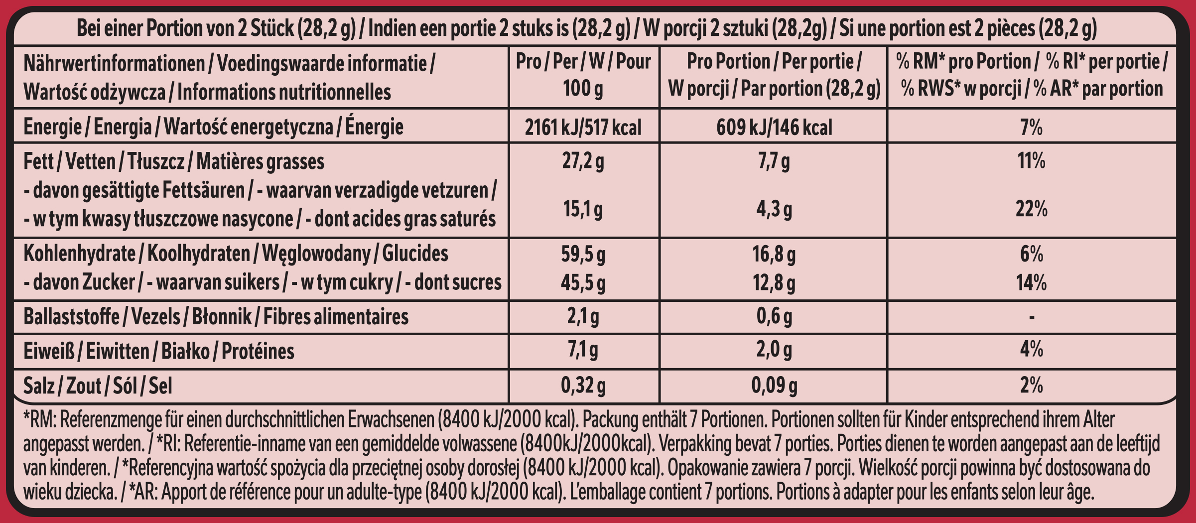 | 1. Nährwerte >>> | Zubereitungsgrad Bezugsgröße Portionsgröße Portionsgröße Beschreibung Tagesdosis Referenzwert Nährstoff: Teil von… Messgenauigkeit Nährwert % Messgenauigkeit % Referenzmenge UNPREPARED100GRMENER-EnergieAPPROXIMATELY2161kJ UNPREPARED100GRMENER-EnergieAPPROXIMATELY517kCal UNPREPARED100GRMFATFettAPPROXIMATELY27.2g UNPREPARED100GRMFASATFett, davon gesättigte FettsäurenAPPROXIMATELY15.1g UNPREPARED100GRMCHOAVLKohlenhydrateAPPROXIMATELY59.5g UNPREPARED100GRMSUGAR-Kohlenhydrate, davon ZuckerAPPROXIMATELY45.5g UNPREPARED100GRMFIBTGBallaststoffeAPPROXIMATELY2.1g UNPREPARED100GRMPRO-EiweißAPPROXIMATELY7.1g UNPREPARED100GRMSALTEQSalz ÄquivalentAPPROXIMATELY0.32g |