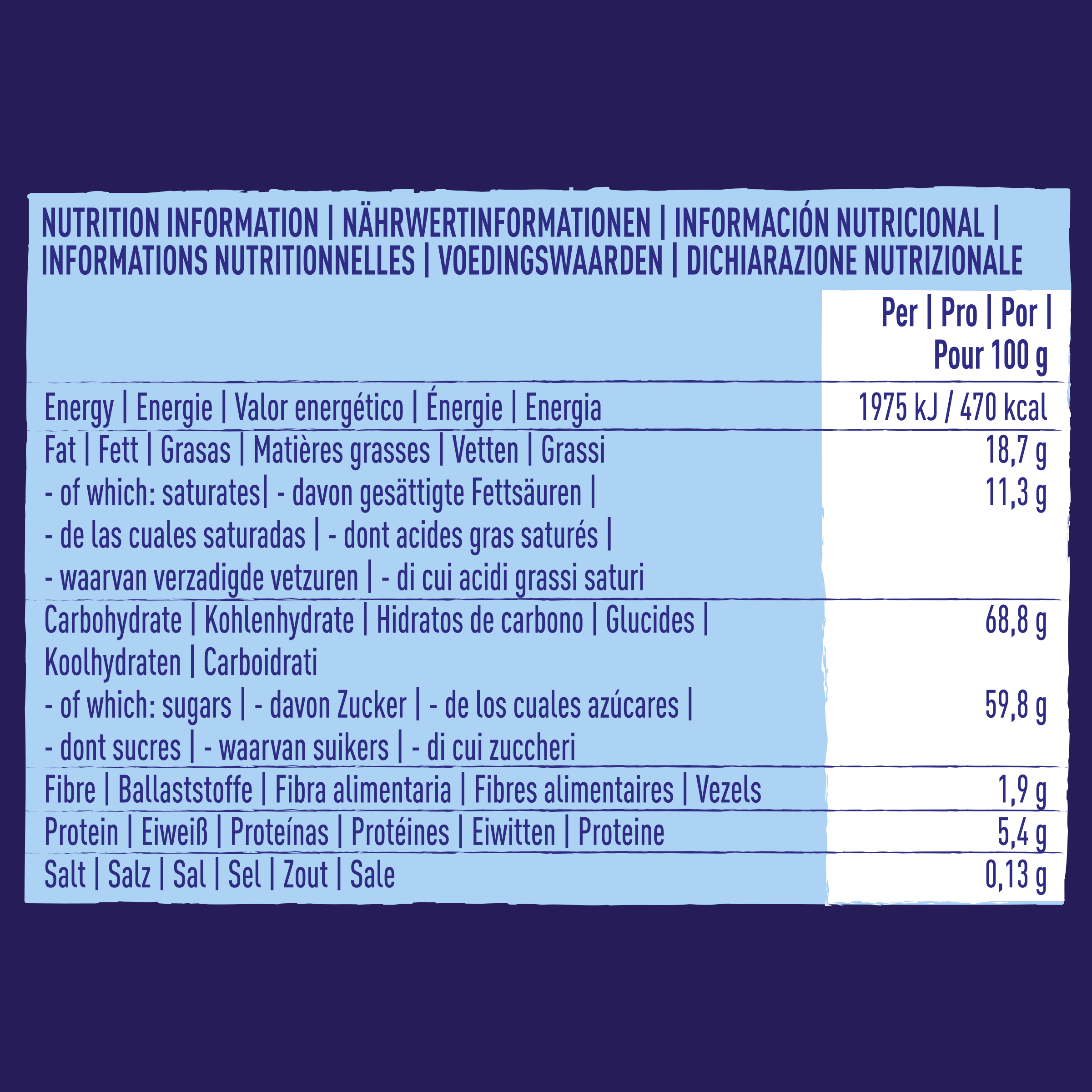 | 1. Nährwerte >>> | Zubereitungsgrad Bezugsgröße Portionsgröße Portionsgröße Beschreibung Tagesdosis Referenzwert Nährstoff: Teil von… Messgenauigkeit Nährwert % Messgenauigkeit % Referenzmenge UNPREPARED100GRMENER-EnergieAPPROXIMATELY1975kJ UNPREPARED100GRMENER-EnergieAPPROXIMATELY470kCal UNPREPARED100GRMFATFettAPPROXIMATELY18.7g UNPREPARED100GRMFASATFett, davon gesättigte FettsäurenAPPROXIMATELY11.3g UNPREPARED100GRMCHOAVLKohlenhydrateAPPROXIMATELY68.8g UNPREPARED100GRMSUGAR-Kohlenhydrate, davon ZuckerAPPROXIMATELY59.8g UNPREPARED100GRMFIBTGBallaststoffeAPPROXIMATELY1.9g UNPREPARED100GRMPRO-EiweißAPPROXIMATELY5.4g UNPREPARED100GRMSALTEQSalz ÄquivalentAPPROXIMATELY0.13g |