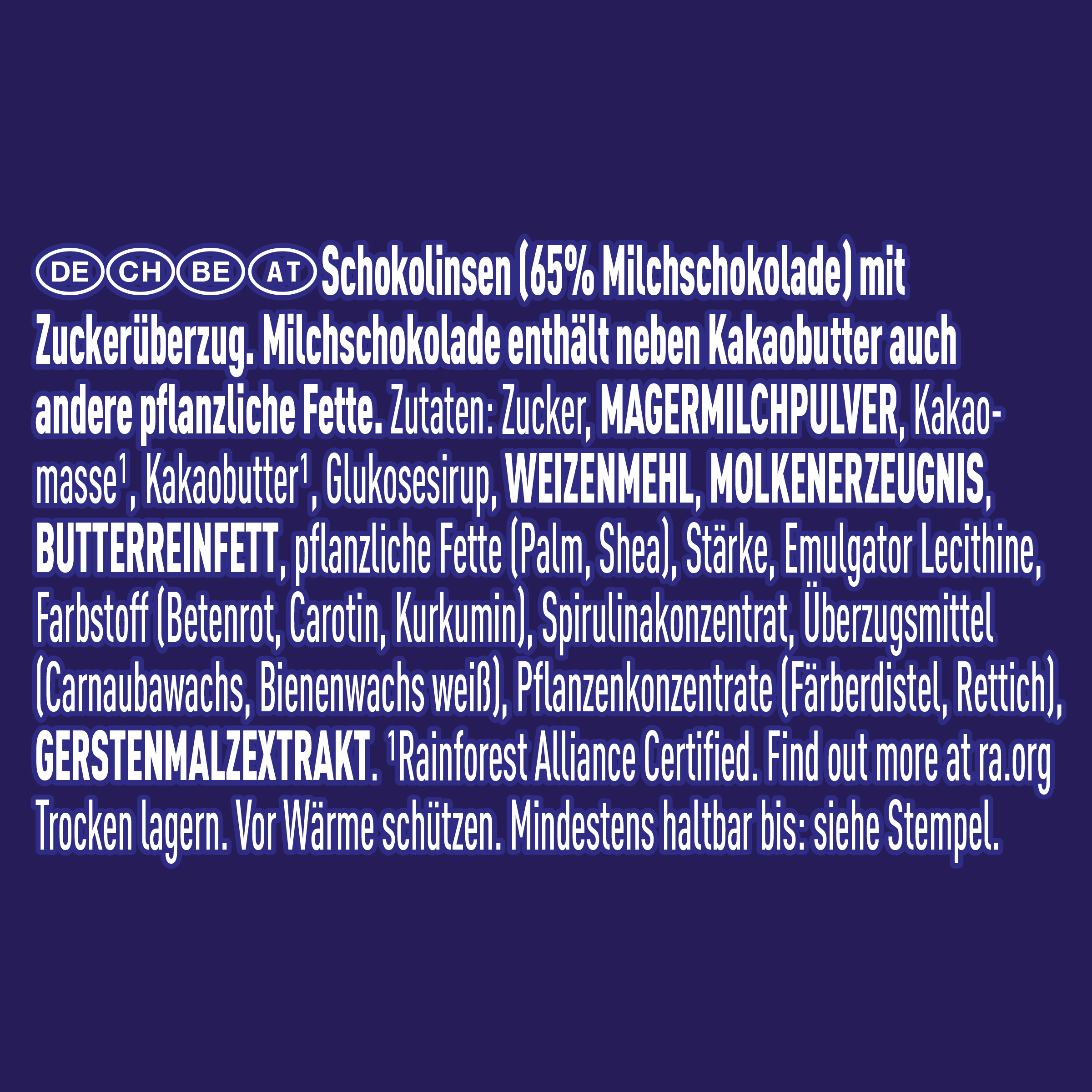 | Regulated Product Name | Schokolinsen (65% Milchschokolade) mit Zuckerüberzug. |