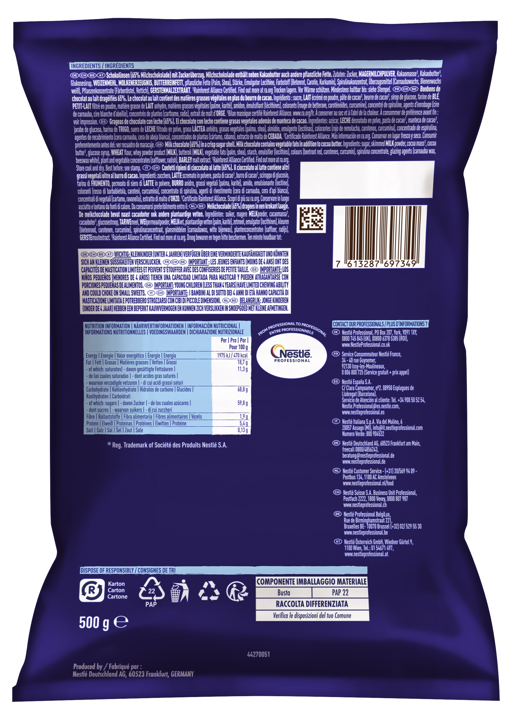 | Ingredient List | Zutaten: Zucker, MAGERMILCHPULVER, Kakaomasse*, Kakaobutter*, Glukosesirup, WEIZENMEHL, MOLKENERZEUGNIS, BUTTERREINFETT, pflanzliche Fette (Palm, Shea), Stärke, Emulgator Lecithine, Farbstoff (Betenrot, Carotin, Kurkumin), Spirulinakonzentrat, Überzugsmittel (Carnaubawachs, Bienenwachs weiß), Pflanzenkonzentrate (Färberdistel, Rettich) GERSTENMALZEXTRAKT. *Rainforest Alliance-Certified. |