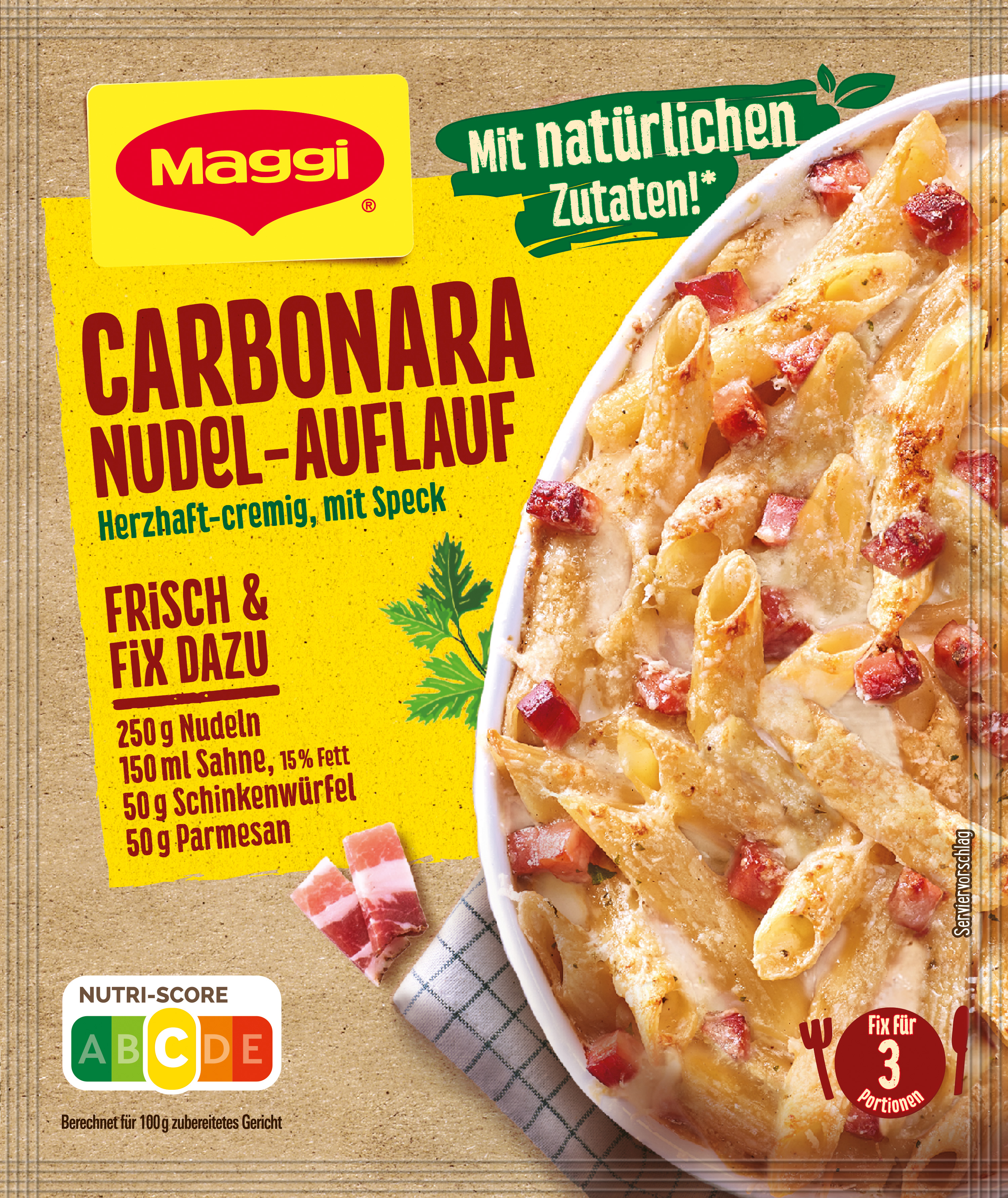 | Marketing Message | Lust auf cremige Pasta im Alltag? Dann ist das MAGGI Fix für Carbonara Nudel-Auflauf genau das Richtige: Zarte Nudeln in einer sahnigen Sauce mit knusprigen Schinkenwürfeln und würzigem Parmesankäse. Erlebe eine Reise der Aromen auf deinem Teller mit MAGGI Fix für Carbonara Nudel-Auflauf! Tauche ein in eine Welt voller cremiger Noten und typisch italienischen Gewürzen, die in perfekter Harmonie vereint sind. Die intensive Sahnesauce und fein abgestimmten Kräuter verleihen diesem Gericht eine unvergleichliche Würze und machen es zu einem wahren Gaumenschmaus. Die Zubereitung ist kinderleicht und innerhalb kürzester Zeit auf dem Tisch. Perfekt für Tage, an denen die Zeit knapp ist, aber der Genuss nicht zu kurz kommen soll! Die Rezeptur der MAGGI Würzmischung enthält bereits alle Würz-Zutaten, die für Carbonara Nudel-Auflauf benötigt werden. Unsere sorgfältig ausgewählten Kräuter und Gewürze sind bereits perfekt aufeinander abgestimmt, sodass du dich zurücklehnen und einfach genießen kannst. Denn mit MAGGI Fix wird jede Mahlzeit zu einem Fest für die Sinne. Gönn dir den Luxus einer stressfreien Zubereitung und lass dich von unserem Carbonara Nudel-Auflauf-Zauber verführen! Die Packung reicht für 3 Portionen. Genieße leckere und einfache Gerichte, schnell im Alltag dank MAGGI! |