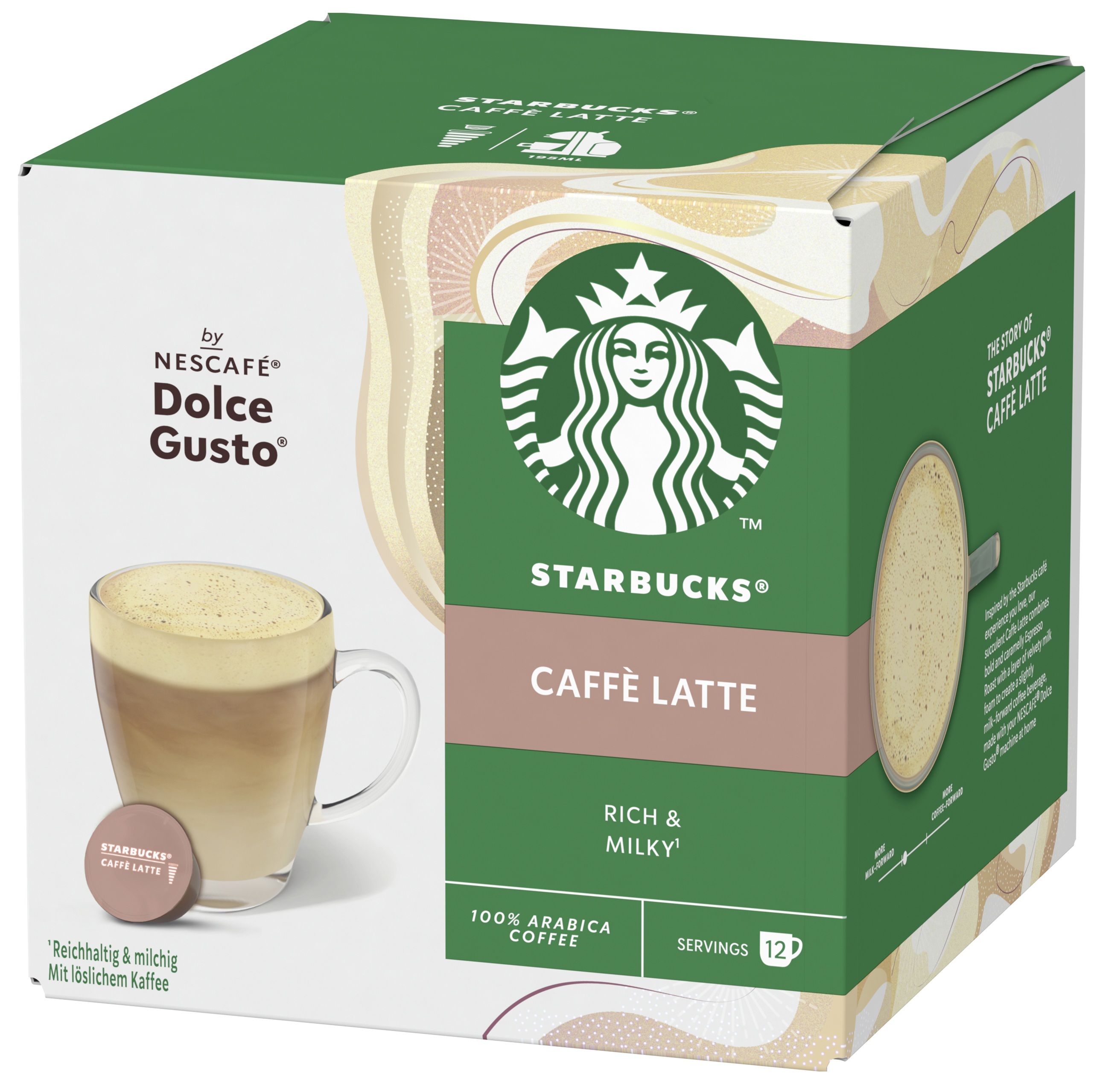 | Marketing Message | Inspiriert von dem kultigen STARBUCKS® CAFFE LATTE, den Sie lieben, wird dieser sanfte, cremige und köstlich vertraute Kaffee zu Hause mit Ihrer NESCAFE DOLCE GUSTO® Maschine hergestellt. Reichhaltiger Kaffee aus 100% Arabica-Kaffee perfekt gemischt mit cremiger Milch. Wir verwenden die gleichen hochwertigen 100% Arabica-Bohnen wie unsere coffeehouses. STARBUCKS® by NESCAFE DOLCE GUSTO® Kaffeepads sind mit NESCAFE DOLCE GUSTO® Kaffeemaschinen kompatibel. Genießen Sie Ihre STARBUCKS®-Favoriten zu Hause. STARBUCKS® und das STARBUCKS®-Logo werden von NESTLE unter Lizenz verwendet. |