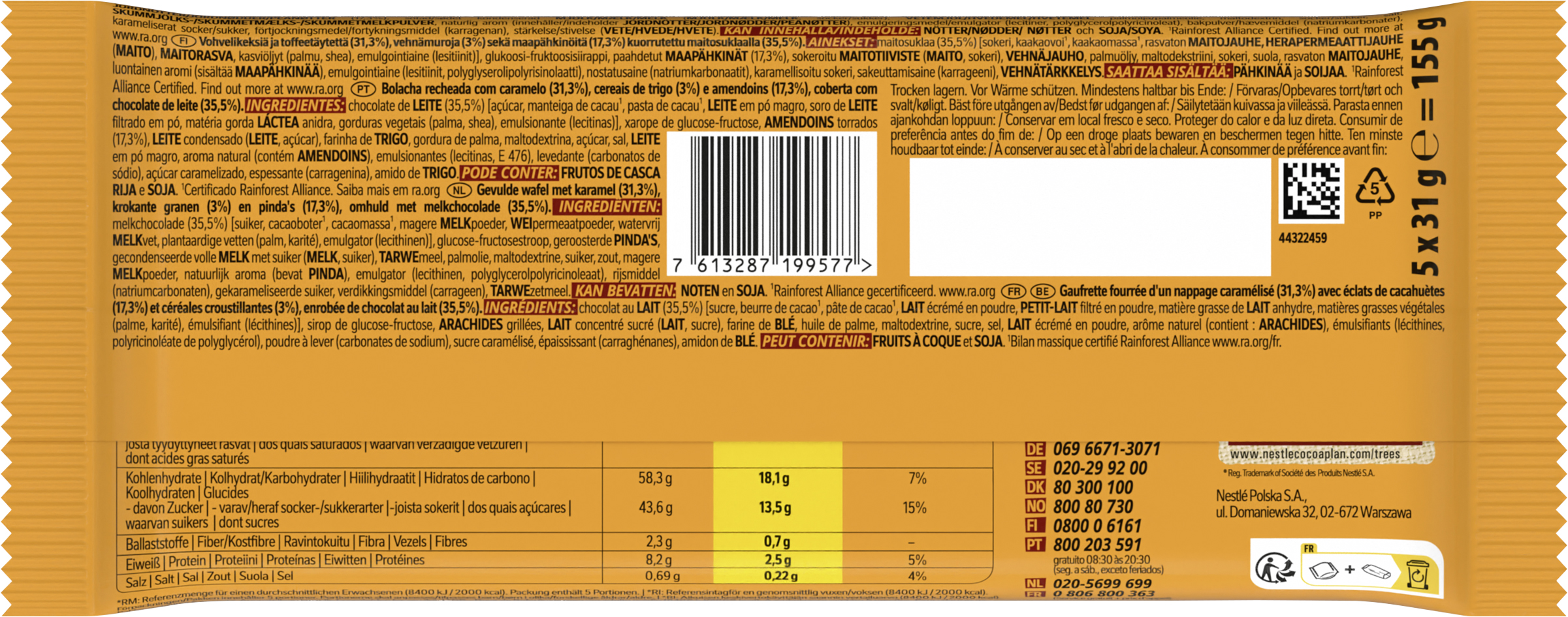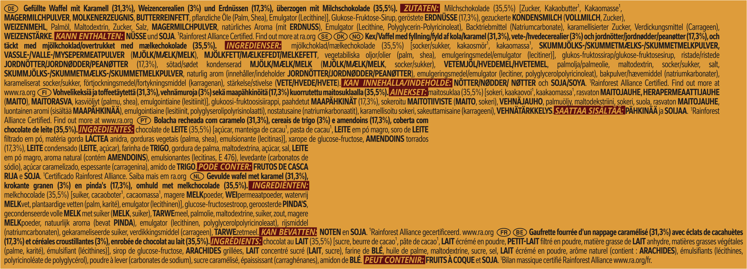 | Regulated Product Name | Gefüllte Waffel mit Karamell (31,3%), Weizencerealien (3%) und Erdnüssen (17,3%), überzogen mit Milchschokolade (35,5%). |