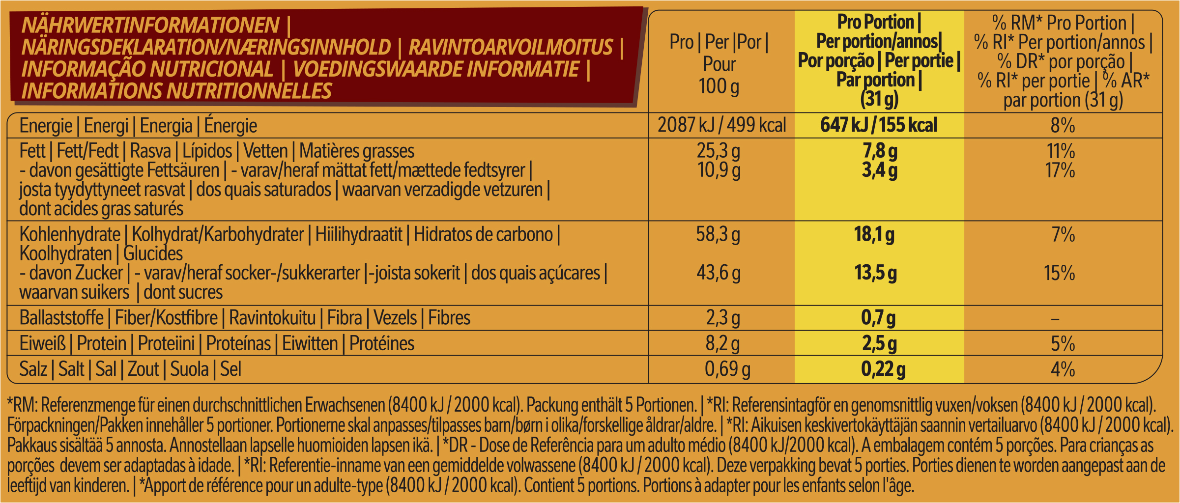 | 1. Nährwerte >>> | Zubereitungsgrad Bezugsgröße Portionsgröße Portionsgröße Beschreibung Tagesdosis Referenzwert Nährstoff: Teil von… Messgenauigkeit Nährwert % Messgenauigkeit % Referenzmenge UNPREPARED100GRMENER-EnergieAPPROXIMATELY2087kJ UNPREPARED100GRMENER-EnergieAPPROXIMATELY499kCal UNPREPARED100GRMFATFettAPPROXIMATELY25.3g UNPREPARED100GRMFASATFett, davon gesättigte FettsäurenAPPROXIMATELY10.9g UNPREPARED100GRMCHOAVLKohlenhydrateAPPROXIMATELY58.3g UNPREPARED100GRMSUGAR-Kohlenhydrate, davon ZuckerAPPROXIMATELY43.6g UNPREPARED100GRMFIBTGBallaststoffeAPPROXIMATELY2.3g UNPREPARED100GRMPRO-EiweißAPPROXIMATELY8.2g UNPREPARED100GRMSALTEQSalz ÄquivalentAPPROXIMATELY0.69g |