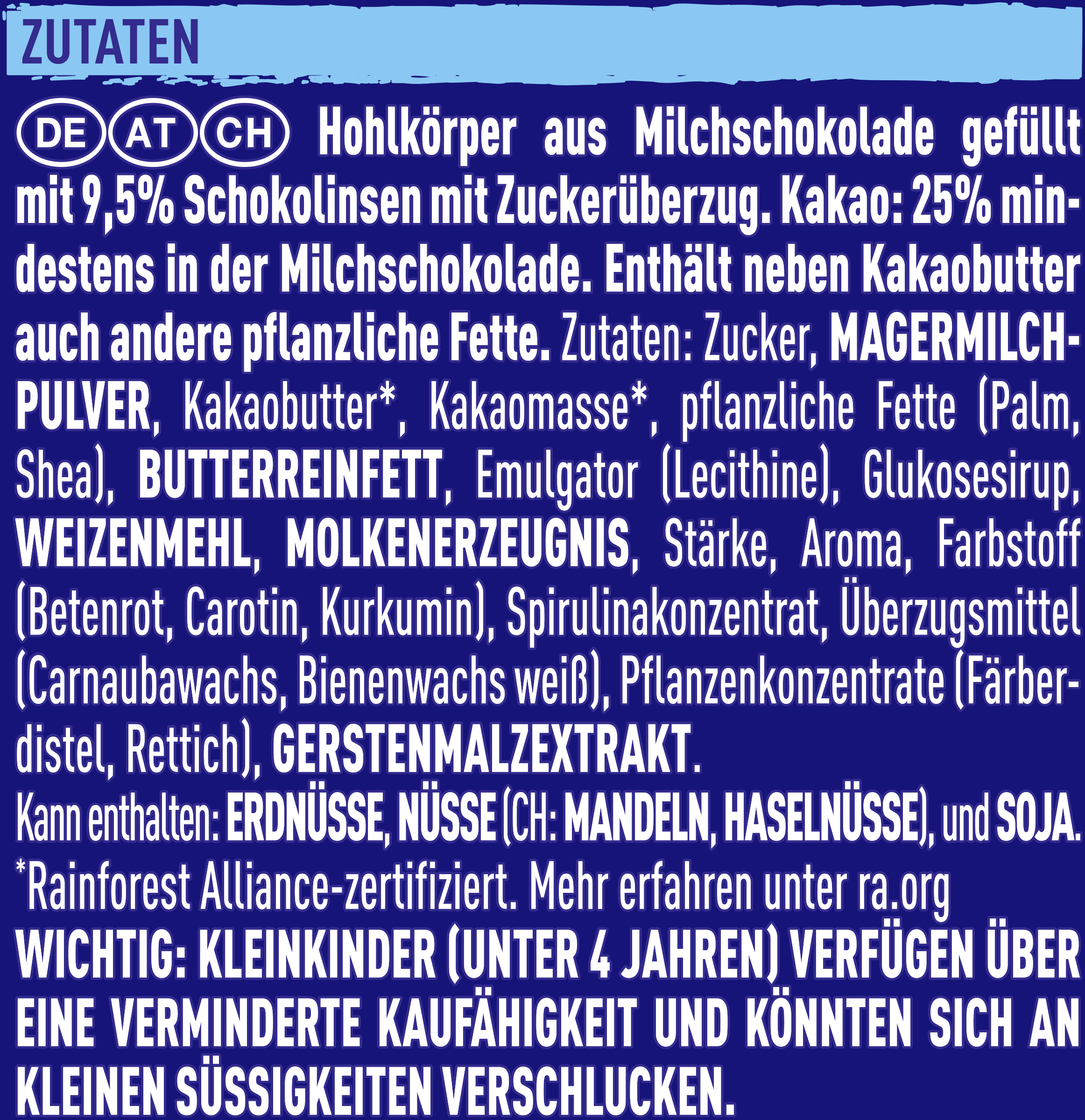 | Ingredient List | Zutaten: Zucker, MAGERMILCHPULVER, Kakaobutter*, Kakaomasse*, pflanzliche Fette (Palm, Shea), BUTTERREINFETT, Emulgator (Lecithine), Glukosesirup, WEIZENMEHL, MOLKENERZEUGNIS, Stärke, Aroma, Farbstoff (Betenrot, Carotin, Kurkumin), Spirulinakonzentrat, Überzugsmittel (Carnaubawachs, Bienenwachs weiß), Pflanzenkonzentrate (Färberdistel, Rettich), GERSTENMALZEXTRAKT. Kann enthalten: ERDNÜSSE, NÜSSE und SOJA. *Rainforest Alliance-zertifiziert. |