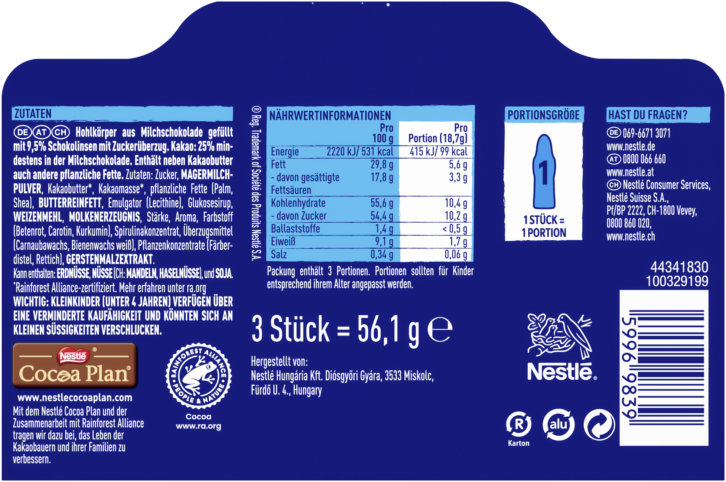 | Additional Legal Product Information | Kakao: 25% mindestens in der Milchschokolade. Enthält neben Kakaobutter auch andere pflanzliche Fette. Wichtig: Kleinkinder (unter 4 Jahren) verfügen über eine verminderte Kaufähigkeit und könnten sich an kleinen Süßigkeiten verschlucken. |