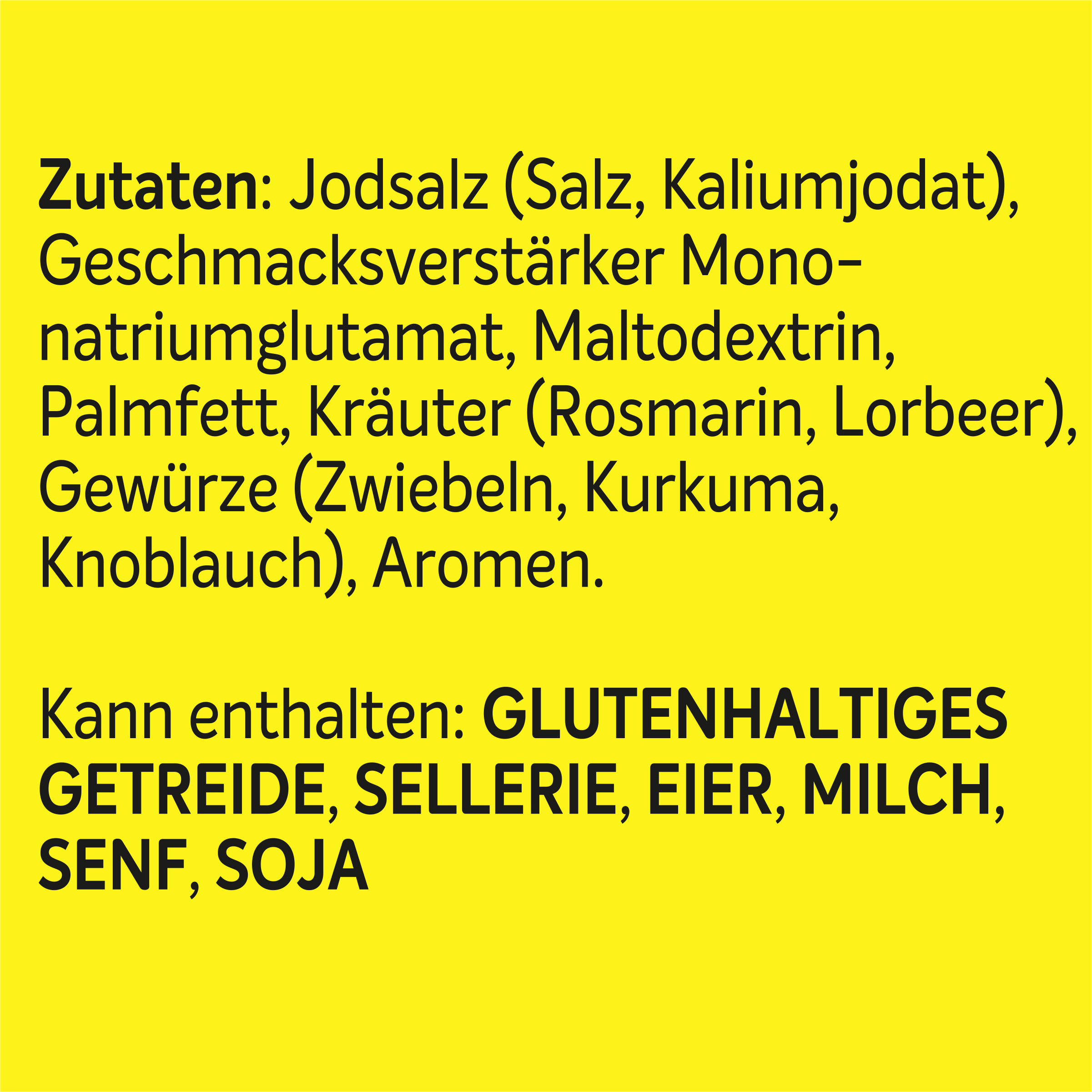 | Ingredient List | Zutaten: Jodsalz (Salz, Kaliumjodat), Geschmacksverstärker Mononatriumglutamat, Maltodextrin, Palmfett, Kräuter (Rosmarin, Lorbeer), Gewürze (Zwiebeln, Kurkuma, Knoblauch), Aromen. Kann enthalten: GLUTENHALTIGES GETREIDE, SELLERIE, EIER, MILCH, SENF, SOJA |