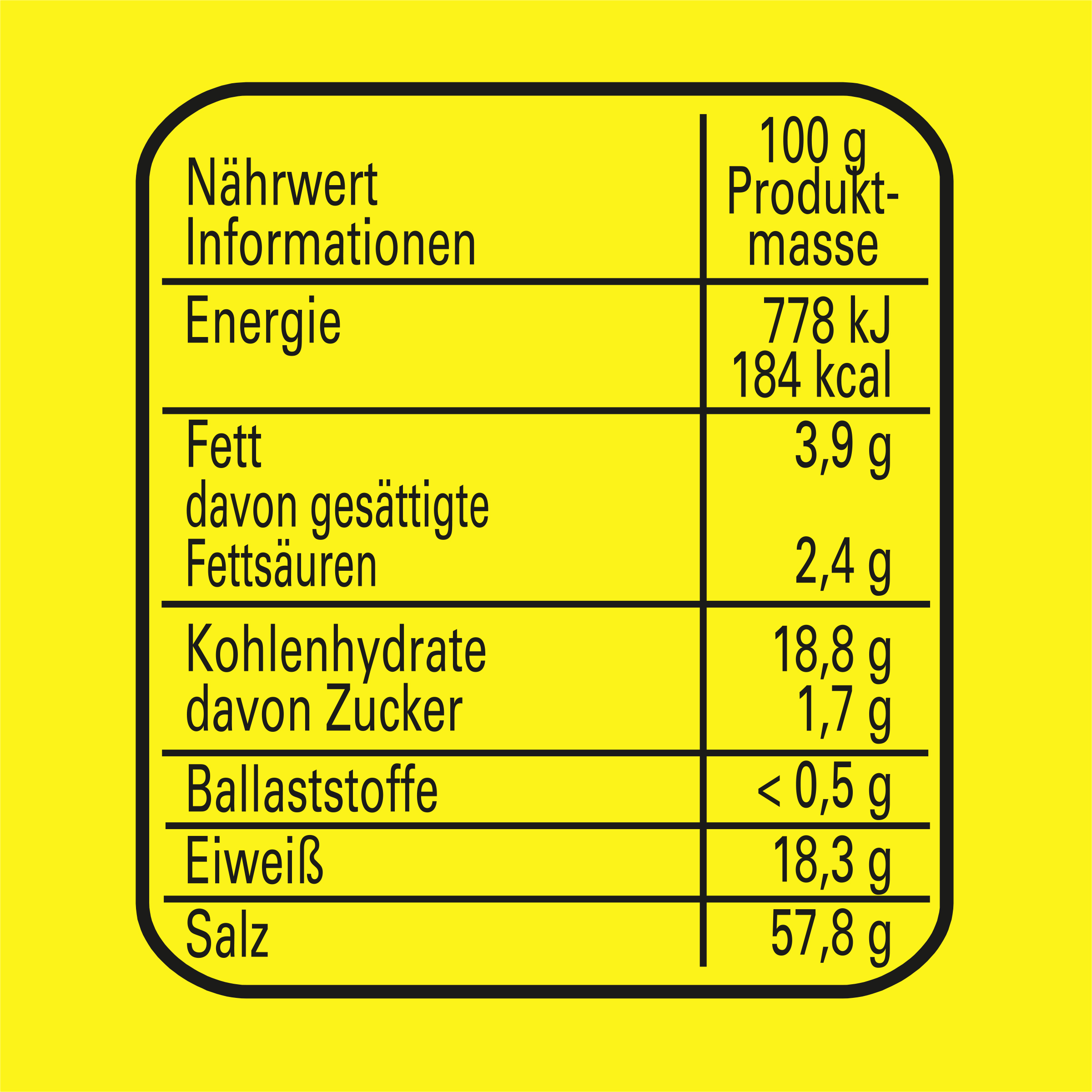 | 1. Nährwerte >>> | Zubereitungsgrad Bezugsgröße Portionsgröße Portionsgröße Beschreibung Tagesdosis Referenzwert Nährstoff: Teil von… Messgenauigkeit Nährwert % Messgenauigkeit % Referenzmenge UNPREPARED100GRMENER-EnergieAPPROXIMATELY778kJ UNPREPARED100GRMENER-EnergieAPPROXIMATELY184kCal UNPREPARED100GRMFATFettAPPROXIMATELY3.9g UNPREPARED100GRMFASATFett, davon gesättigte FettsäurenAPPROXIMATELY2.4g UNPREPARED100GRMCHOAVLKohlenhydrateAPPROXIMATELY18.8g UNPREPARED100GRMSUGAR-Kohlenhydrate, davon ZuckerAPPROXIMATELY1.7g UNPREPARED100GRMFIBTGBallaststoffeLESS_THAN0.5g UNPREPARED100GRMPRO-EiweißAPPROXIMATELY18.3g UNPREPARED100GRMSALTEQSalz ÄquivalentAPPROXIMATELY57.8g |